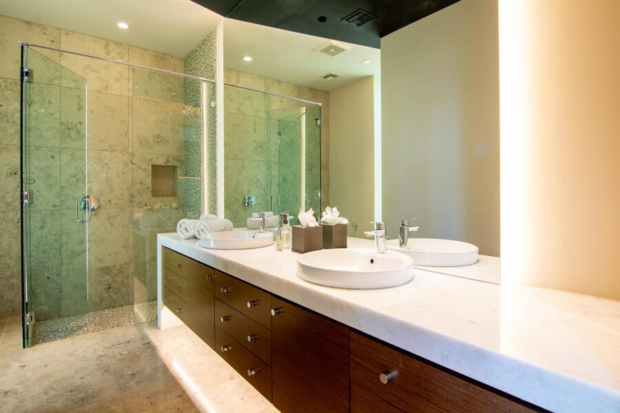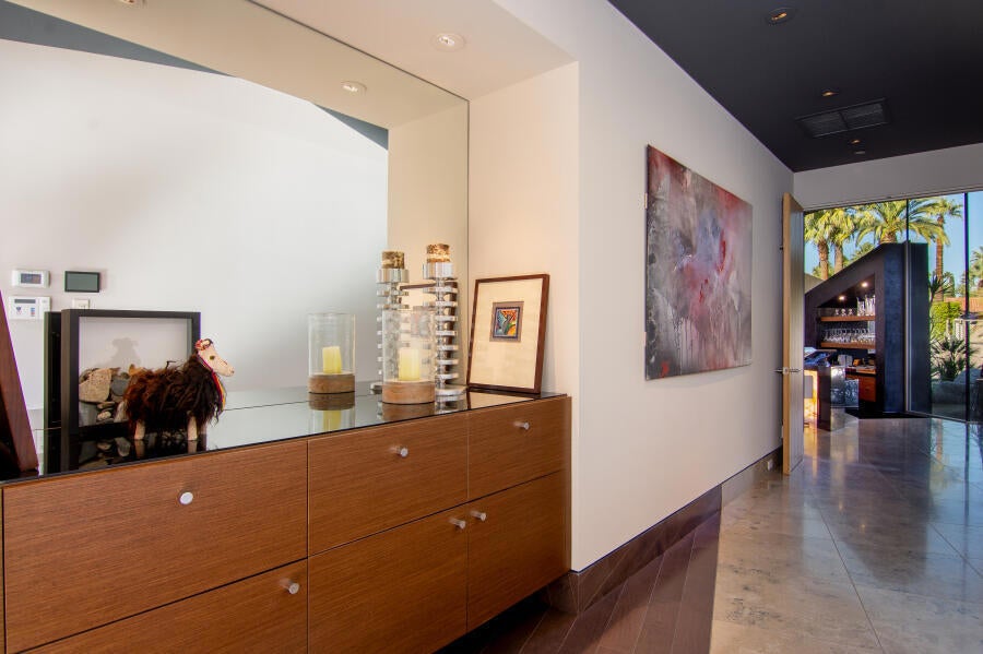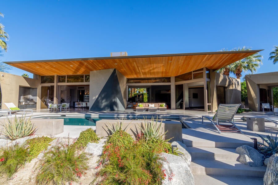 One of the rare newer custom residences completed in 2017 within one of Palm Springs' oldest and most storied neighborhoods, 740 N Prescott is an unapologetically exuberant architectural statement that masterfully balances grandeur with warmth. Designed for a showcase of your personal art and through a long and deliberate collaboration between visionary clients and renowned architect Narendra Patel of Patel Architecture, Inc., this extraordinary estate is a stunning expression of indigenous materials, natural light, and thoughtful modern design.The home's defining feature is its dramatic floating roof--a soaring canopy that appears to hover above the residence, framing breathtaking views of Mt. San Jacinto while creating a captivating sense of spatial ambiguity. Sculptural, tectonic-inspired forms shape the underside of the roof, which discreetly conceals the home's lighting and mechanical systems, preserving clean architectural lines throughout. Inside, refined materials and impeccable craftsmanship define every space. Limestone and hardwood floors, Venetian plaster walls, 9-foot solid wood doors, and a sleek gas fireplace set a tone of understated luxury. The custom Italian Valcucine kitchen from Milan anchors the home with recycled wood cabinetry, Miele appliances, dual dishwashers, dual wine refrigerators, steam oven, built-in coffee system, walk-in pantry, and water softener system--perfectly suited for both everyday living and elevated entertaining.Designed for seamless indoor-outdoor living, the home features automated windows and motorized blinds in key living spaces and bedrooms, opening to a new pool deck and saltwater pool. Entertaining is elevated further by the iconic sunken onyx bar--The Sinatra Bar--complete with its own powder room and dramatic design flair.The primary suite is a private sanctuary featuring dual vanities, soaking tub, sunken shower, and limestone floors. Three additional guest suites offer bespoke finishes including onyx and Italian sinks, walk-in closets, automated blinds, and designer-tiled baths. A separate 383 sq. ft. casita provides exceptional flexibility with a full kitchenette, marble counters, dual-vanity bath, and tile shower.Additional features include a California red cedar roof, three HVAC systems, a mini-split in the garage, fire sprinkler system, service entry, smart home integration, marble laundry room, six-camera security system and large 3 car garage.