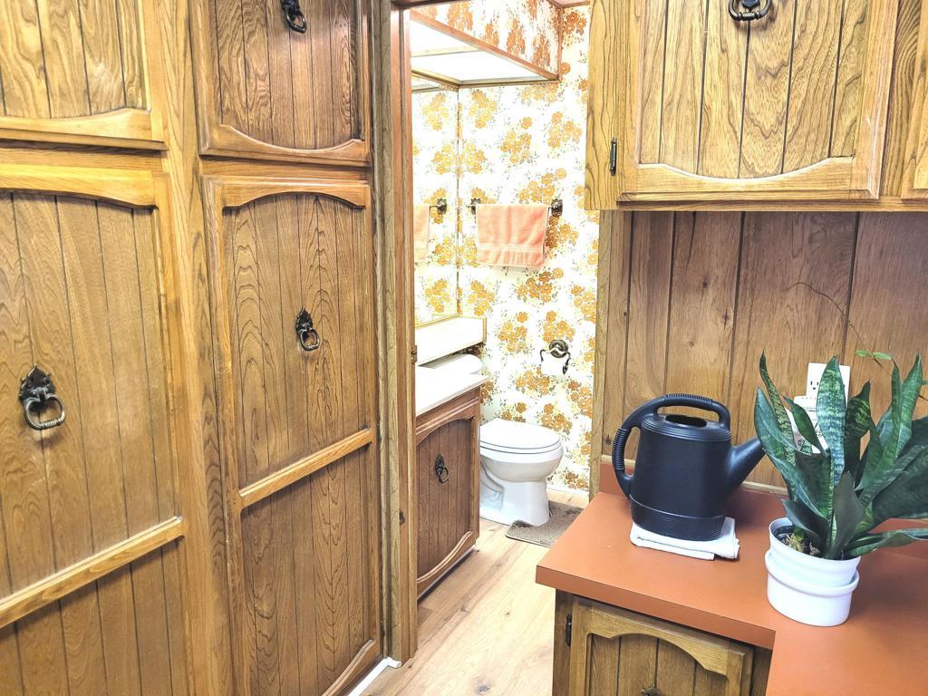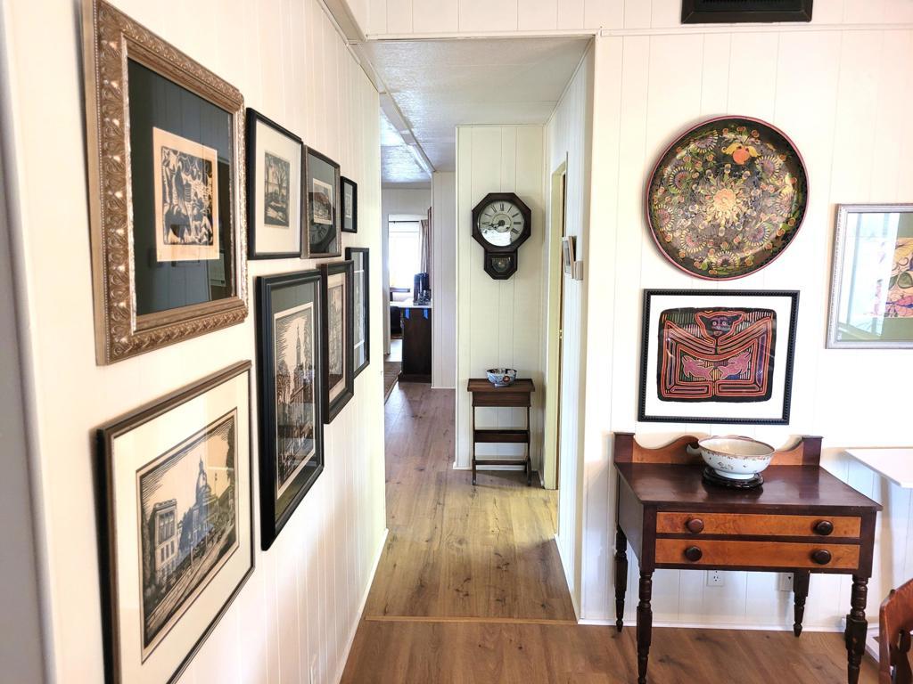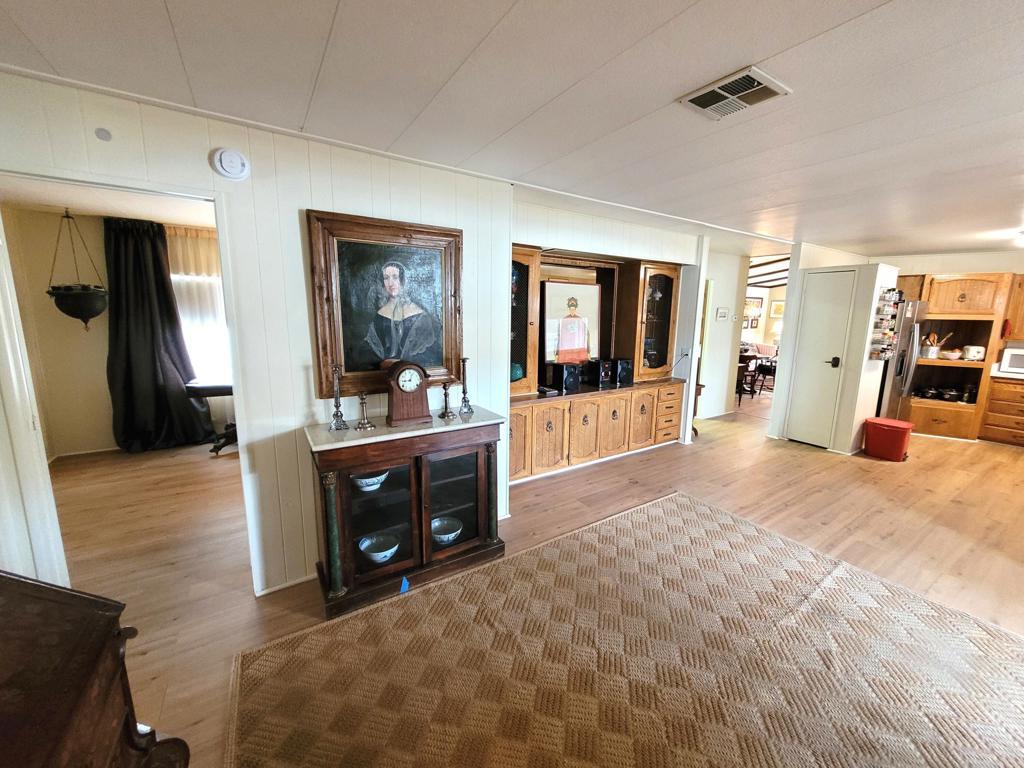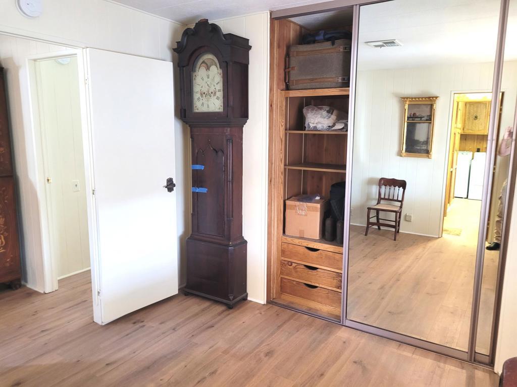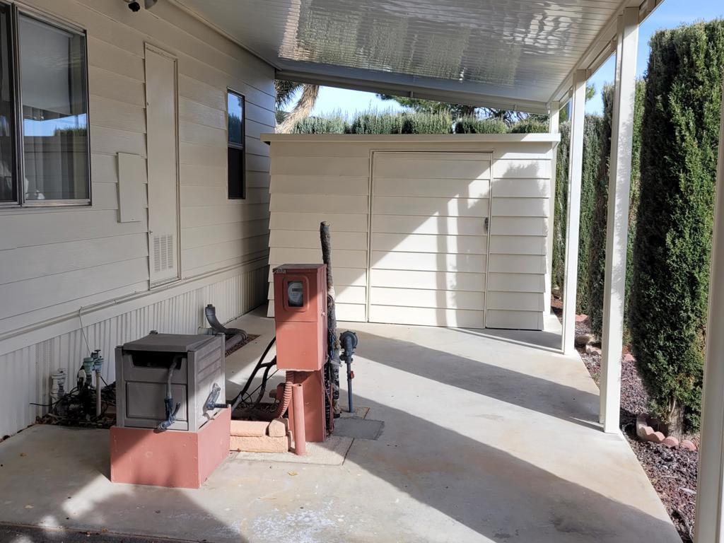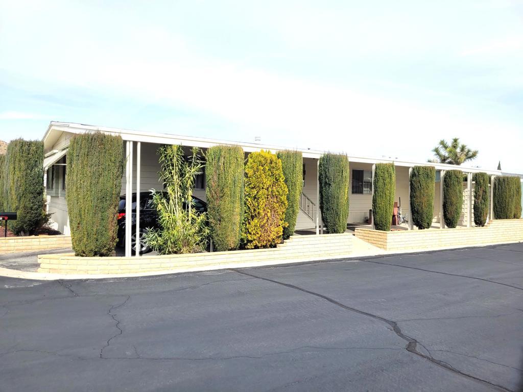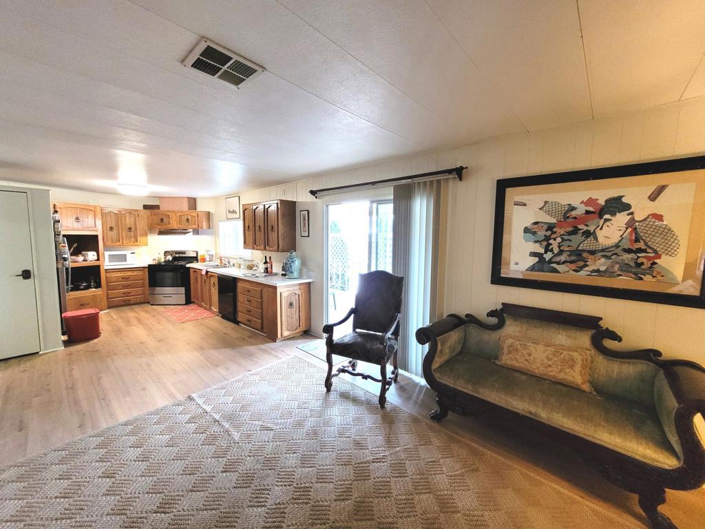 This 1977 triple-wide mobile home by Lancer, with 1590 square feet, has been beautifully updated and modernized. Improvements made in Fall 2024 include new laminate flooring throughout, a new HVAC system, a new roof, new stainless steel appliances in the kitchen as well as new countertops and sink, and fresh paint throughout, both exterior and interior. Entry to the home, through the newly carpeted west-facing deck with mountain views, leads into large and bright living room and adjacent dining area. A short hallway leads to the kitchen and spacious family room with sliders out to the deck. Opposite is the laundry room with full-size W / D and utility sink. The guest bath is accessed via the laundry and the adjacent guest bedroom has a reach-in closet with useful built-in storage. The primary bedroom, at the rear of the home, is spacious and light, also has a reach-in closet with built-in storage; the ensuite primary bath has a lovely vanity and garden tub with a door to the separate commode and shower stall. Access to the large additional room on the west side of the home is through a door at the end of the front deck; this room, currently used as storage, has a utility sink and is fully vented for A/C and heat. There is a large outdoor storage shed on the premises, parking is tandem under the carport on the east side of the home. Space rent for the new owner of this gracious residence will be $750 per month; park approval is required to complete any purchase.