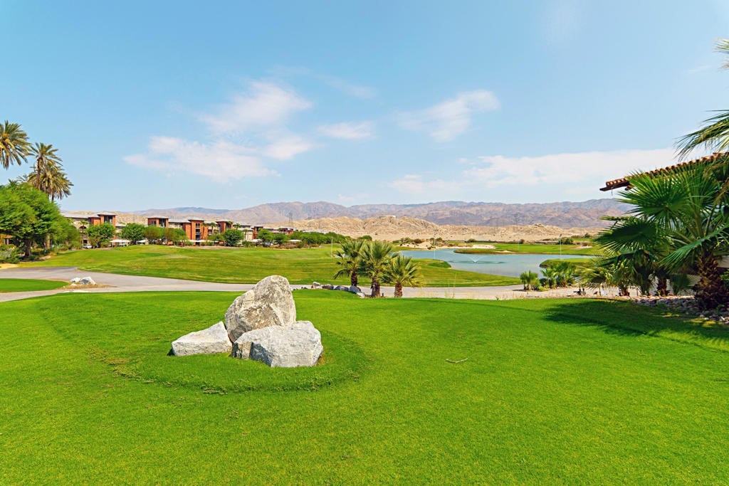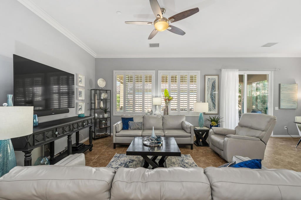 Welcome to a home where effortless living and meticulous attention to detail create a true desert sanctuary. From the moment you arrive, the curb appeal sets the tone: a beautiful treed canopy frames the property, shading a hybrid desert-scape accented with lush artificial turf and thoughtfully curated plantings.Step through the custom front door and feel the warmth and refinement unfold seamlessly. This 2 bedroom + den (easily converted to a third bedroom), 2 bath home spans 1,910 sq. ft. and has been crafted with care in every corner. Tile flooring guides you throughout the home, while high ceilings, crown molding, and plantation shutters throughout enhance the space and sophistication. Soft, calming colors wrap each room in a welcoming embrace.The great room is the heart of the home -- intimate enough for quiet evenings, yet generous enough for entertaining. The kitchen is perfectly designed for everyday living and gatherings alike, featuring abundant cabinetry, spacious countertops, a large walk-in pantry, and an oversized island where friends and family naturally gather.Step outside and the feeling of serenity continues. An oversized covered patio overlooks the lush, private backyard, where the gentle pitter-patter of a tranquil fountain reminds you that life is good and peace is here.Off a short hallway, the primary bedroom is a perfect place to unwind and recharge, with a bath boasting dual vanities, a separate shower and soaking tub, and a large walk-in closet.With plenty of storage, including an additional room for your private treasures or perhaps a crafting place and the 2 car attached garage, you can elevate your comfort, ease and livability, life here is simple, enjoyable and feels complete the moment you arrive.Located in the vibrant 55+ community of Four Seasons at Terra Lago, residents enjoy a large clubhouse, fitness center, indoor and outdoor pools, library, bocce ball, tennis, and a variety of clubs and activities. Just minutes from dining, shopping, and Fantasy Springs & Spotlight 29 Casinos, this home blends comfort, convenience, and the best of desert living.