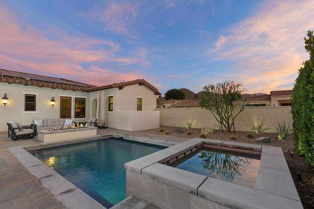 Welcome to The Province, an exclusive gated enclave in the heart of Indian Wells, where modern desert living reaches its finest expression. This stunning 3-bedroom, 5-bathroom residence exemplifies elevated luxury and thoughtful design throughout.Step inside to a spacious open-concept floor plan crafted for effortless entertaining. The expansive great room flows seamlessly into the dining and living areas, complemented by a wet bar that opens directly to the outdoors creating a true indoor-outdoor living experience.The gourmet kitchen is a true showpiece, featuring quartz countertops with a designer tile backsplash, an oversized quartz island adorned with custom pendant lighting, abundant cabinetry, stainless steel appliances including a Wolf six-burner range, subzero refrigerators, 2 dishwashers, walk-in pantry, and under-cabinet lighting ideal for both the dedicated chef or entertainer.The primary suite offers a serene retreat with direct outdoor access and generous custom cabinetry. The spa-inspired bathroom boasts a quartz double vanity, an expansive tiled shower, and a luxurious soaking tub designed for ultimate relaxation. A custom-designed closet adds both elegance and functionality.An additional room, currently used as an office/game room, features built-in custom cabinetry and private outdoor access perfect as a home office, additional dining space, or flexible living area. One guest bedroom functions beautifully as an attached casita with its own exterior entrance and full bathroom, offering privacy for guests.Professionally decorated with a modern, tasteful touch, this home reflects true pride of ownership throughout only lived in part time.Outside, your private desert oasis awaits. The south-facing yard is designed for year-round enjoyment and includes a sparkling saltwater pool and spa with a cascading waterfall, an outdoor bathroom, and breathtaking mountain views. A custom built-in BBQ area creates the perfect setting for outdoor dining, while the fire pit sets the stage for cozy evenings under the stars.Additional upgrades include owned solar panels, an upgraded sound system, custom tile flooring, automatic blinds, a tankless water heater, a two-zone HVAC system, and an epoxy-finished garage floor with extensive storage.This exceptional residence is a must-see, offering the finest in elevated desert living. Plus as an Indian Wells resident you'll enjoy discounted golf and dining. A must see!