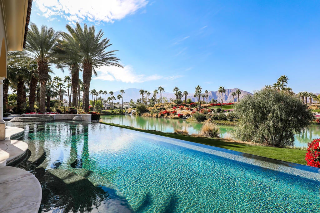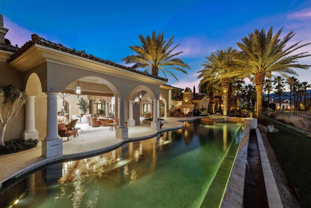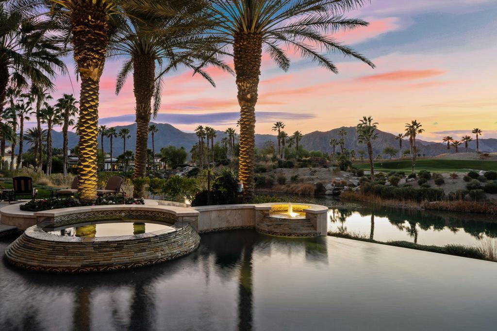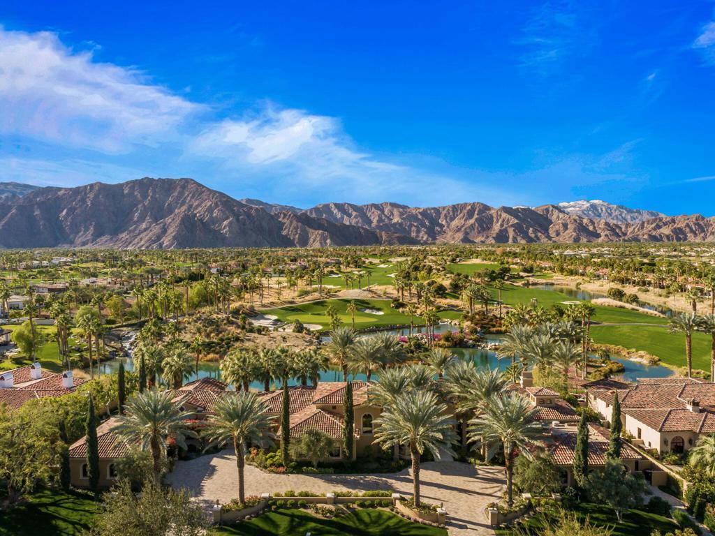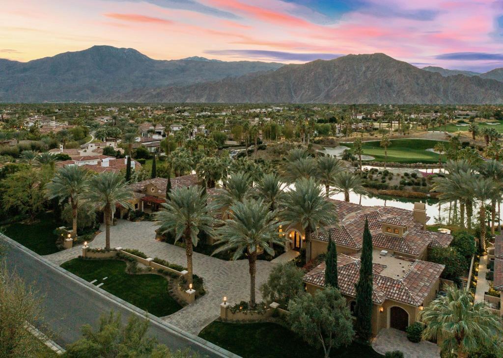 Gracefully Positioned on Two Premium Parcels, this Elegant Mediterranean Estate Showcases the most Expansive and Dramatic View Frontage in the Hideaway. The Resort Style Grounds with Splendid Infinity Edged Pool overlook the Signature Clive Clark 7th Green. Lakes, Waterfalls and the Majestic Santa Rosa Mountain Range Resting in the Backdrop Create a Natural Work of Art that Accentuates the Value and Rarity of this Property. Resting atop the gracious 36,000 sq. ft. Lot this 8,500 sq. ft. Estate offers 5 Bedroom Suites and 7 Baths. Breathtaking Views await as you enter the Grand Foyer. Moroccan Style Archways, Coffered and Beamed Ceilings and Marble Floors Exude Timeless Elegance as you Experience this Grand Home. Elegant Great Room with Marble Fireplace, Custom Bar, Gourmet Kitchen, Wine Salon with 600 Bottle Cellar, Formal Dining Room, Breakfast Room, and Three Spacious Bedrooms each with En-suite Bath in Main Part of Home. Primary Suite is a Private Sanctuary Complete with Spa like Bathroom and Private Sitting Area. Two Bedroom Guest House with Kitchen, Great Room and Patio. Control 4 Automation throughout. Lush Exterior Grounds adorned with Citrus, Vibrant Bougainvillea, Fire Features, Artificial Turf Sport Court, Pool, Spa, Fountains, Fine Hardscape and Impeccably Manicured Landscape. Offered Furnished.