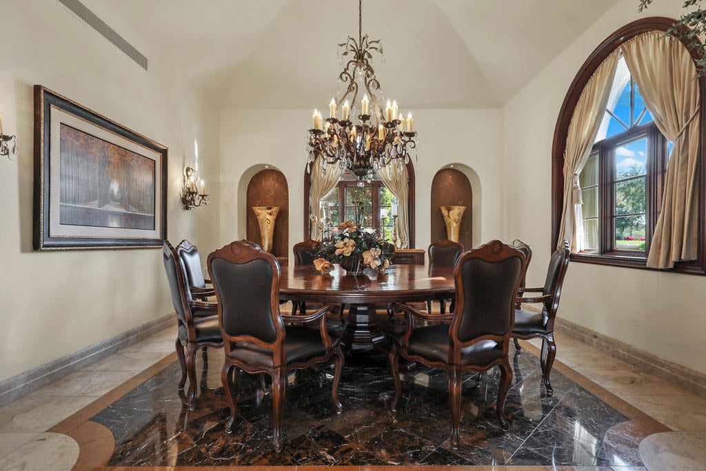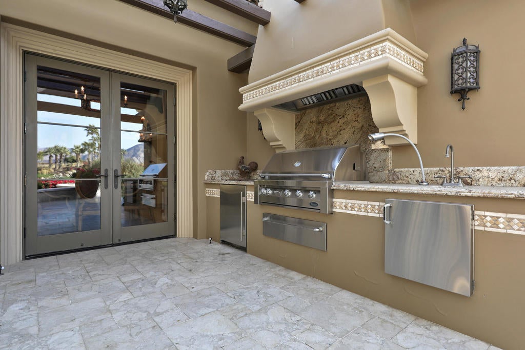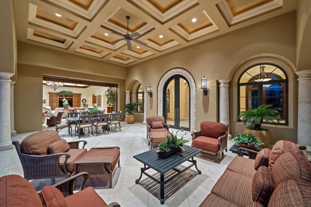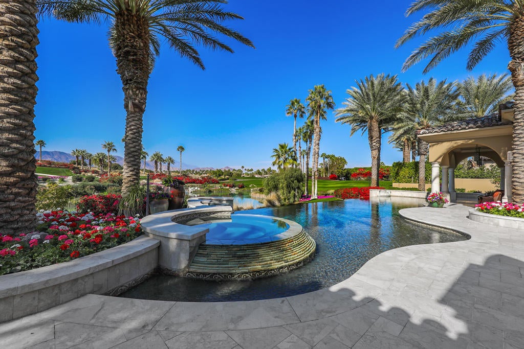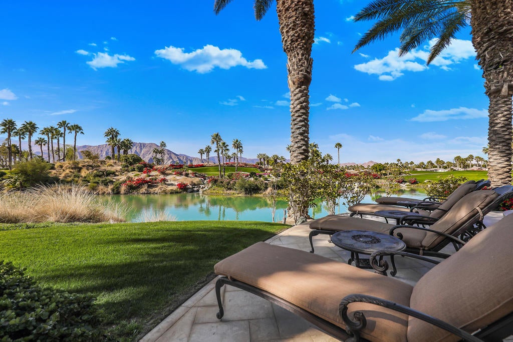 Gracefully Positioned on Two Premium Parcels, this Elegant Mediterranean Estate Showcases the most Expansive and Dramatic View Frontage in the Hideaway. The Resort Style Grounds with Splendid Infinity Edged Pool overlook the Signature Clive Clark 7th Green. Lakes, Waterfalls and the Majestic Santa Rosa Mountain Range Resting in the Backdrop Create a Natural Work of Art that Accentuates the Value and Rarity of this Property. Resting atop the gracious 36,000 sq. ft. Lot this 8,500 sq. ft. Estate offers 5 Bedroom Suites and 7 Baths. Breathtaking Views await as you enter the Grand Foyer. Moroccan Style Archways, Coffered and Beamed Ceilings and Marble Floors Exude Timeless Elegance as you Experience this Grand Home. Elegant Great Room with Marble Fireplace, Custom Bar, Gourmet Kitchen, Wine Salon with 600 Bottle Cellar, Formal Dining Room, Breakfast Room, and Three Spacious Bedrooms each with En-suite Bath in Main Part of Home. Primary Suite is a Private Sanctuary Complete with Spa like Bathroom and Private Sitting Area. Two Bedroom Guest House with Kitchen, Great Room and Patio. Control 4 Automation throughout. Lush Exterior Grounds adorned with Citrus, Vibrant Bougainvillea, Fire Features, Artificial Turf Sport Court, Pool, Spa, Fountains, Fine Hardscape and Impeccably Manicured Landscape. Offered Furnished.