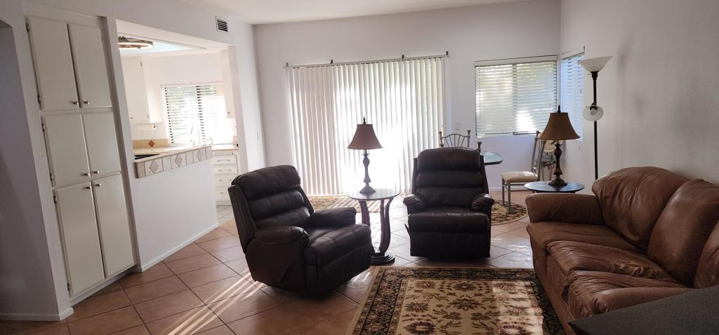 JUST LISTED!! AVAILABLE JANUARY 1. FURNISHED 2BR 2BA condo. PUBLISHED PRICE OF $2400 IS FOR A 1-YEAR LEASE. ALSO AVAILABLE JAN-APRIL 2026 AS A SEASONAL RENTAL AT $4200/MO. Large central living area opens to large patio facing Southeast, the golf course, overlooking the fairway and lake at the Lagos #2 golf hole. 9 foot ceilings. Freshly painted. Located just steps from your own semi-private pool and spa. Includes 1-car garage and golf cart parking spot. Tenant pays utilities, but Spectrum CATV, internet and wifi is included, as is full access to resort amenities, country club, fitness center, tennis and golf (green fees are extra). Desert Princess Palm Springs is a luxurious resort close to freeway, downtown Palm Springs and Palm Desert.