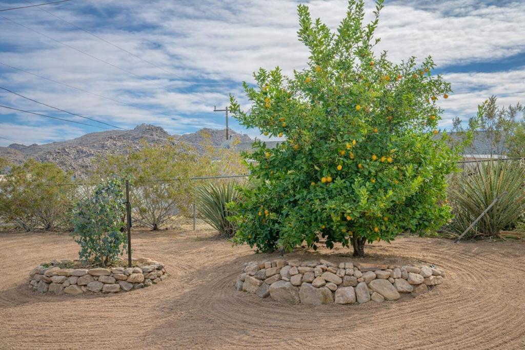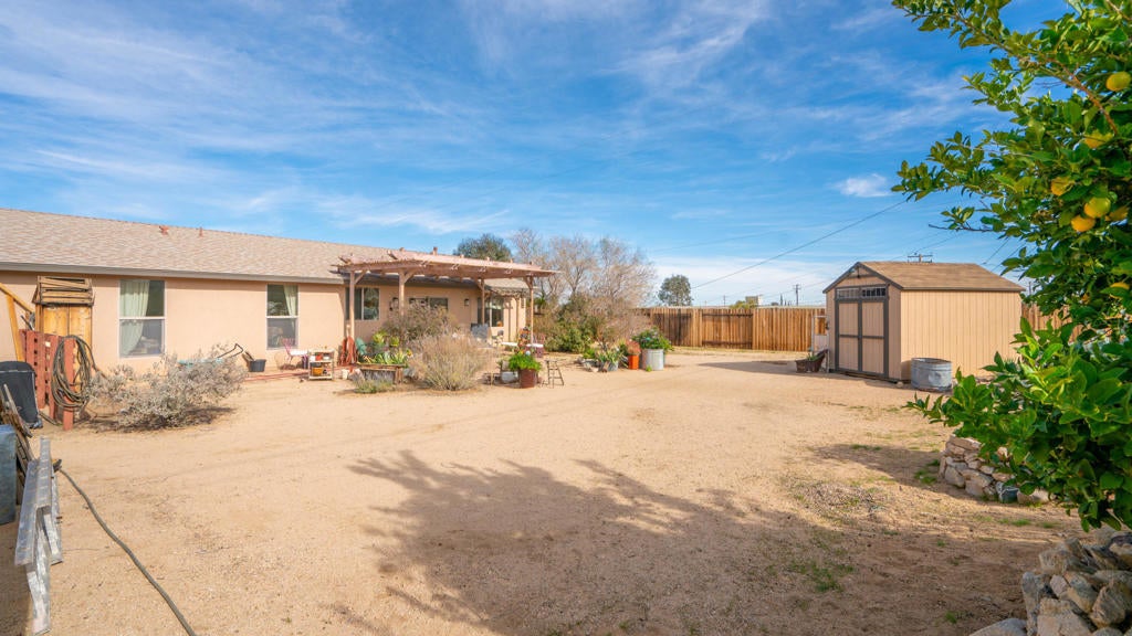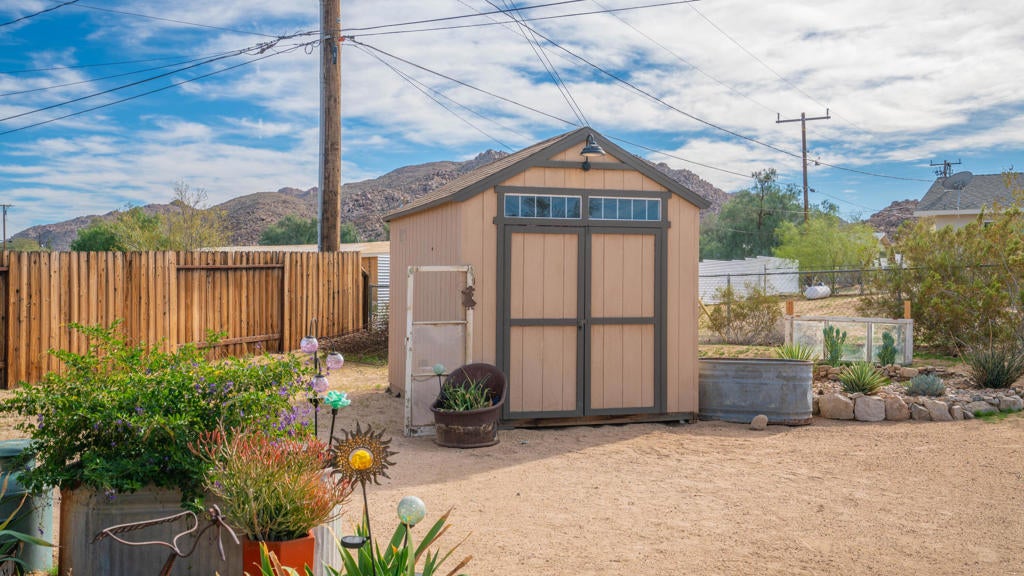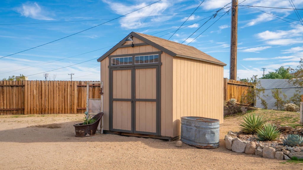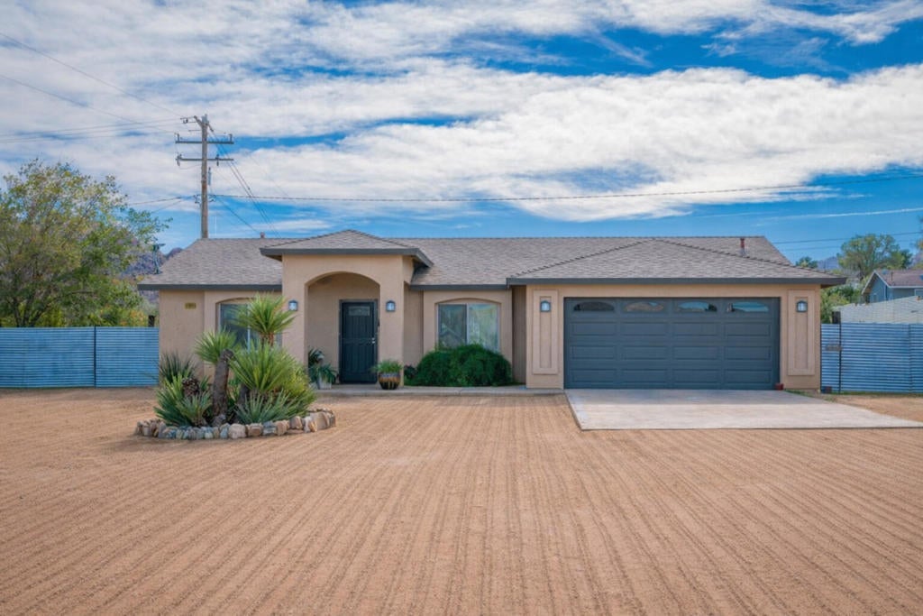 Beautifully appointed Tuscan-inspired 3-bedroom, 2-bath residence offering a bright, open floor plan filled with abundant natural light, ideally situated on an extra-large lot in the heart of Joshua Tree, just a short walk to downtown Joshua Tree Village. Located in a quiet, desirable neighborhood, this thoughtfully designed split-bedroom layout provides both privacy and functionality. From the moment you step through the front doors, the home feels warm, inviting, and welcoming, reflecting timeless Tuscan character blended with desert charm.The home features a grand exterior entry and showcases vaulted ceilings, elegant barrel rolls, bullnosed walls throughout, ceiling fans, and a built-in entertainment niche, creating a comfortable and refined living environment.The spacious primary suite includes a customized walk-in closet and an en-suite bathroom with dual sinks. The well-appointed kitchen highlights Tuscan stone tile countertops, porcelain tile flooring, a pantry, and a breakfast bar--ideal for both everyday living and entertaining. The guest bathroom is finished with Corian countertops, and dual-pane windows throughout enhance energy efficiency and year-round comfort.Additional features include natural gas heating, central air conditioning, and an oversized, fully finished two-car garage. The backyard offers a concrete patio with pergola just off the kitchen, mature landscaping with fruit trees, scenic views of surrounding rock formations, and a detached 8 ft x 12 ft insulated storage shed, perfect for additional storage or workspace. Exterior improvements include a concrete driveway, walkway, and patio, while the open interior layout maximizes natural light and livability.Enjoy exceptional stargazing from your own backyard--one of the true hallmarks of the Joshua Tree lifestyle.Buyer to independently investigate and verify all information, including but not limited to square footage, lot size, permits, zoning, utilities, property condition, and intended use. Listing agent and broker make no representations or warranties regarding the accuracy of information provided. Buyer is advised to rely on their own investigations and inspections.