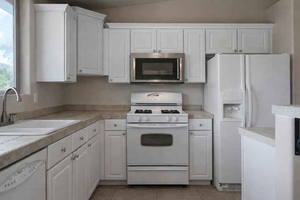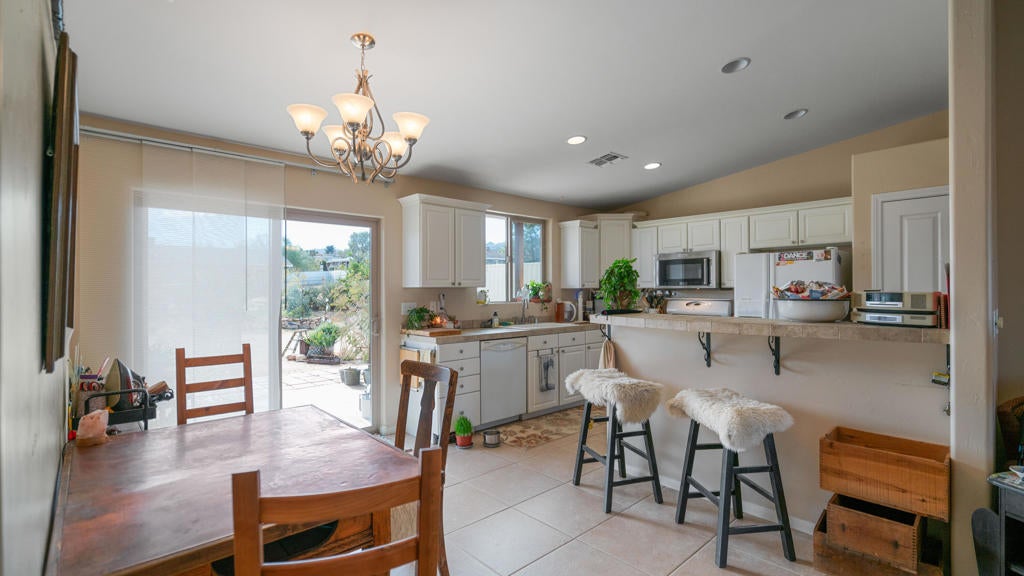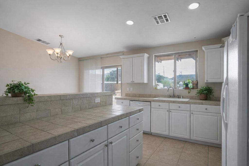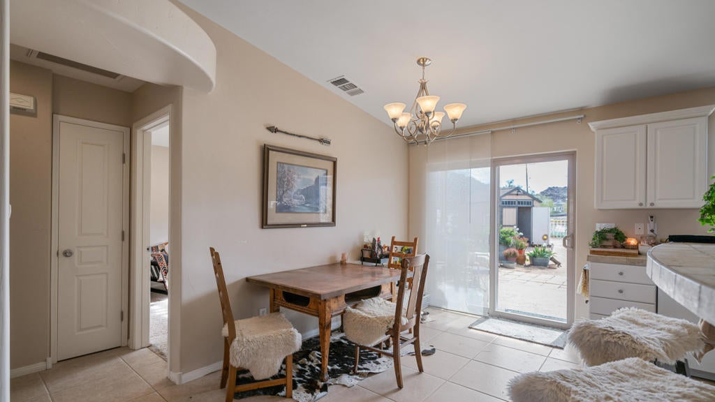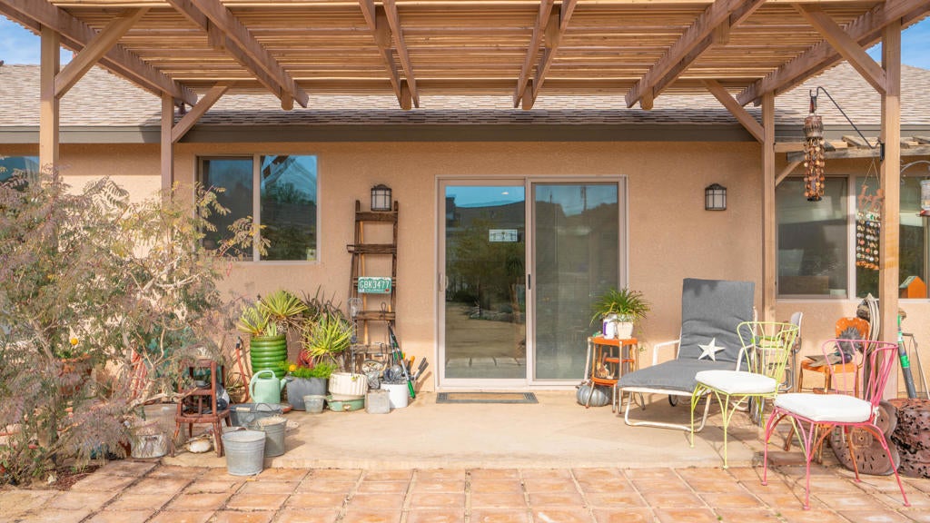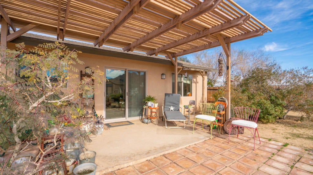 Beautifully appointed Tuscan-inspired 3-bedroom, 2-bath residence offering a bright, open floor plan filled with abundant natural light, ideally situated on an extra-large lot in the heart of Joshua Tree, just a short walk to downtown Joshua Tree Village. Located in a quiet, desirable neighborhood, this thoughtfully designed split-bedroom layout provides both privacy and functionality. From the moment you step through the front doors, the home feels warm, inviting, and welcoming, reflecting timeless Tuscan character blended with desert charm.The home features a grand exterior entry and showcases vaulted ceilings, elegant barrel rolls, bullnosed walls throughout, ceiling fans, and a built-in entertainment niche, creating a comfortable and refined living environment.The spacious primary suite includes a customized walk-in closet and an en-suite bathroom with dual sinks. The well-appointed kitchen highlights Tuscan stone tile countertops, porcelain tile flooring, a pantry, and a breakfast bar--ideal for both everyday living and entertaining. The guest bathroom is finished with Corian countertops, and dual-pane windows throughout enhance energy efficiency and year-round comfort.Additional features include natural gas heating, central air conditioning, and an oversized, fully finished two-car garage. The backyard offers a concrete patio with pergola just off the kitchen, mature landscaping with fruit trees, scenic views of surrounding rock formations, and a detached 8 ft x 12 ft insulated storage shed, perfect for additional storage or workspace. Exterior improvements include a concrete driveway, walkway, and patio, while the open interior layout maximizes natural light and livability.Enjoy exceptional stargazing from your own backyard--one of the true hallmarks of the Joshua Tree lifestyle.Buyer to independently investigate and verify all information, including but not limited to square footage, lot size, permits, zoning, utilities, property condition, and intended use. Listing agent and broker make no representations or warranties regarding the accuracy of information provided. Buyer is advised to rely on their own investigations and inspections.