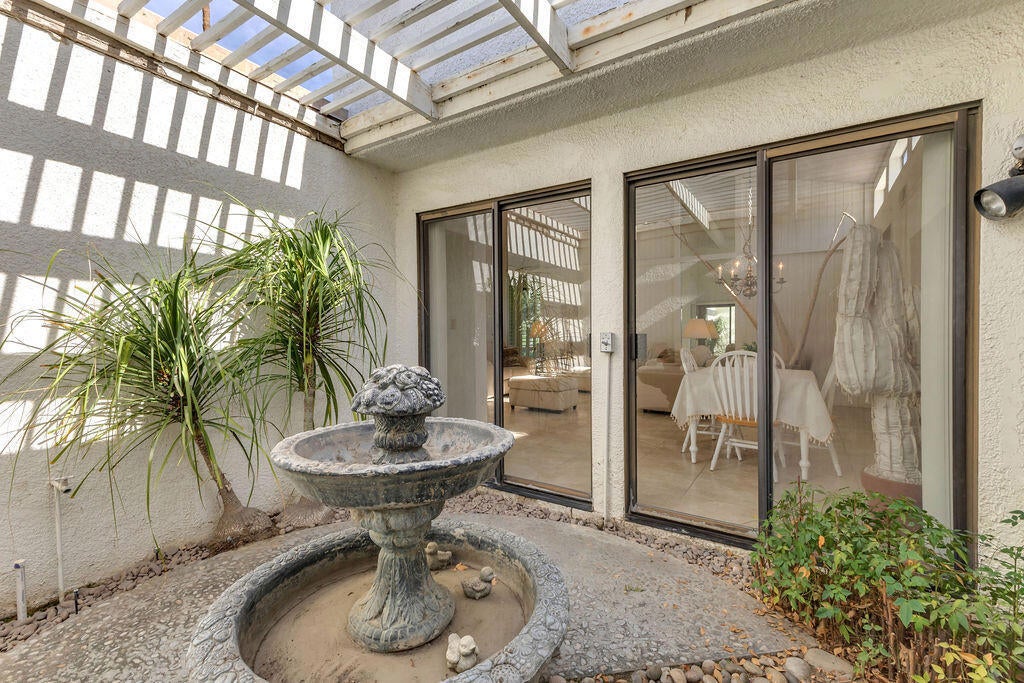 An excellent opportunity to make this condo your own, choosing your preferred finishes and quality rather than inheriting someone else's design choices. The home is ready for renovation. Located on the preferred side of Rancho Las Palmas Country Club, this property offers reliable access through the main Bob Hope gate with no concern for El Toro Wash closures. Just steps from the clubhouse, this desirable 200 plan features 1,381 square feet with vaulted ceilings and a light filled layout. The central atrium is ready for updating and could be reimagined as additional living space or a flexible room. The floor plan includes 2 bedrooms, 2 bathrooms, a 2 car garage, and a 2 car driveway. HOA includes cable TV, internet, trash, landscaping, exterior maintenance, security, and access to community pools and spas within this guard gated community. Ideally located near The River for dining and shopping, with discounted access to the Omni Rancho Las Palmas Resort and Spa, and close to Palm Springs, Palm Desert, El Paseo, Acrisure Arena, and Eisenhower Medical Center. Ready now for its new owner!
