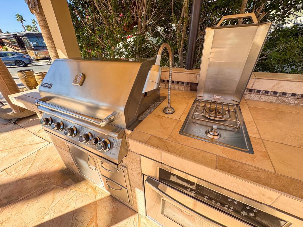 Take a swim and return to your private oasis at luxury RV lot #76. This could be your everyday--a perfect blend of relaxation and outdoor living at Outdoor Resort Indio. Nestled in a quiet and private setting, this beautifully landscaped lot features a resurfaced RV pad and an insulated solid roof pergola that provides plenty of shade and comfort, making it ideal for unwinding or entertaining.The medium-sized kitchen is equipped with stainless appliances, including a built-in BBQ, oven, sink, and under-counter fridge, all in excellent working condition. Enjoy the convenience of hot water, under-counter accent lighting, and thoughtfully arranged furnishings that create a welcoming outdoor space. With lush landscaping, an extra palm tree, and ample privacy, this serene retreat is your perfect getaway or a place to host friends in style. Outdoor Resort Indio is a class A only RV resort.