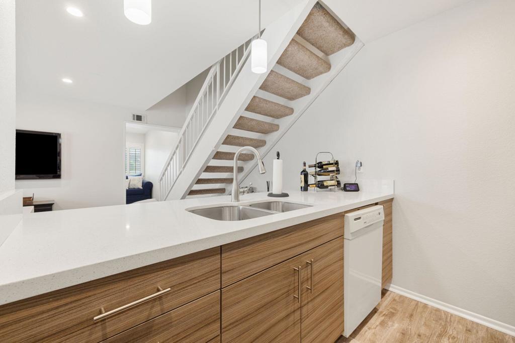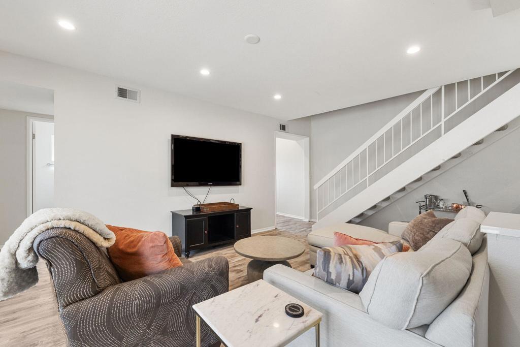 Quietly tucked at the back of gated Portola Del Sol, this light-filled end-unit townhome offers approx. 1,344 sq ft of stylish living with resort-style perks in the heart of Palm Desert. Vaulted ceilings, new LED lighting, fresh neutral paint and plantation shutters frame airy spaces and peek-a-boo mountain views. The updated kitchen features sleek Euro cabinets, quartz counters, mosaic backsplash, stainless appliances, a breakfast bar and open sight lines to the dining and living areas. Upstairs are two roomy bedrooms sharing an elegant 3/4 bath; downstairs, a flexible den/office sits beside another remodeled 3/4 bath and can function as a third bedroom or guest suite. Comfort is boosted by dual-pane windows, newer HVAC, extra storage and an attached two-car garage with laundry. Sliding doors open to an oversized, low-care patio with stamped concrete and gated side access, ideal for entertaining, grilling, pets or play. A low HOA covers cable, high-speed internet, water, trash, exterior paint, roof, plus two pools and spas, tennis, pickleball, greenbelts and guest parking. Minutes to El Paseo, Civic Center Park, McCallum Theatre, College of the Desert and top Desert Sands schools, this home is truly turn-key for full-time use, seasonal enjoyment or investment.