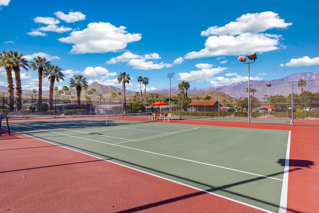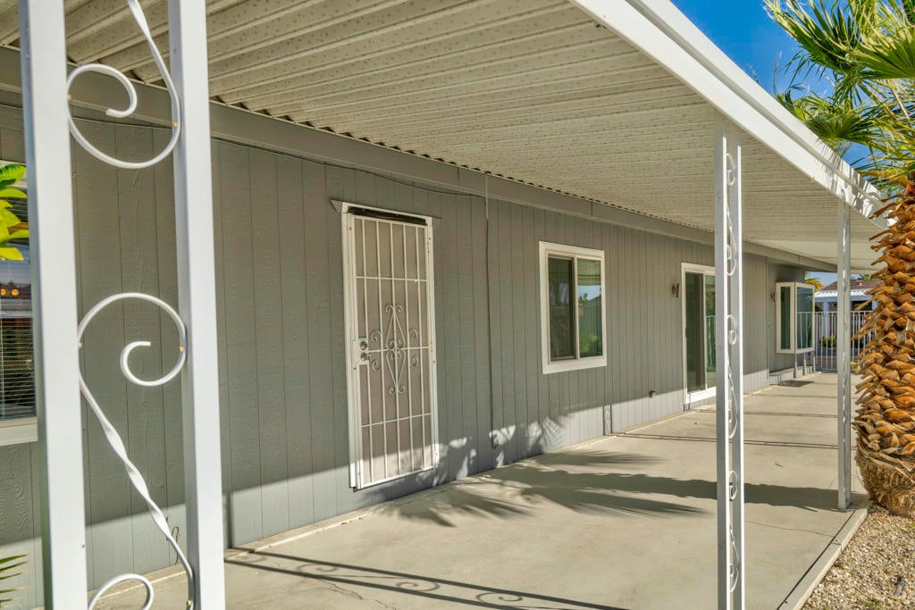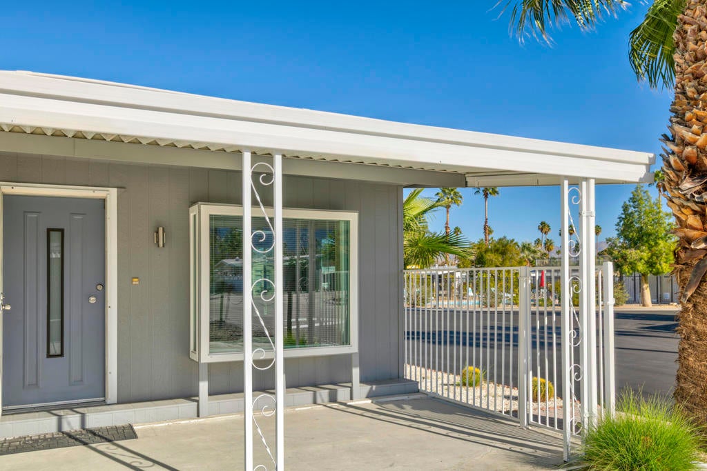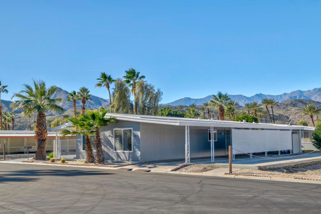 This Light and Bright 2 Bedroom - 2 Bath Home features porcelain tile flooring & fresh interior paint throughout. Enjoy beautiful pool views from the expansive livingroom. Both batrooms are updated with newer showers. Relax under the covered outside seating area and take in the beautiful mountain views with access from living and dining areas, as well as from the large primary bedroom. Laundry room with built in water softener included. The covered carport can accomodate 3 vehicle - Move-in ready! El Dorado Palms Estates is a 55+ gated community where you Own The Land and can enjoy many ammenities including two pools, a spa, three tennis courts, a fitness center and clubhouse, all conveniently located in South Palm Springs near many restaurants as well as shopping at Target and Trader Joe's. Very Low HOA's of $355/mo! This home is a Must See- Tranquil living at it's Best in South Palm Springs!