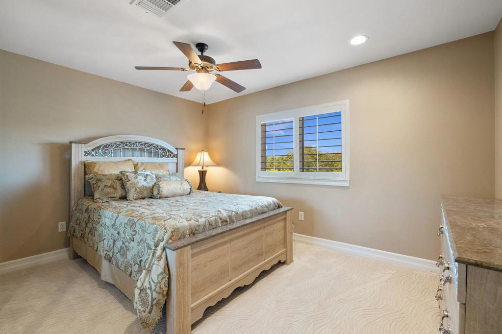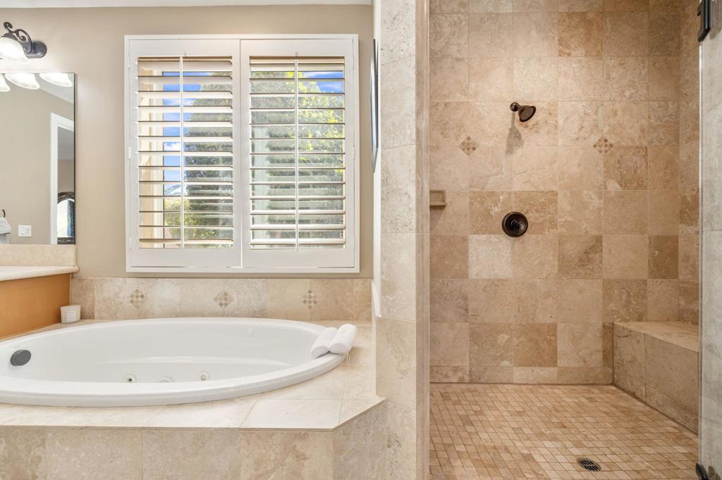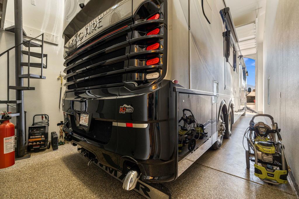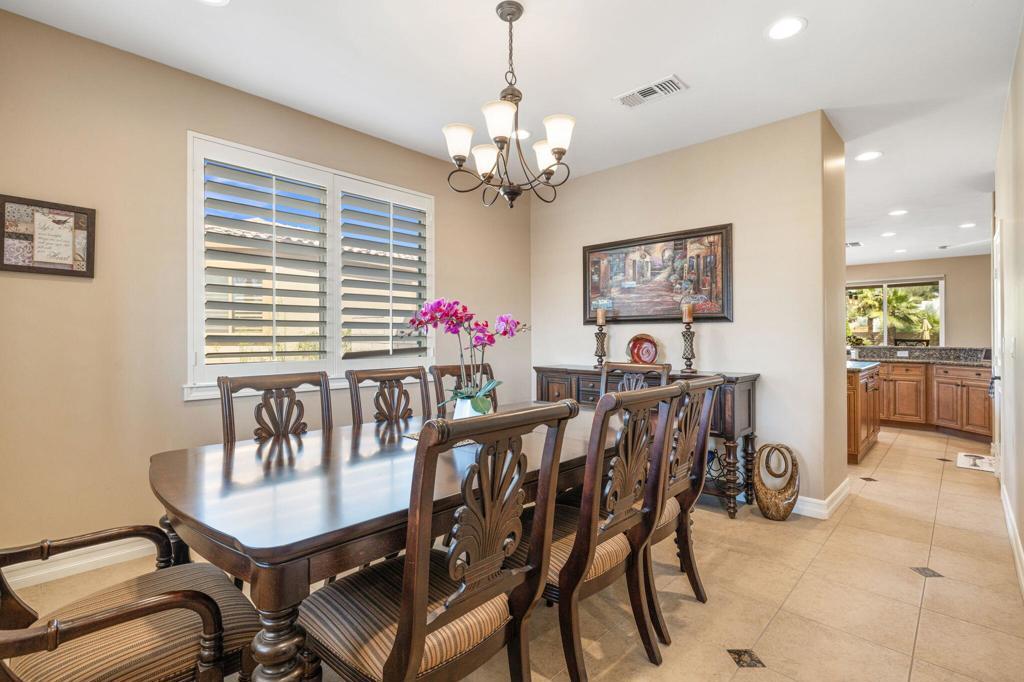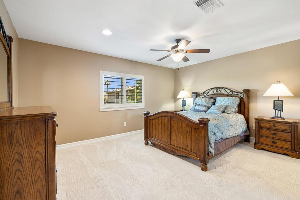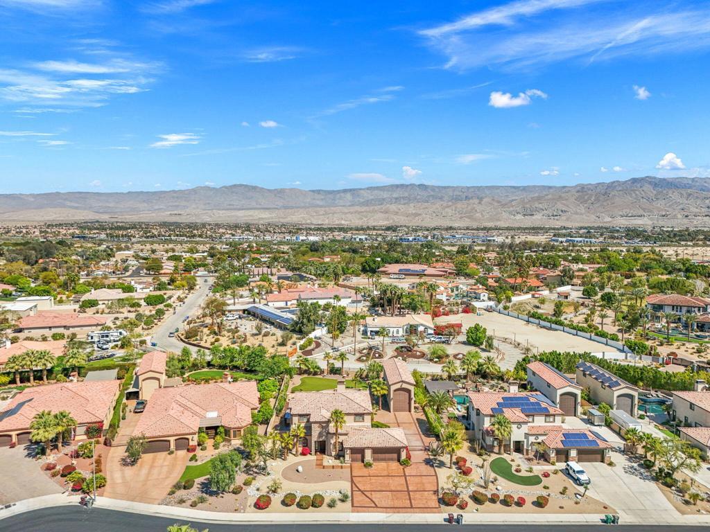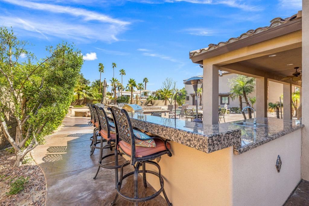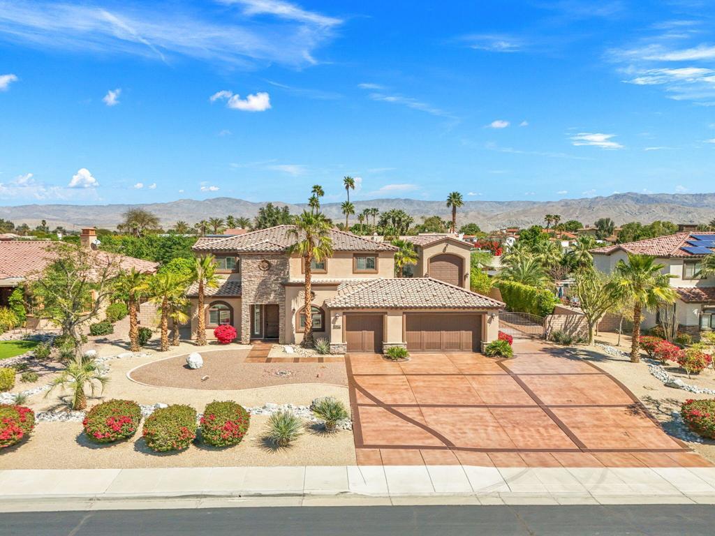 Nestled in an exclusive gated community of just 11 homes, this stunning 6-bedroom, 6-bathroom estate offers a rare blend of luxury, space, and functionality on an over half-acre lot. Designed for those who love to entertain and need room for all their toys, this home boasts an enormous 16' x 56' RV garage complete with a mezzanine, private bathroom, individual A/C, 50 amp and clean out. Plus, the spacious side yard provides even more parking options alongside the 3-car attached garage. Inside, you'll find an elegant layout with a main-floor master suite, formal dining room, dedicated office, and an upstairs bonus room with a dry bar and mini-fridge--perfect for additional entertainment space with upgraded tile flooring and custom plantation shutters throughout. The gourmet eat-in kitchen is a chef's dream, featuring rich wood cabinetry with custom pull-out storage drawers, granite countertops, a built-in stainless steel refrigerator, dual ovens, a gas range, a microwave, and a walk-in pantry. The upstairs is thoughtfully designed with two bedrooms featuring private en-suites on one wing, while the remaining three bedrooms share a spacious bathroom with dual sinks on another. The main-floor master suite offers breathtaking views of the backyard oasis and a luxurious en-suite with dual vanities, a jetted tub, a makeup station, a massive walk-in shower with bench seating, and a huge walk-in closet. Step outside to your private resort-style backyard, complete with a Pebble Tec pool and spa, a built-in gas fire pit, and an expansive outdoor kitchen equipped with granite countertops, gas BBQ, sink, refrigerator, and ample seating--ideal for hosting gatherings. Additional upgrades include newly refreshed stamped concrete throughout front and rear yards and driveway, epoxy-coated garage flooring, and low-maintenance artificial turf. This exceptional home is truly one of a kind--offering the perfect blend of luxury, convenience, and space in a highly desirable Bermuda Dunes location with low HOA, low taxes, IID electric for lower utility costs! 30 day minimum rental. Offered Turn Key furnished.