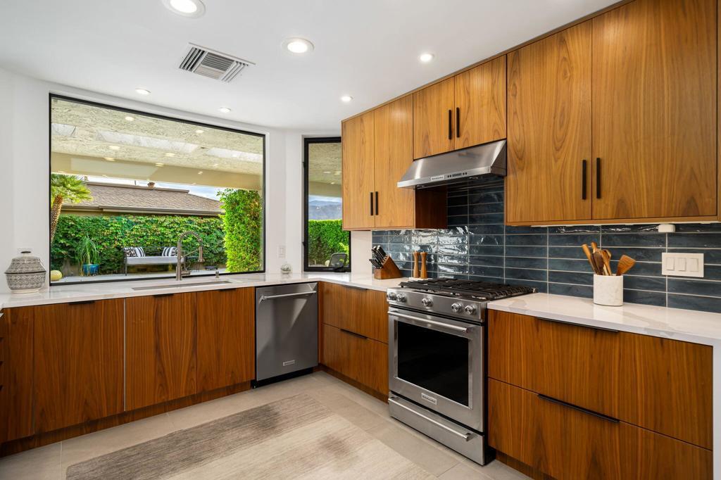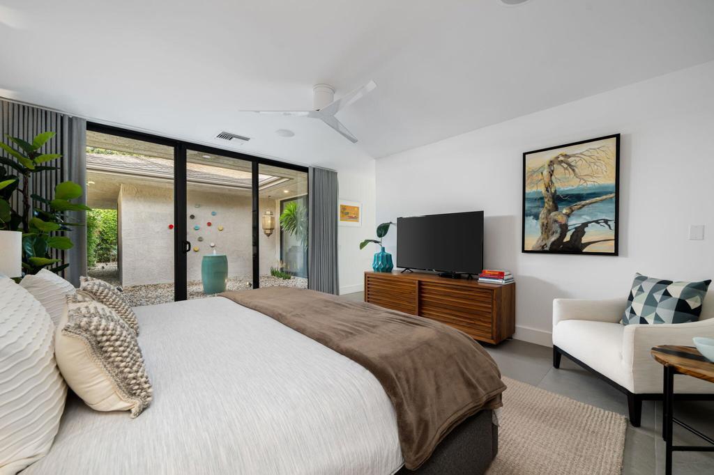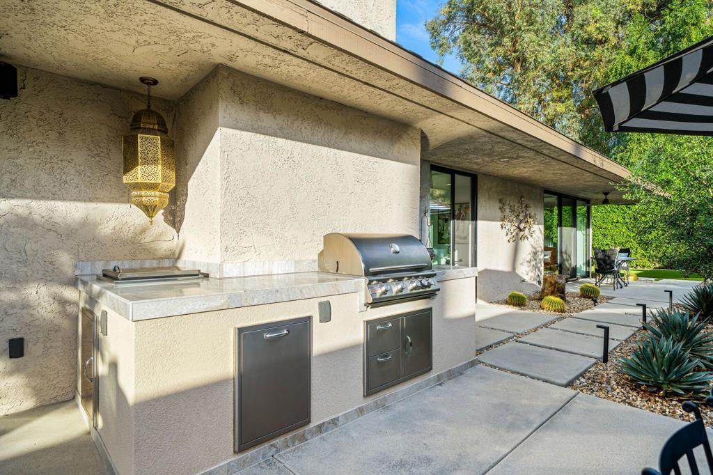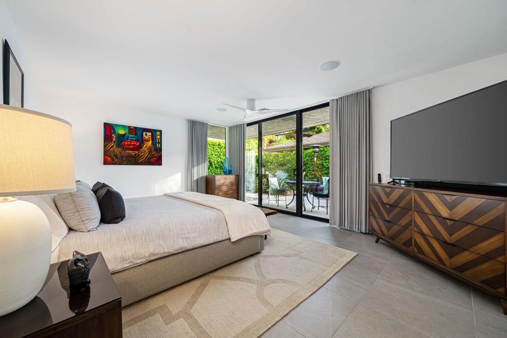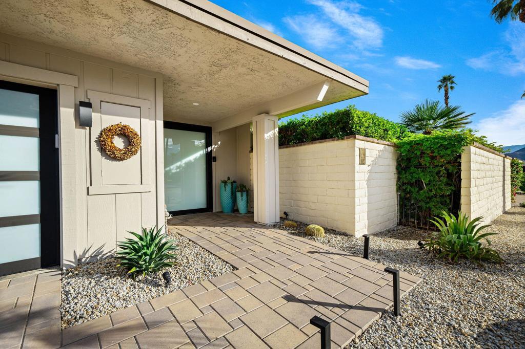 Commanding a rare perimeter position against a golf course, this extraordinary contemporary estate is a private sanctuary defined by unobstructed, cinematic views of the San Jacinto mountain range--a distinction enjoyed by no other home on the street. Completely freestanding and enveloped by mature hedges and perimeter walls, the property delivers a level of privacy, quiet, and exclusivity seldom found. Inside, the home unfolds as a masterclass in modern luxury. Expanses of glass flood the interiors with natural light, blurring the line between indoors and out. Clean architectural lines, elevated finishes, and curated design details create an atmosphere that is both striking and effortlessly livable. The living space centers around a dramatic statement fireplace, anchoring the home with warmth and visual impact while maintaining a flawless contemporary aesthetic.The kitchen is both artful and functional, featuring quartz surfaces, custom grain-matched walnut cabinetry, and a premium appliance suite designed for serious entertaining. Three luxuriously appointed en-suite bedrooms offer hotel-caliber comfort and privacy, each enhanced with sound-dampening construction, custom closets, and spa-inspired bathrooms finished with refined stone, rain showers, and designer fixtures. The primary suite elevates the experience further with an indulgent soaking tub and elevated spa amenities. Outdoors, the residence transforms into a resort-level retreat. A newly redesigned saltwater pool and spa, finished in elegant PebbleTec and controlled via mobile technology, is surrounded by expansive lounging, dining, and entertaining spaces. A custom outdoor kitchen, integrated sound system, exterior quartzite shower, multiple seating zones, and a turf area ideal for bocce ball create a setting equally suited for tranquil mornings or unforgettable evenings under the desert sky. Thoughtful modern infrastructure--including an owned 17+ kW solar system, upgraded electrical and gas capacity, advanced lighting, and refined landscaping--ensures beauty is matched by performance and efficiency. This is more than a home; it is a statement of lifestyle--where architectural intention, location, privacy, and luxury converge in rare harmony. An exceptional offering for those who demand both distinction and discretion.