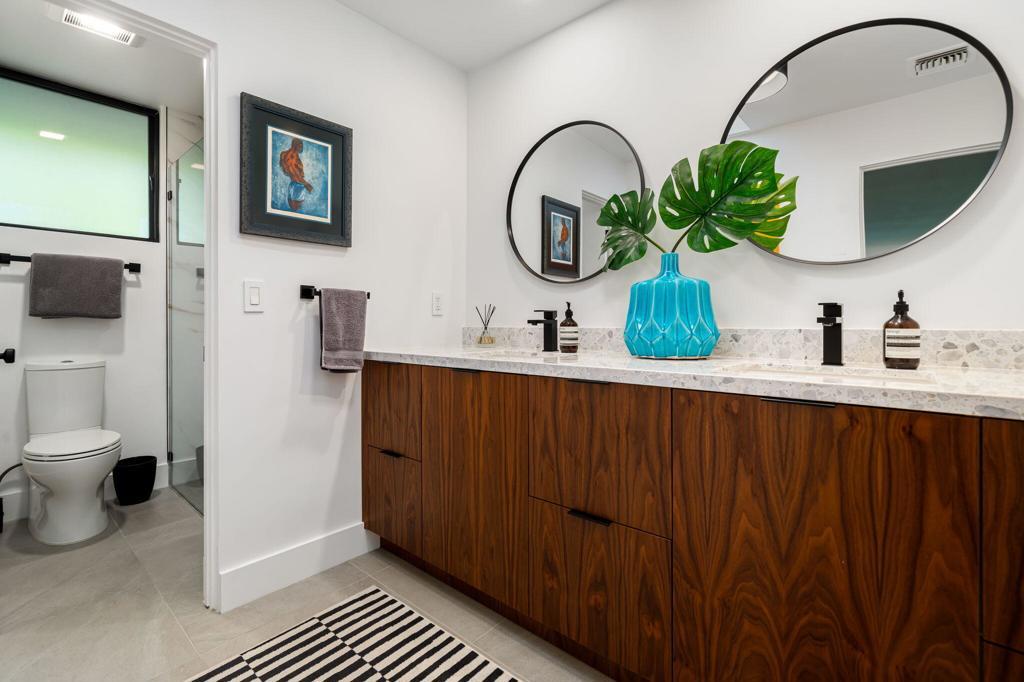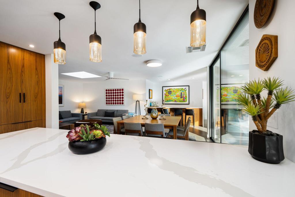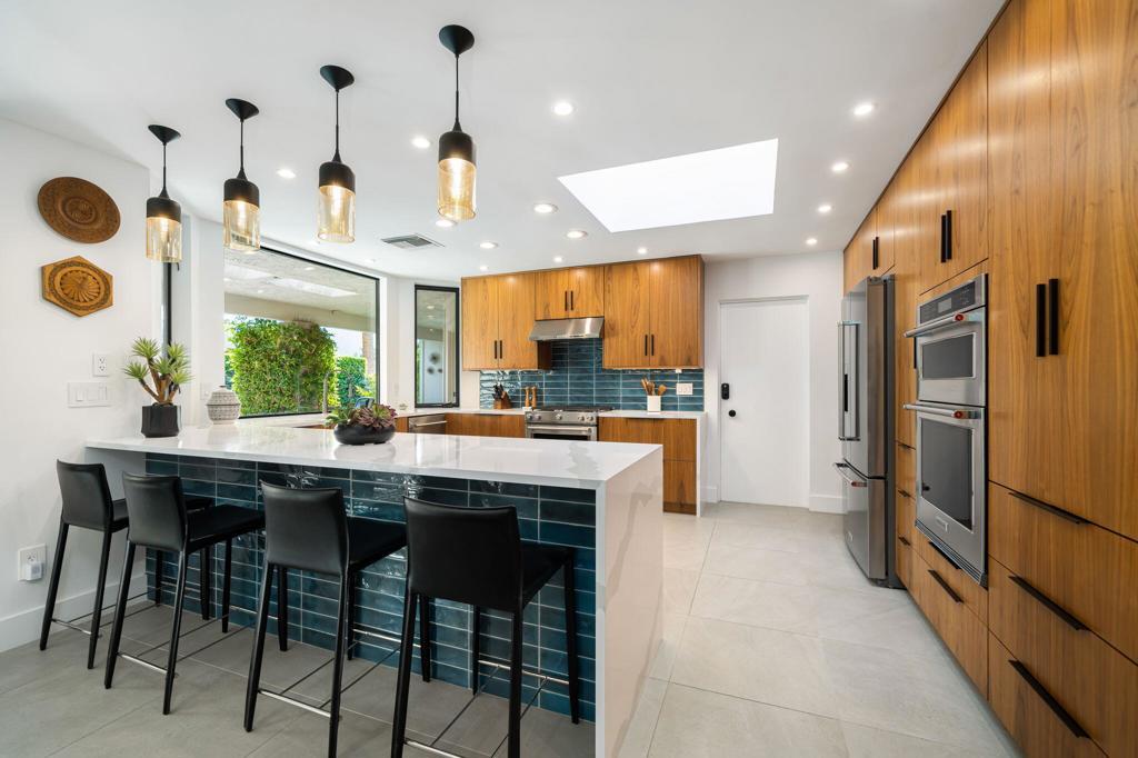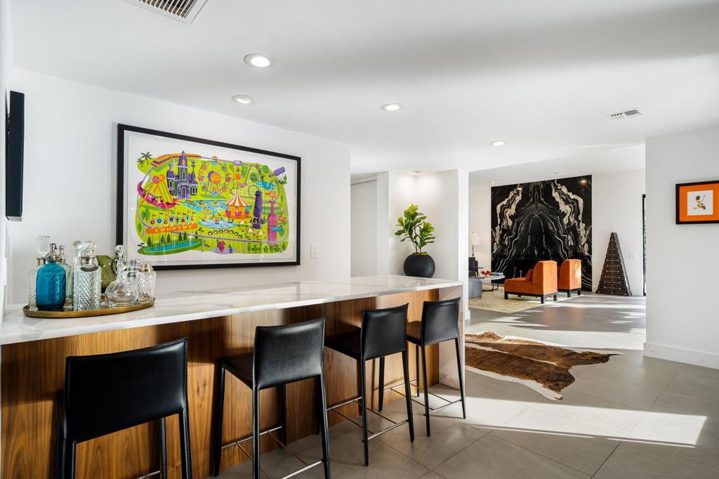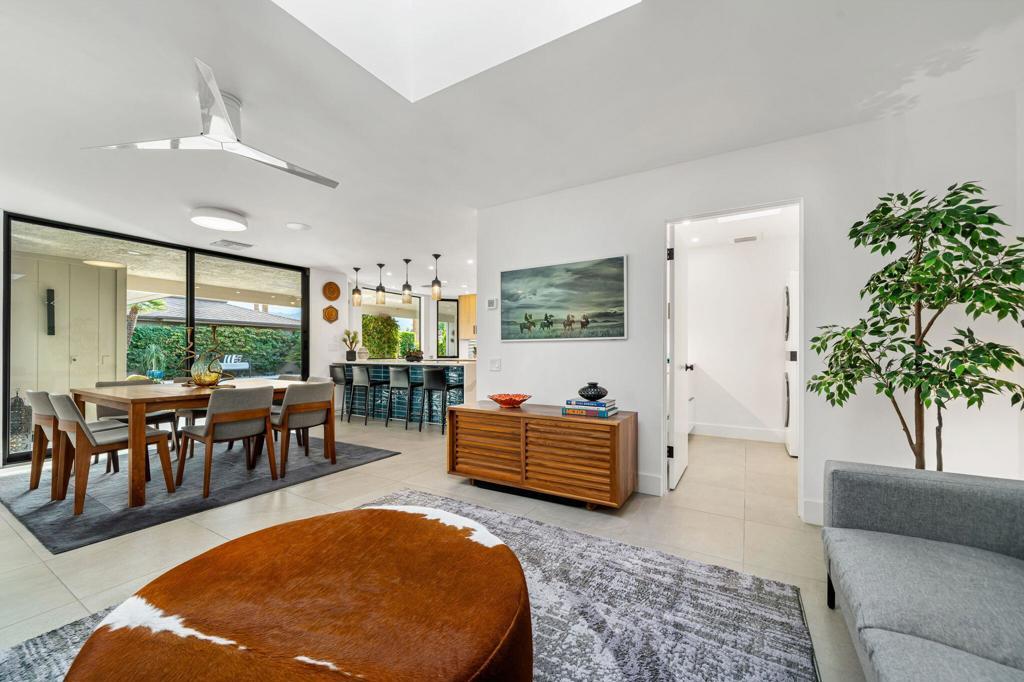 Commanding a rare perimeter position against a golf course, this extraordinary contemporary estate is a private sanctuary defined by unobstructed, cinematic views of the San Jacinto mountain range--a distinction enjoyed by no other home on the street. Completely freestanding and enveloped by mature hedges and perimeter walls, the property delivers a level of privacy, quiet, and exclusivity seldom found. Inside, the home unfolds as a masterclass in modern luxury. Expanses of glass flood the interiors with natural light, blurring the line between indoors and out. Clean architectural lines, elevated finishes, and curated design details create an atmosphere that is both striking and effortlessly livable. The living space centers around a dramatic statement fireplace, anchoring the home with warmth and visual impact while maintaining a flawless contemporary aesthetic.The kitchen is both artful and functional, featuring quartz surfaces, custom grain-matched walnut cabinetry, and a premium appliance suite designed for serious entertaining. Three luxuriously appointed en-suite bedrooms offer hotel-caliber comfort and privacy, each enhanced with sound-dampening construction, custom closets, and spa-inspired bathrooms finished with refined stone, rain showers, and designer fixtures. The primary suite elevates the experience further with an indulgent soaking tub and elevated spa amenities. Outdoors, the residence transforms into a resort-level retreat. A newly redesigned saltwater pool and spa, finished in elegant PebbleTec and controlled via mobile technology, is surrounded by expansive lounging, dining, and entertaining spaces. A custom outdoor kitchen, integrated sound system, exterior quartzite shower, multiple seating zones, and a turf area ideal for bocce ball create a setting equally suited for tranquil mornings or unforgettable evenings under the desert sky. Thoughtful modern infrastructure--including an owned 17+ kW solar system, upgraded electrical and gas capacity, advanced lighting, and refined landscaping--ensures beauty is matched by performance and efficiency. This is more than a home; it is a statement of lifestyle--where architectural intention, location, privacy, and luxury converge in rare harmony. An exceptional offering for those who demand both distinction and discretion.