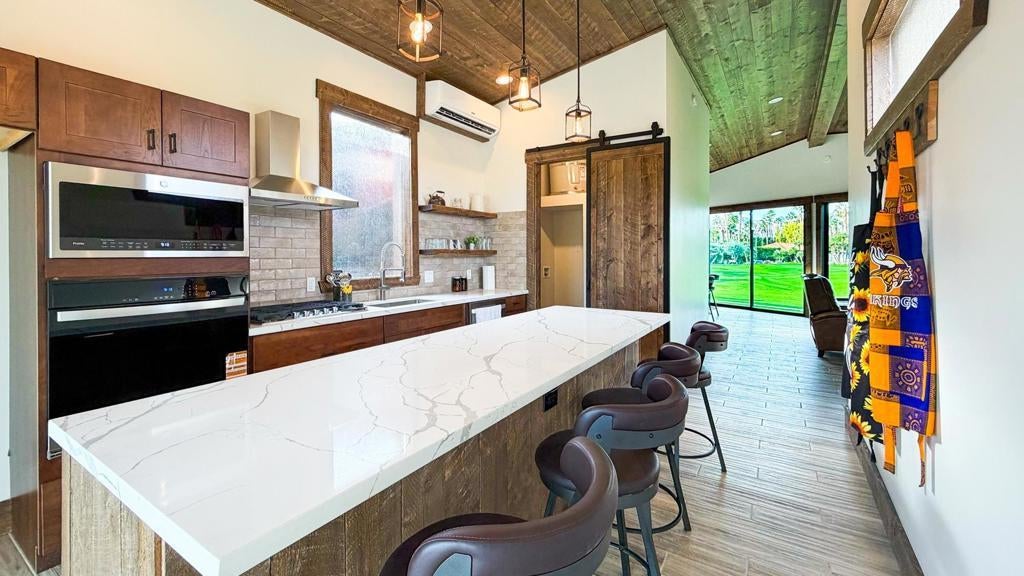 Outdoor Resort Indio is a Class A Motorcoach resort. This is an RV lot. This luxury RV lot with approximately 800 sq ft casita at Outdoor Resort Indio offers upscale design, flexible living space, and stunning resort views. Vaulted barn-wood ceilings, matching doors, tile floors, and abundant natural light create a warm, inviting interior with afternoon mountain views and sunset vistas over the golf course and water.The spacious kitchen features a 12-foot quartz island, hickory cabinets with soft-close doors, floating barn-wood shelves, a five-burner gas cooktop with vent, wall microwave, oven, large sink, disposal, and a walk-in pantry, plus hookups for a full-size refrigerator and washer/dryer. A large enclosed storage room offers flexibility and could be converted to a Murphy bed.Comfort features include mini-split heating and air, whole-house sound system, water softener, and an electric fireplace with mantle, pre-wired for TV. Outside, a full paver RV pad provides parking for coach, car, and golf cart, while AstroTurf out front creates a pet-friendly space. This beautifully designed casita lot delivers refined, low-maintenance luxury in a premier RV resort setting.
