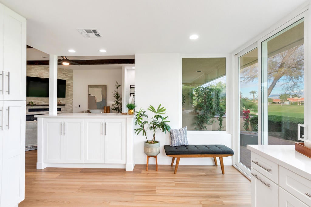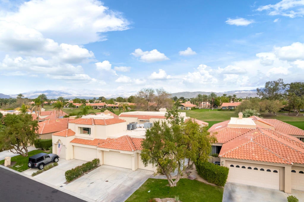 NEW, NEW, NEW with Golf Course View! Come home to the world renown Mission Hills Golf Club community. This 3 bed/3bath, 3 car garage newly remodeled home is gated and guarded and perfect for 2 families, with one Primary Bed/Bath downstairs and additional primary bedroom and bath upstairs. Dual sinks and lighted mirrors in both primary baths. The 3rd Bed/Bath is on main floor. Or, live on main floor with the other primary guestroom and bath upstairs. Situated on the Pete Dye Resort golf course, enjoy watching the golfers and the fabulous mountain view or relax by the firepit under the stars on the cool evenings. Gas BBQ hookup is available as well. New brick patio pavers. This home features a complete remodel with new GE appliances featuring; a gas stove/double oven, refrigerator, washer with gas dryer (electric hookup is available), dishwasher and micro oven. New Shaker style cabinets with soft close hinges, cabinet pantry with pull out drawers. Calcutta gold quartz countertops and back splashes accent to todays modern sleek, uncluttered yet warm atmosphere. The electric remote controlled fireplace in great room as well as the ceiling beams and ceiling fans add to the warmth. All new energy efficient dual glaze Anlin windows and sliding doors throughout with a transferable lifetime warranty have been installed. Included are new frameless view windows in Kitchen. Floors are all new Luxury Vinyl Tile (LVT) throughout with stairs and upstairs bedroom with new high grade carpet. A 70'' Samsung TV is also included. HVAC system and water heater are reported to be less than 5 years old by previous owner. HOA amenities includes landscape maintenance, roofing, trash, sewer, cable TV and painting of exterior. Exterior is scheduled to be painted this summer. 4 pools and spas. The Weston Resort is a golf cart ride away. There are several golf options, from public course to memberships offered.
