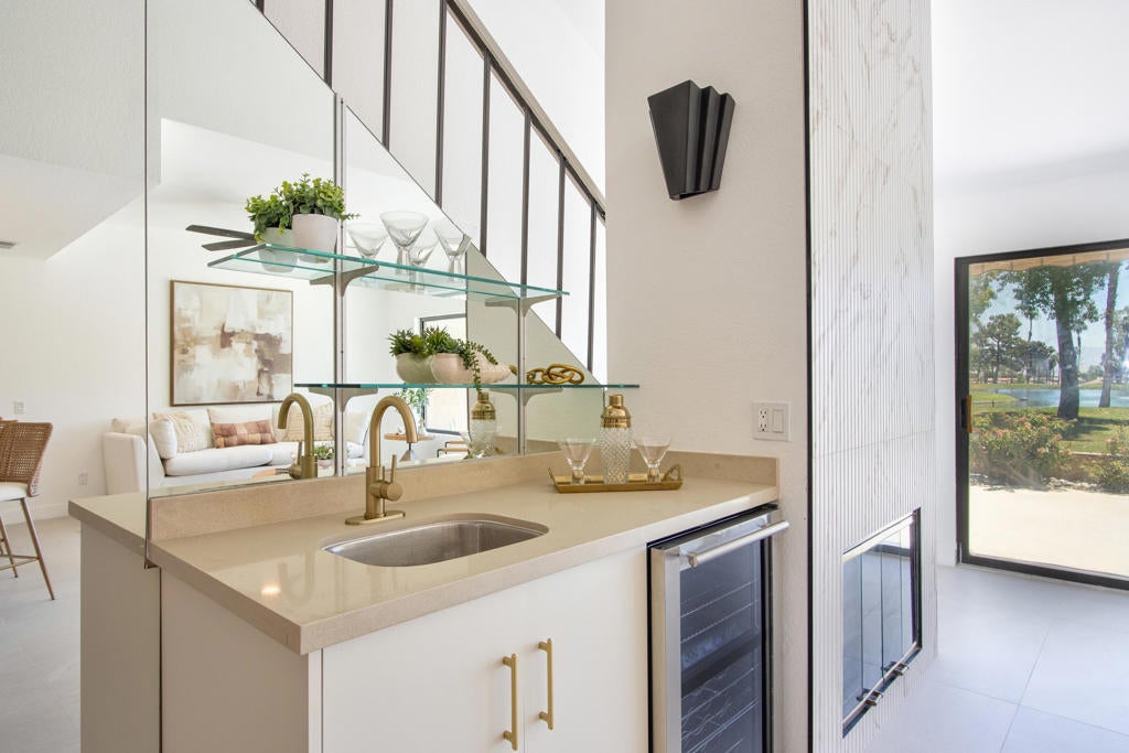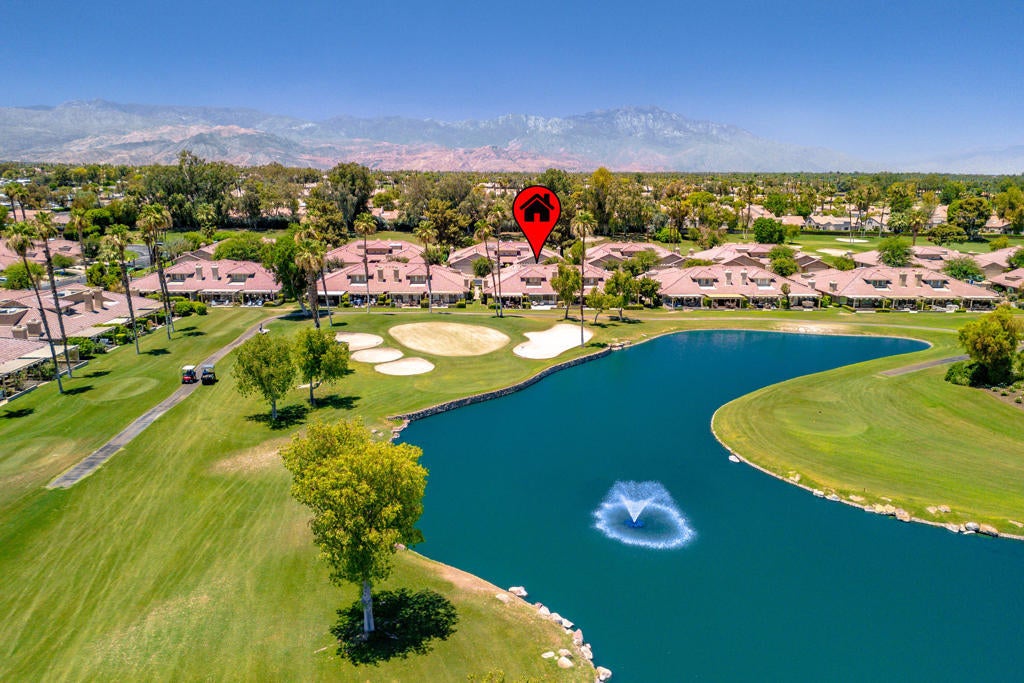 Located Behind The Gates Of One Of Woodhaven Country Club's Best Locations Is This Amazing Designer Remodeled Condo. Resting on the 6th green & overlooking the lake & course, this spacious home features 1,808 sq ft of open living space abundant natural lighting and high end finishes throughout. The newly designed kitchen features custom cabinetry, quartz countertop with waterfall edging and new appliances. The home has a great room flow with high ceilings & the kitchen opening to living space and golf course & lake views. Elegant, fluted floor to ceiling fireplace is adjacent to wet bar with wine fridge and dining area. The primary suite has the entire dedicated second level with custom wallpaper and a great secondary space overlooking the golf course perfect for a home office, workout area or reading room. The primary bathroom has walk in shower & clean minimalist designer finishes. Guest bedroom has beautiful en suite bathroom. Den/Office area can easily be utilized as a 3rd bedroom. The amenities at Woodhaven CC include 7 tennis courts, 4 pickleball courts, and a full-service clubhouse. HOA dues cover cable TV, high-speed internet, HBO, Showtime, landscaping, community pools, guard gate security and exterior home maintenance, including the roof. Owners qualify for discount golf as well! Remodel was just completed by local designer, Violet Moran. This is an amazing opportunity to live the desert golf lifestyle of Palm Desert and feel like you are at a resort while enjoying incredible designer finishes of a newly remodeled home.