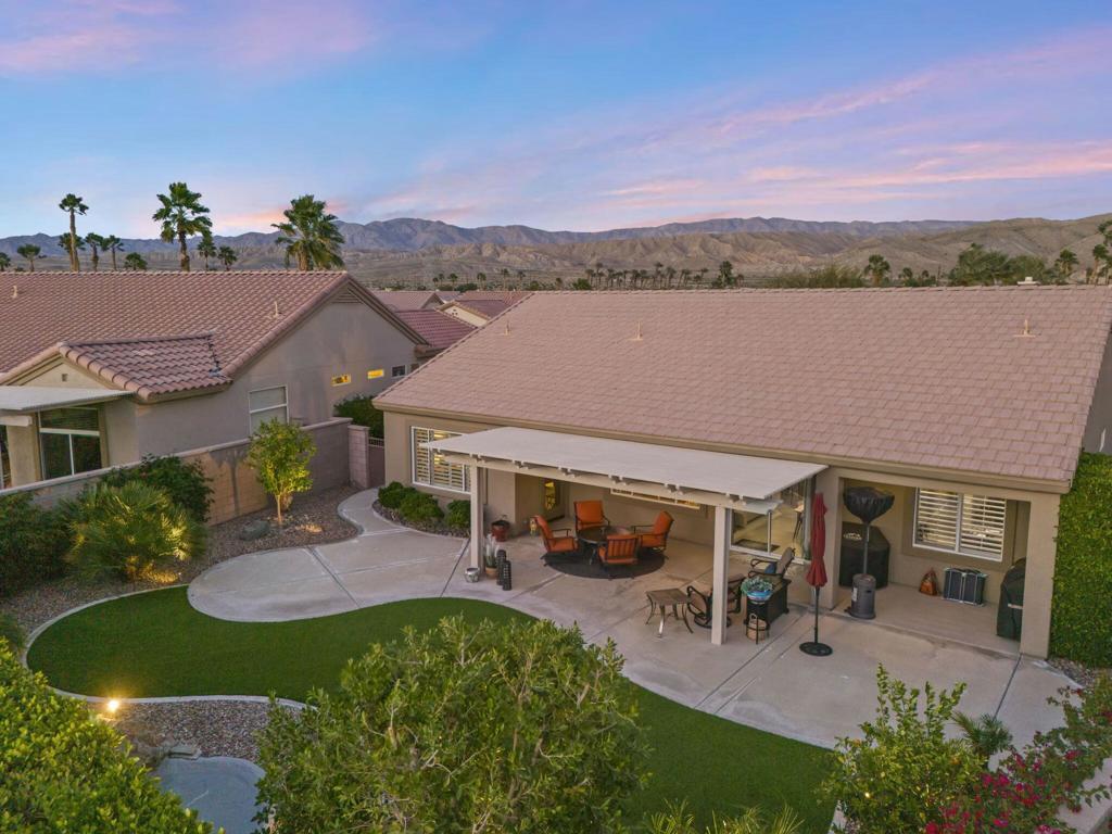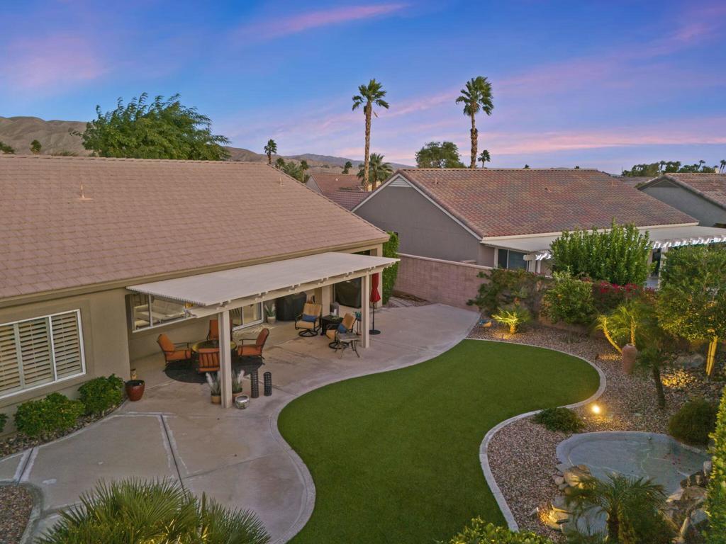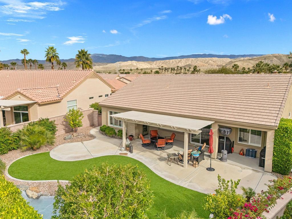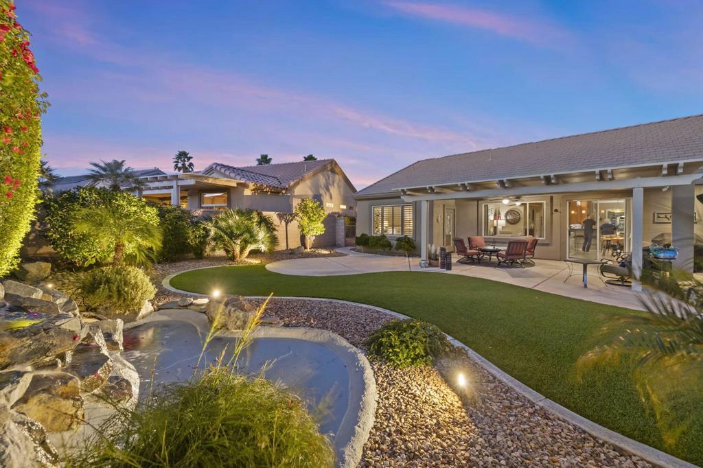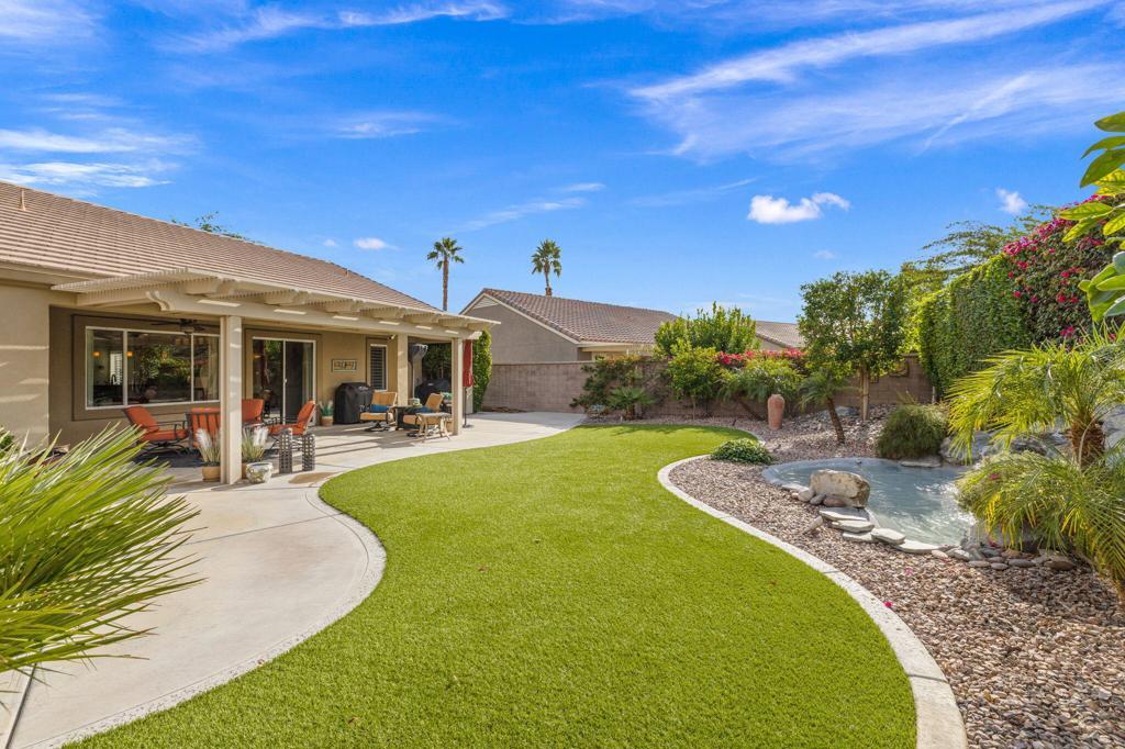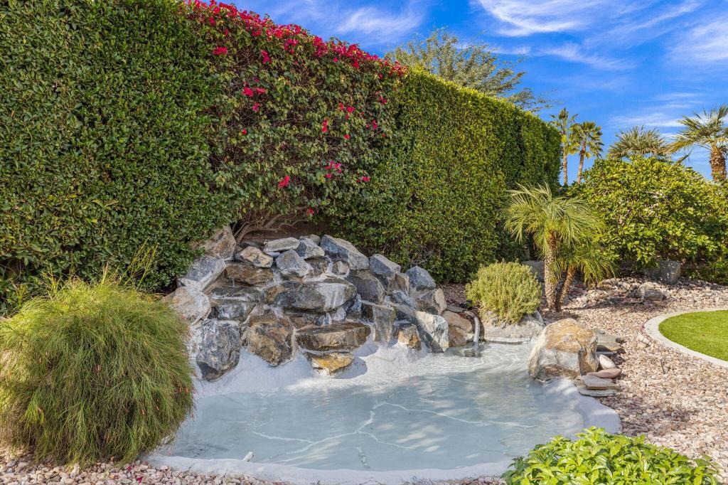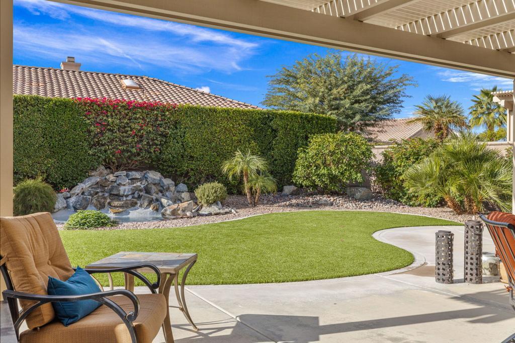 Nestled in the premier 55+ community of Sun City Palm Desert, this highly sought-after Montego model showcases one of the most desirable open-concept floor plans. Thoughtful updates, beautiful finishes, and a meticulously maintained yard make this home truly move-in ready. Newer exterior paint and lush desert landscaping create standout curb appeal as you arrive. A gated front courtyard with a tranquil fountain leads you into the foyer, where sightlines extend straight through to the pristine backyard. The flexible floor plan offers 2 bedrooms, a den/office/optional guest room, and 2 fully renovated bathrooms. Interior features include plantation shutters and stylish 24-inch tile flooring throughout the main living areas for a cohesive, upscale look. The upgraded kitchen features a cozy breakfast area, quartz countertops and backsplash, double sink, and custom ceiling-height soft-close cabinets with modern hardware. Under-cabinet lighting, pull-out shelves, recessed ceiling lights, pendant lighting over the sit-up bar, and stainless steel appliances--including a new Miele wall oven--enhance both function and style. The kitchen, dining, and living rooms all look out onto the expansive backyard, creating a bright, seamless indoor-outdoor feel.Outdoors you'll find an extended patio with Alumawood cover, artificial turf, a soothing waterfall feature, and multiple fruit trees for a private, resort-like retreat. The spacious primary suite offers direct access to the backyard plus an upgraded en-suite with quartz counters, double vanity, tiled walk-in shower, and a walk-in closet with custom organizers. On the opposite side of the home, a welcoming guest bedroom and the den/third guest room share a remodeled bath, providing excellent separation and privacy. The laundry room includes upper cabinets, a sink, and washer/dryer, while the 2-car garage features cabinetry, a mini-split air conditioner, and water filtration system.
