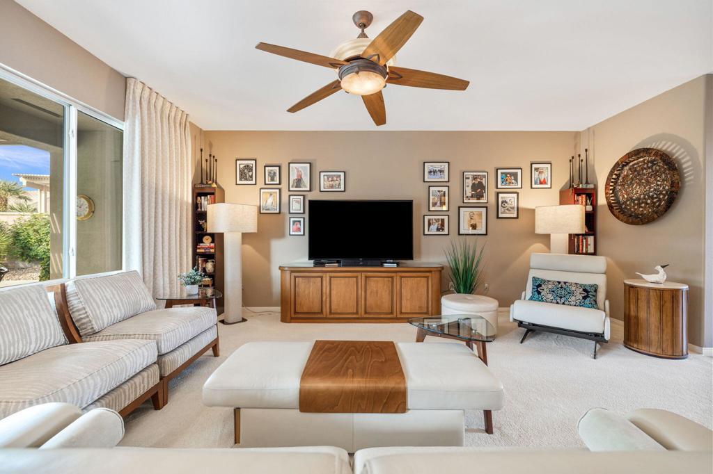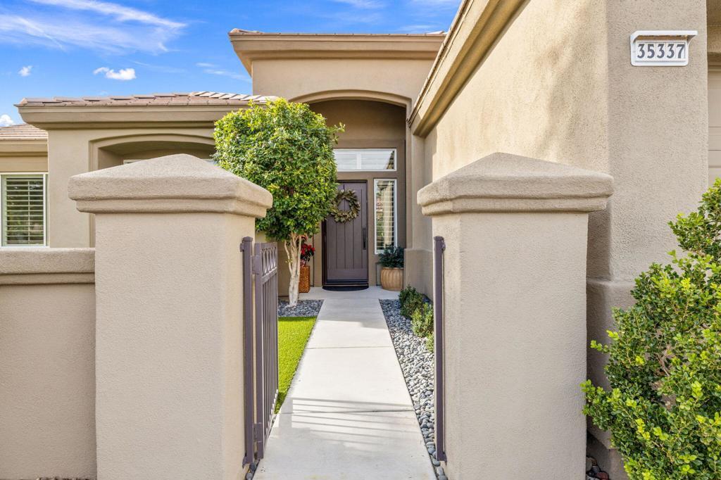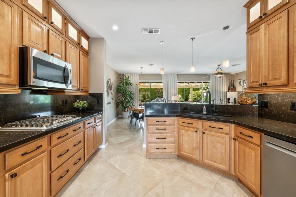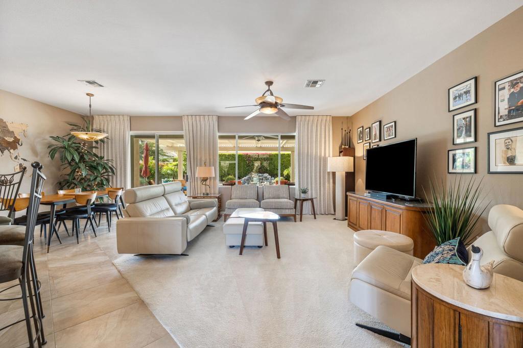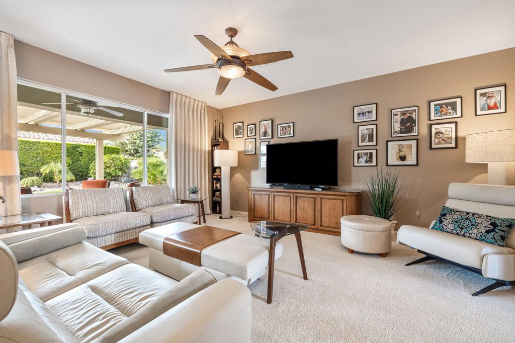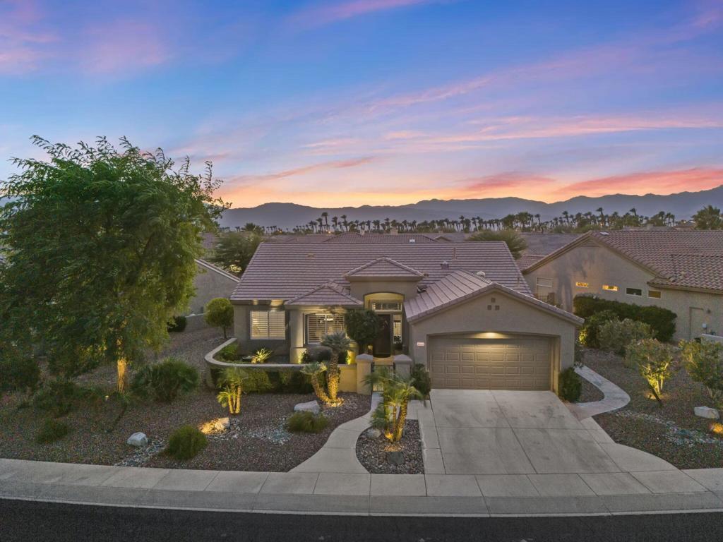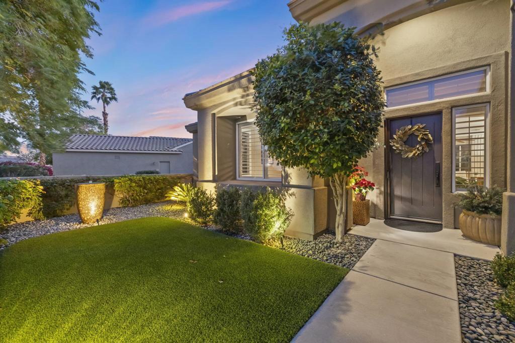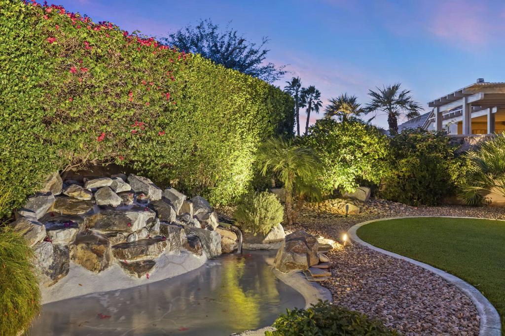 Nestled in the premier 55+ community of Sun City Palm Desert, this highly sought-after Montego model showcases one of the most desirable open-concept floor plans. Thoughtful updates, beautiful finishes, and a meticulously maintained yard make this home truly move-in ready. Newer exterior paint and lush desert landscaping create standout curb appeal as you arrive. A gated front courtyard with a tranquil fountain leads you into the foyer, where sightlines extend straight through to the pristine backyard. The flexible floor plan offers 2 bedrooms, a den/office/optional guest room, and 2 fully renovated bathrooms. Interior features include plantation shutters and stylish 24-inch tile flooring throughout the main living areas for a cohesive, upscale look. The upgraded kitchen features a cozy breakfast area, quartz countertops and backsplash, double sink, and custom ceiling-height soft-close cabinets with modern hardware. Under-cabinet lighting, pull-out shelves, recessed ceiling lights, pendant lighting over the sit-up bar, and stainless steel appliances--including a new Miele wall oven--enhance both function and style. The kitchen, dining, and living rooms all look out onto the expansive backyard, creating a bright, seamless indoor-outdoor feel.Outdoors you'll find an extended patio with Alumawood cover, artificial turf, a soothing waterfall feature, and multiple fruit trees for a private, resort-like retreat. The spacious primary suite offers direct access to the backyard plus an upgraded en-suite with quartz counters, double vanity, tiled walk-in shower, and a walk-in closet with custom organizers. On the opposite side of the home, a welcoming guest bedroom and the den/third guest room share a remodeled bath, providing excellent separation and privacy. The laundry room includes upper cabinets, a sink, and washer/dryer, while the 2-car garage features cabinetry, a mini-split air conditioner, and water filtration system.