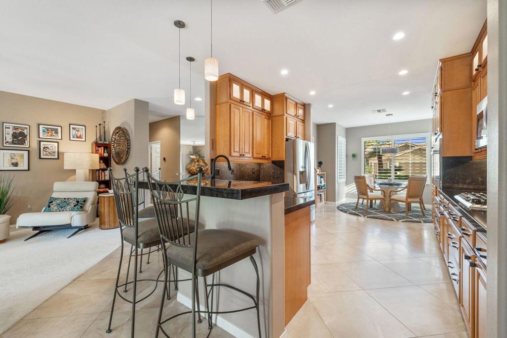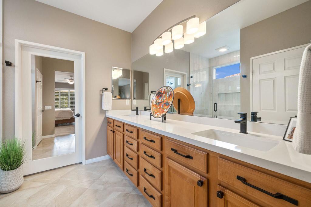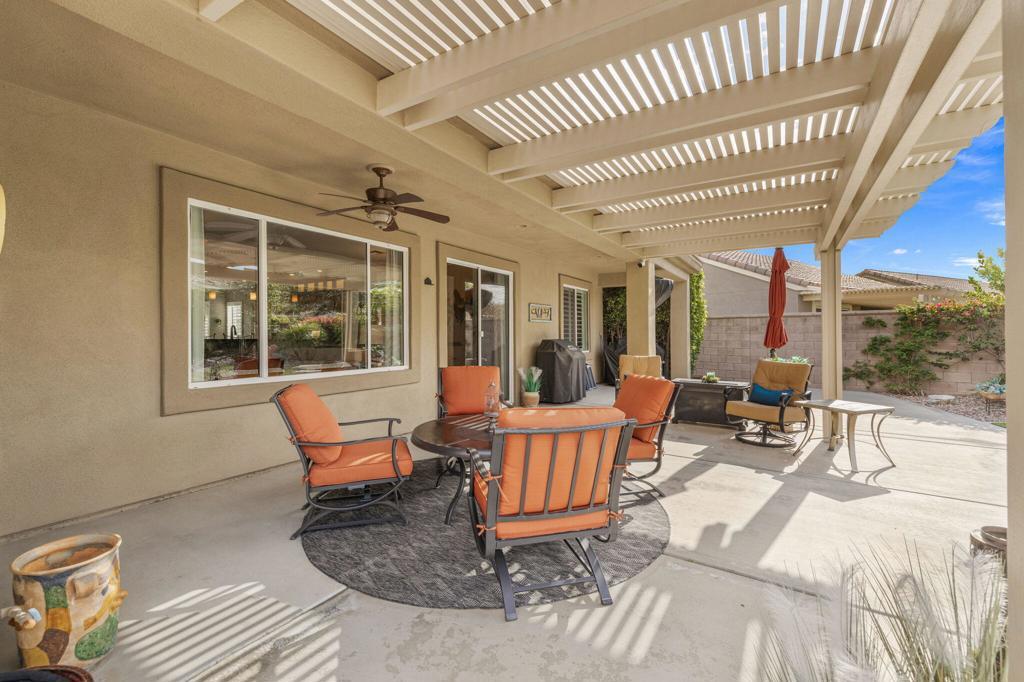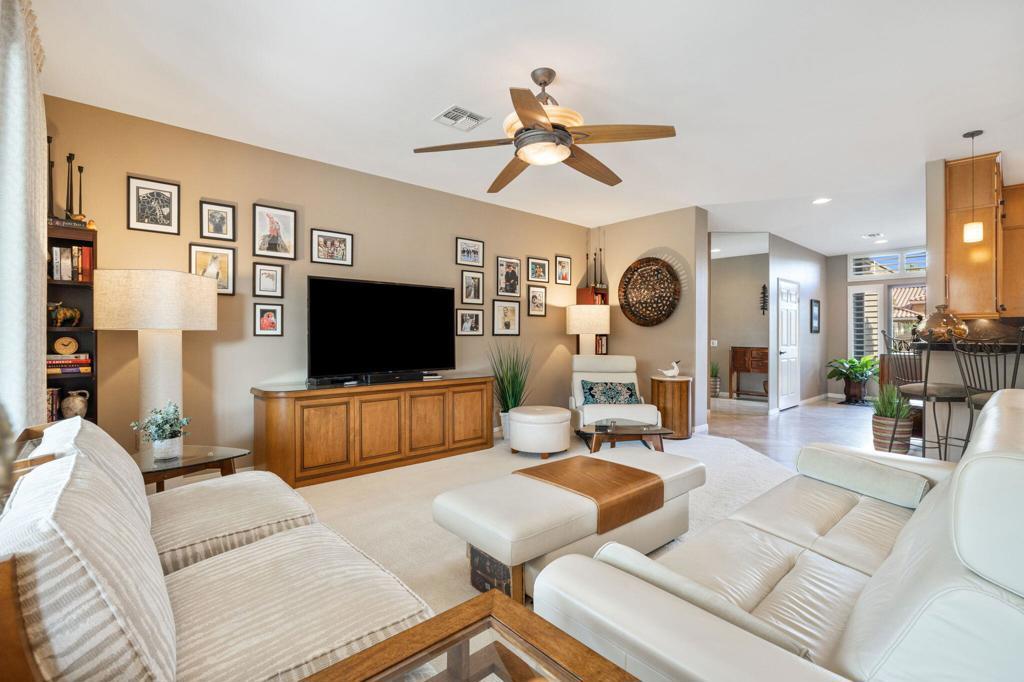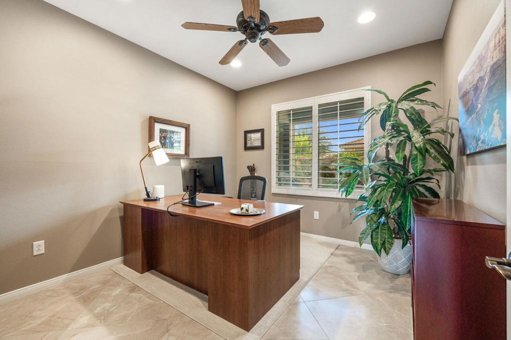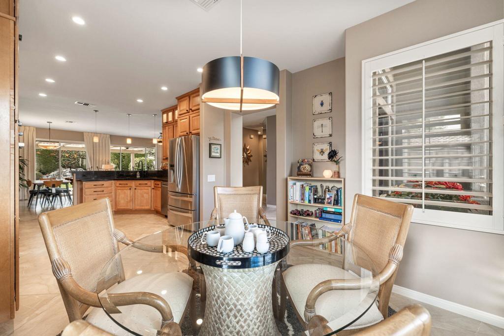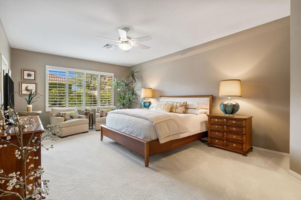 Nestled in the premier 55+ community of Sun City Palm Desert, this highly sought-after Montego model showcases one of the most desirable open-concept floor plans. Thoughtful updates, beautiful finishes, and a meticulously maintained yard make this home truly move-in ready. Newer exterior paint and lush desert landscaping create standout curb appeal as you arrive. A gated front courtyard with a tranquil fountain leads you into the foyer, where sightlines extend straight through to the pristine backyard. The flexible floor plan offers 2 bedrooms, a den/office/optional guest room, and 2 fully renovated bathrooms. Interior features include plantation shutters and stylish 24-inch tile flooring throughout the main living areas for a cohesive, upscale look. The upgraded kitchen features a cozy breakfast area, quartz countertops and backsplash, double sink, and custom ceiling-height soft-close cabinets with modern hardware. Under-cabinet lighting, pull-out shelves, recessed ceiling lights, pendant lighting over the sit-up bar, and stainless steel appliances--including a new Miele wall oven--enhance both function and style. The kitchen, dining, and living rooms all look out onto the expansive backyard, creating a bright, seamless indoor-outdoor feel.Outdoors you'll find an extended patio with Alumawood cover, artificial turf, a soothing waterfall feature, and multiple fruit trees for a private, resort-like retreat. The spacious primary suite offers direct access to the backyard plus an upgraded en-suite with quartz counters, double vanity, tiled walk-in shower, and a walk-in closet with custom organizers. On the opposite side of the home, a welcoming guest bedroom and the den/third guest room share a remodeled bath, providing excellent separation and privacy. The laundry room includes upper cabinets, a sink, and washer/dryer, while the 2-car garage features cabinetry, a mini-split air conditioner, and water filtration system.