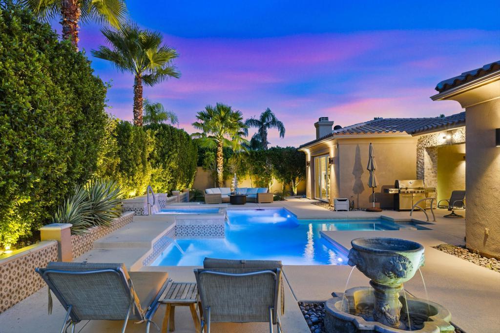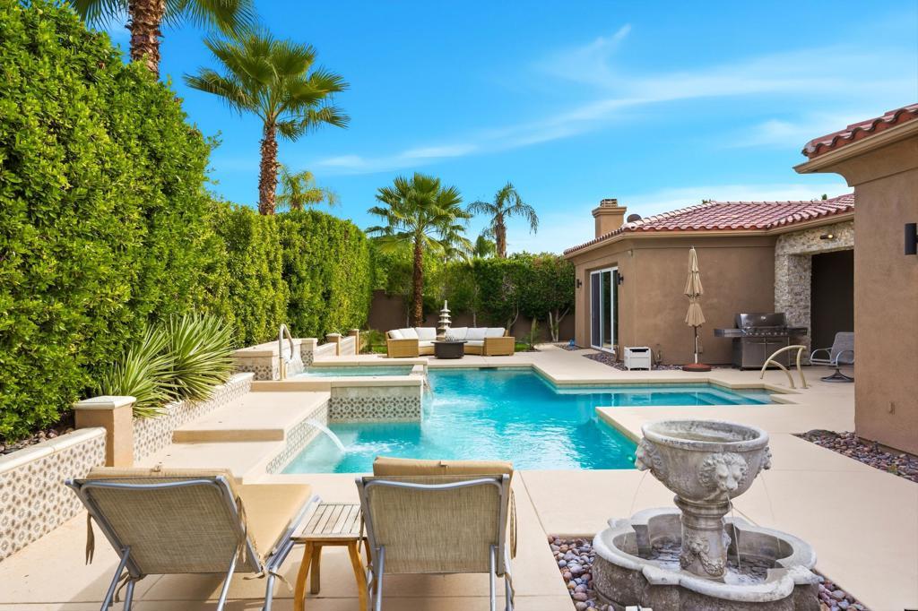 Welcome to this beautifully remodeled 4-bedroom, 3.5-bath home in gated St. Augustine, in the heart of Rancho Mirage, on a desirable corner lot with a private courtyard entry and expansive mountain views. Step inside to a welcoming living room with a fireplace and direct views through to the inviting pool and spa -- an elegant introduction to relaxed indoor-outdoor California living.Continue down the hall past the large office to the heart of the home, where a spacious great room with its own fireplace and a gourmet kitchen with island and updated appliances awaits -- designed for both everyday living and entertaining. A wet bar thoughtfully connects the living room and great room, creating an ideal flow for gatherings. High ceilings, architectural arches, updated lighting and electrical, stackstone enhancements and owned solar enhance the sense of space, comfort and efficiency throughout.The generous primary suite is a serene retreat featuring a custom built-in wall unit and a beautifully remodeled bathroom with roll-in shower. Secondary bedrooms include a room currently enjoyed as an art studio, offering flexible space for today's lifestyle and 2 guest suites.Designed for everyday living and entertaining, this home is beautifully landscaped with low-maintenance turf and thoughtful plantings that complement the private backyard oasis with pool and spa. Enjoy the 3 car garage with direct access. Take advantage of community parks, tennis and pickleball courts moments away. Exceptional living in a premier Rancho Mirage address with appeal for both active and relaxed lifestyles.