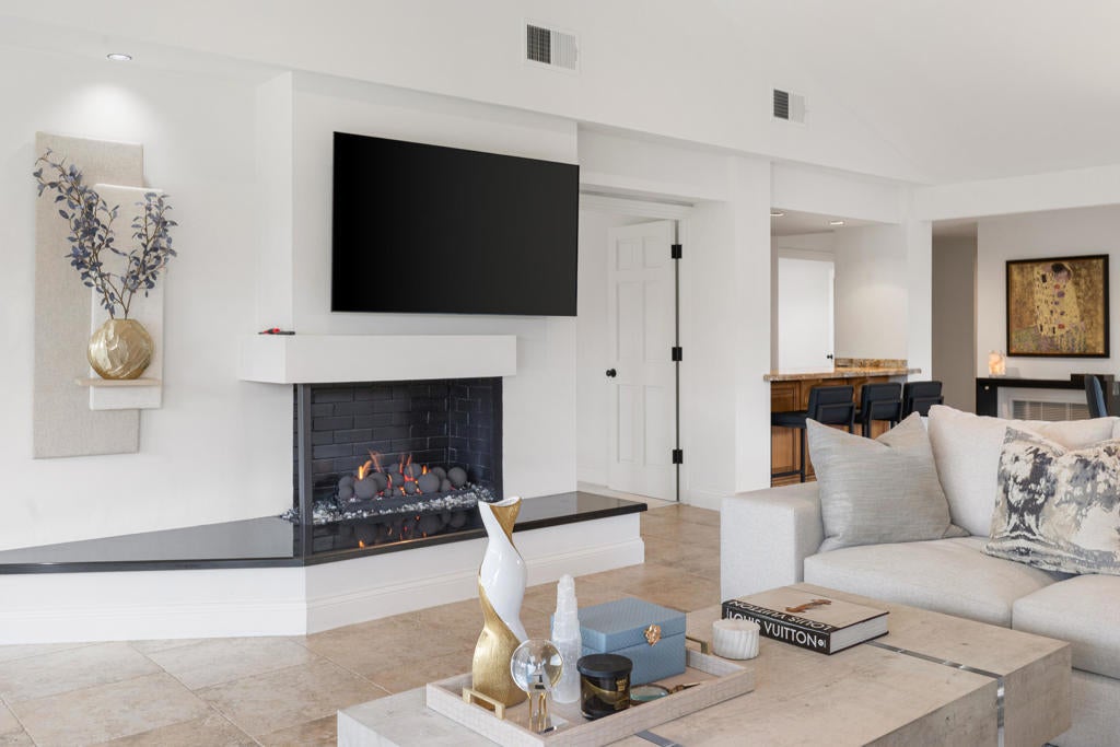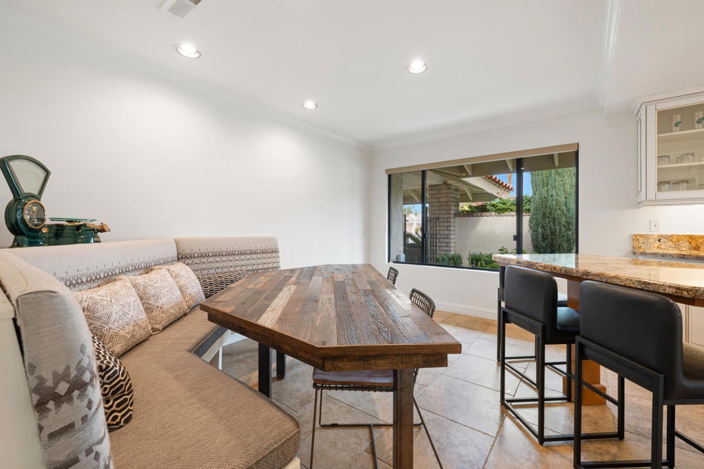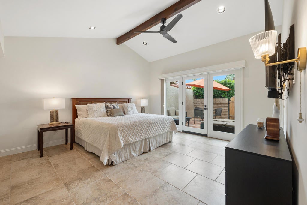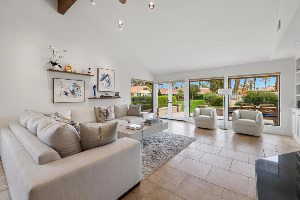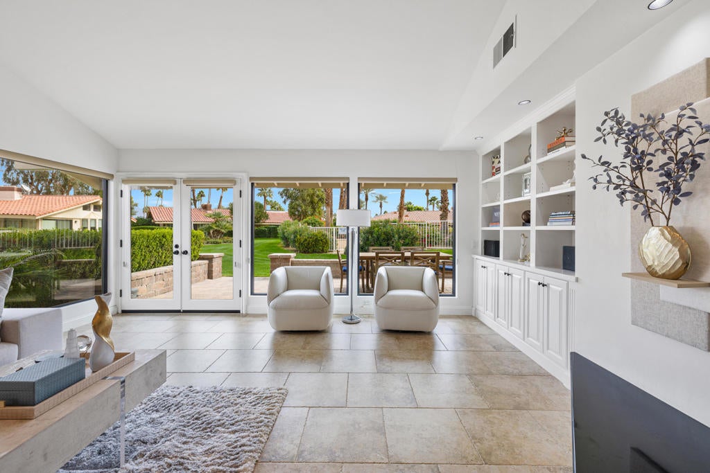 Beautifully renovated, new contemporary furnishings (per sellers' inventory) 2529 Sq.Ft. Berghere Condo, 2 Bedrooms with vaulted ceilings, 2 en-suite Baths, Powder Bath, large home Office, 2 fireplaces, 2 car plus golf cart garage with epoxy floor/ built-ins, located in the heart of Indian Wells Country Club. Wonderful curb appeal with pavered driveway and walkway to gated Courtyard entryway, lushly landscaped with statuesque fountain. Modern French door entry into Great Room and formal Dining area with high beamed ceiling, large windows, and terrific mountain views! Great Room has modern fireplace with black granite hearth and double glass doors open to expansive pavered back patio with firepit, extending the indoor/outdoor flow with awesome mountain and desert views. Neutral tiled floors, abundant recessed lighting, and granite countertops throughout interior. Primary Bedroom has custom carpet. The Open floor plan features a spacious Wet-Bar with granite countertops, bar seating, and wine cooler. Kitchen has gorgeous granite countertops, an island with bar seating, stainless appliances, and big windows for picturesque views. Informal Dining area adjoins. Primary Bedroom highlights high beamed ceiling, fireplace, scenic views, glass door out to back patio, close to community pool/ jet spa. Primary Bath features double sinks, large neutral tiled glass shower, lots of custom-built-in cabinets, and big walk-in closet. Guest Bedroom Suite features spacious walk-in shower, generous walk-in closet, and a private patio, ideal for relaxing and enjoying the desert lifestyle.