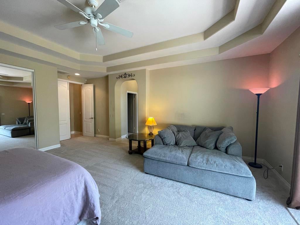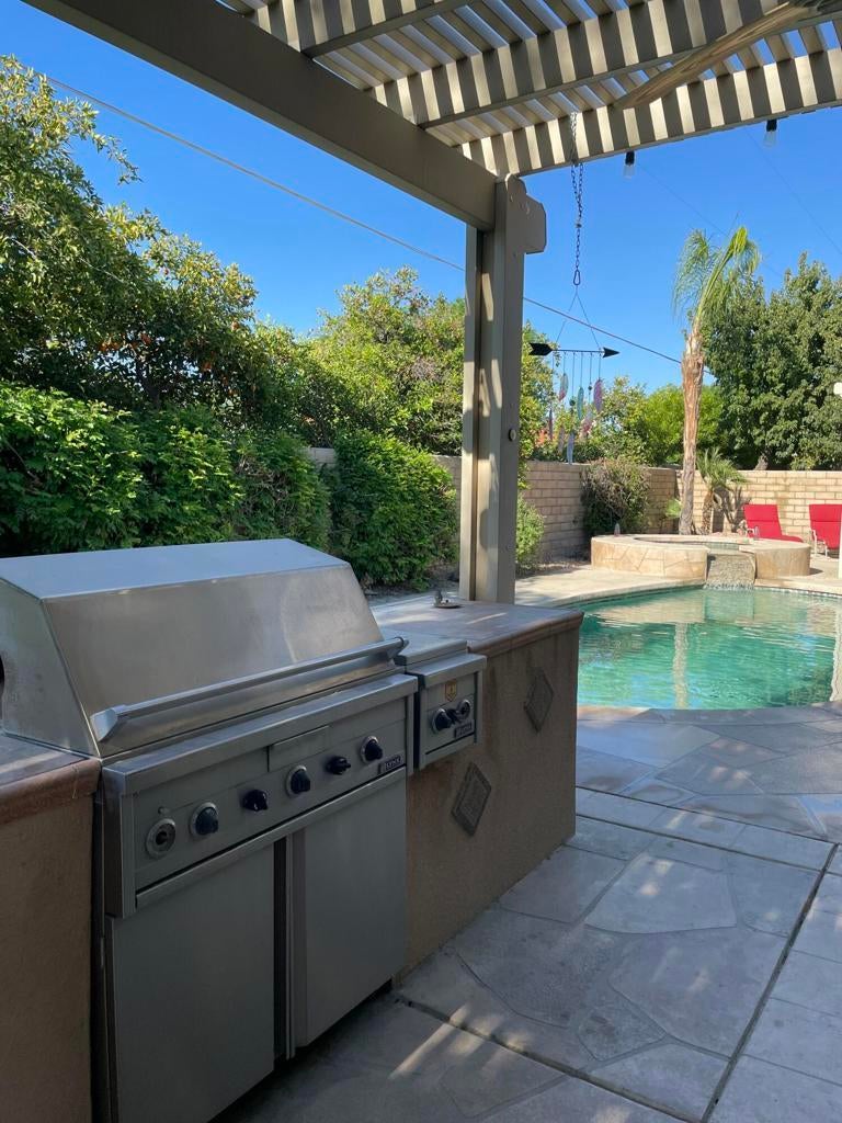 This stunning 3-bedroom, plus an office, 4-bathroom home epitomizes elegance and comfort, blending luxury with modern amenities. The master suite features a spacious bedroom, a luxurious full bath with a soaking tub, dual sinks, and a walk-in closet. The two additional bedrooms each have their own ensuite 3/4 bathrooms, ensuring privacy and convenience for family or guests. An additional bonus office/library room has floor-to-ceiling cabinets/shelving with glass doors to view contents. A guest half bath is conveniently located near the front door.The grand open floor plan is highlighted by high ceilings and an elegant living room with a cozy fireplace. There are two dining areas, perfect for both formal and casual meals. The gourmet kitchen is upgraded with high-end appliances, a center island, and a hightop bar for additional seating. It boasts two dishwashers for easy cleanup and a wine cooler for the connoisseur.Step outside to an inviting pool with a waterfall feature and a spa Jacuzzi for ultimate relaxation. The grassy area is perfect for play or pets, and the built-in BBQ grill makes outdoor entertaining a breeze. Additional amenities include an extra room for laundry with a sink, a 2-car garage, and an extra garage space/door for a golf cart. The expansive driveway accommodates up to six additional guest vehicles, with a dedicated side area in the backyard perfect for a truck, larger vehicle or small camper.