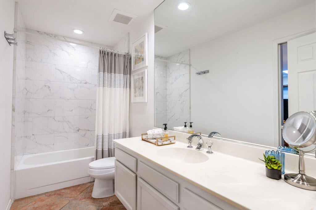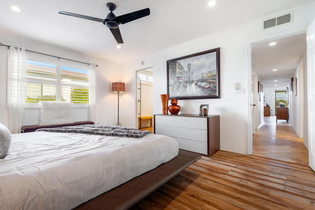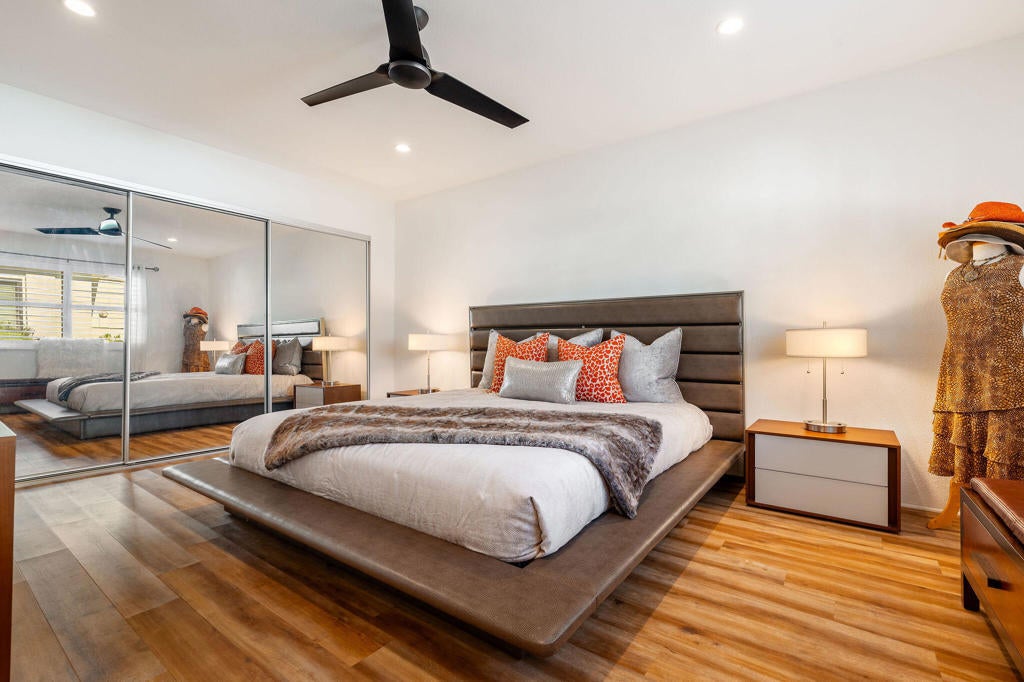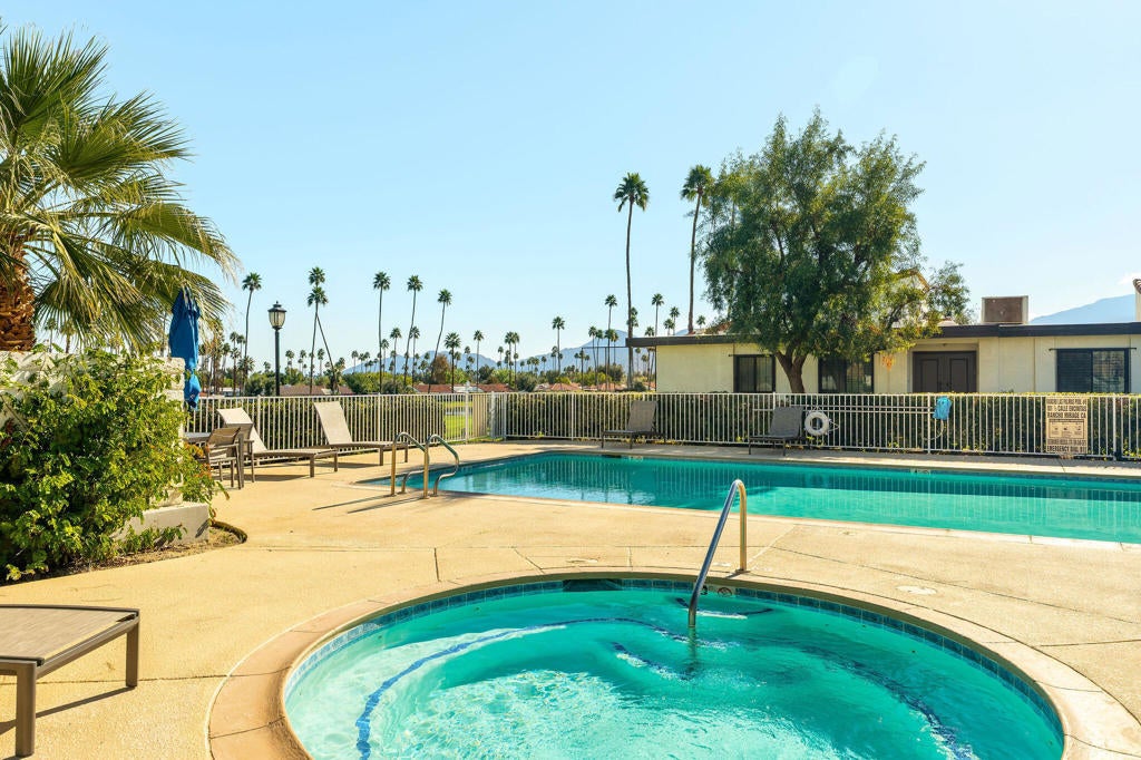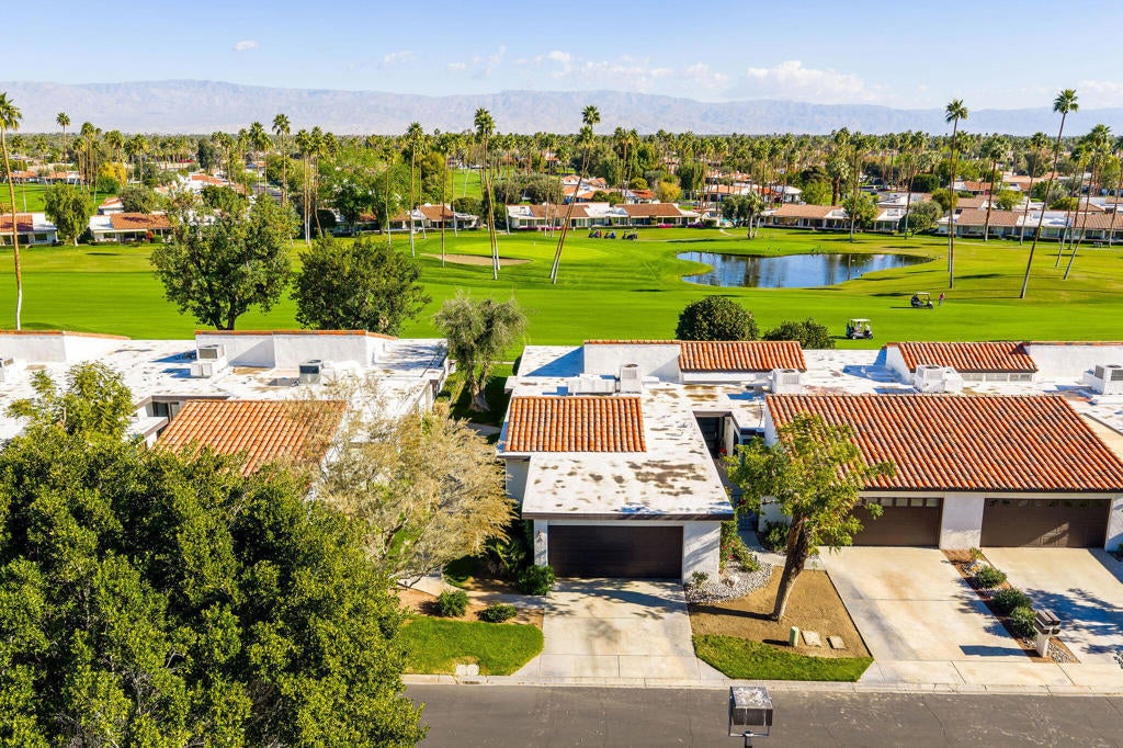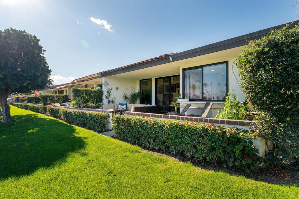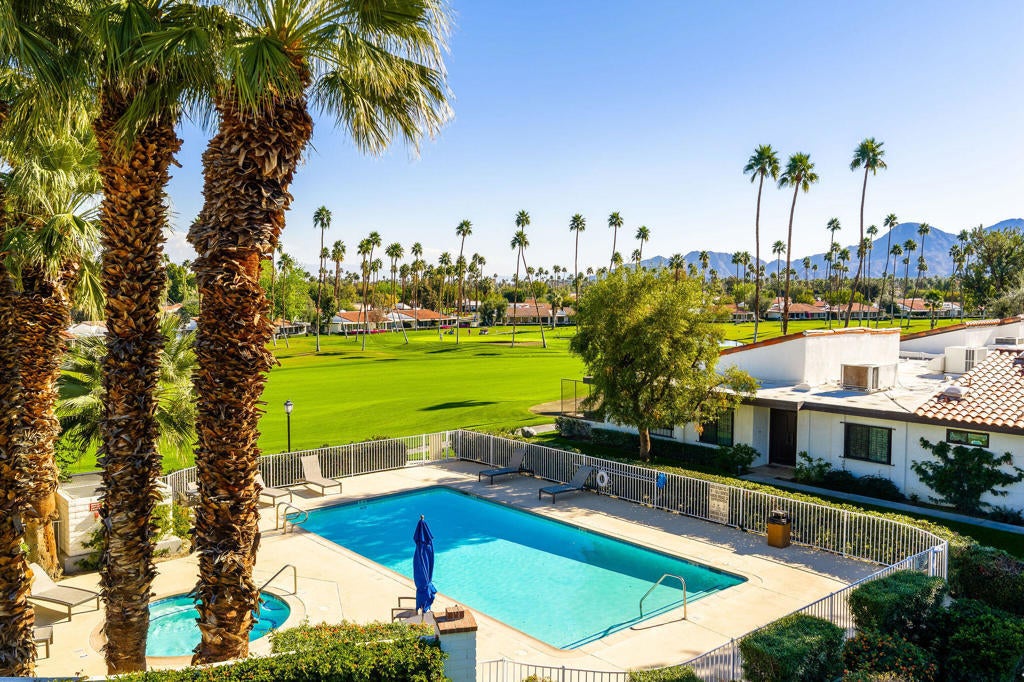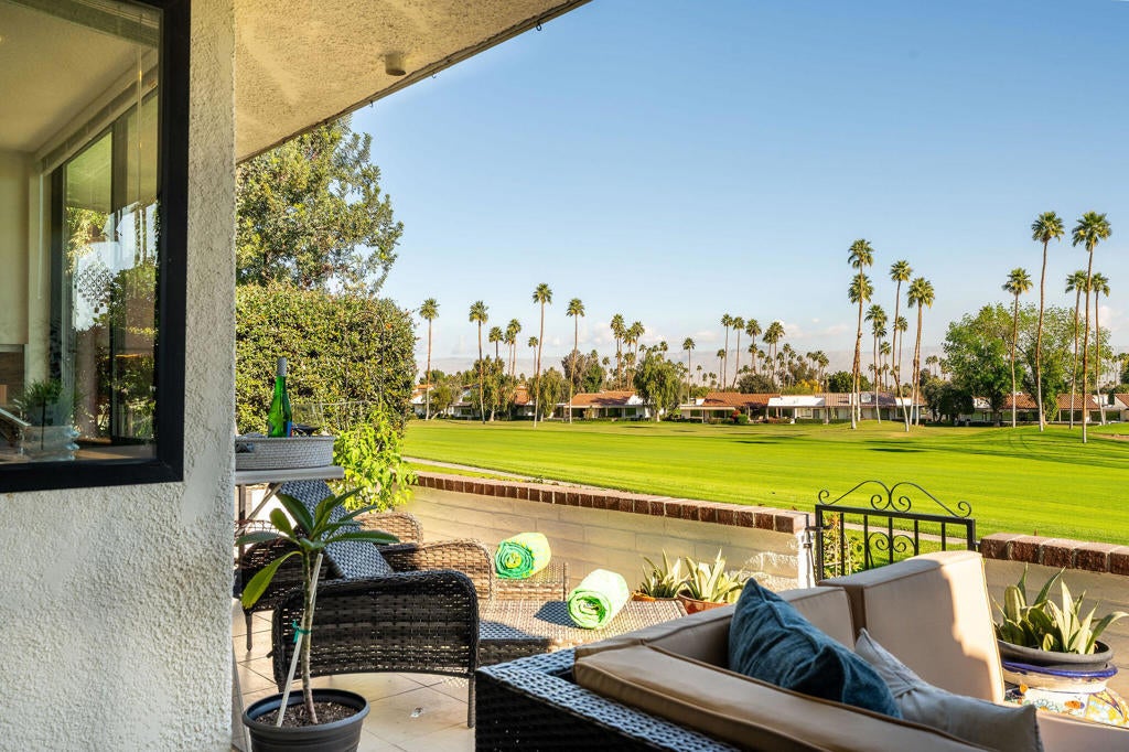 Exceptional opportunity in Rancho Las Palmas Country Club. This east-facing end-unit condominium is ideally located near the Bob Hope Gatehouse and offers expansive, unobstructed views across a double fairway with lake and mountain 'views.The home has undergone a comprehensive, high-quality remodel completed by licensed professionals using premium materials. Popcorn ceilings have been removed, interior pocket doors added, and the front and patio doors replaced, including a patio door with an integrated privacy blind and a separately installed Phantom screen. Milgard dual-paned, energy-efficient bronze anodized aluminum windows and sliders were installed in 2020.Interior finishes include stone and porcelain flooring in main living areas, with waterproof, cork-backed vinyl flooring in bedrooms and the primary bath. Custom basswood shutters accent select windows. Recessed LED lighting with dimmers is featured throughout.The kitchen is thoughtfully designed with quartz countertops, glass tile backsplash, custom wood cabinetry with pull-outs, pantry and carousel storage, under-cabinet LED lighting, and GFI-protected outlets. Built-in stainless appliances include a wall oven/convection oven, microwave/steamer, dishwasher, induction cooktop, vent hood, double sink, and instant hot water with filtration.Both bathrooms have been extensively upgraded. The primary bath features custom cabinetry, quartz countertops, dual sinks, premium fixtures, porcelain tile walls with niche, safety glass partition, and non-slip pebble flooring. The guest bath includes updated fixtures, porcelain tile shower walls, recessed lighting, enhanced ventilation, and GFI outlets.Additional improvements include a newer two-stage HVAC system, newer water heater, California Closets systems throughout, cedar-lined storage, ceiling fans with remotes, updated laundry room electrical and plumbing, LiftMaster garage opener, and a private tiled patio with gated entry, power outlets, and gas connection.This is a well-executed remodel in one of Rancho Las Palmas' most desirable locations, offering exceptional value based on orientation, proximity, and long-term view protection.