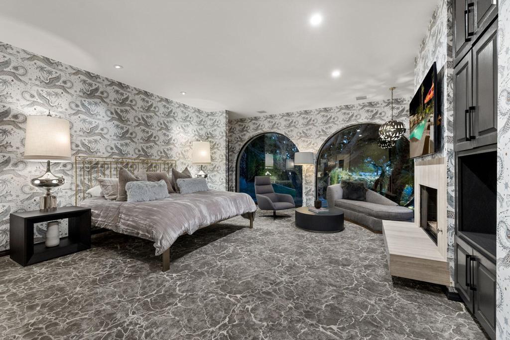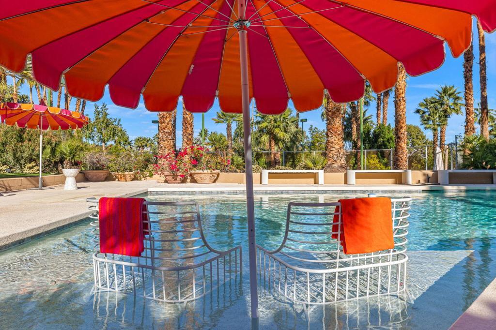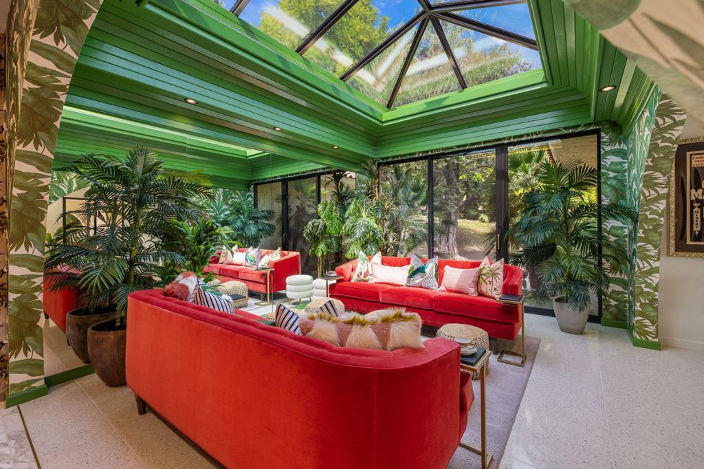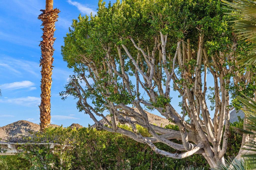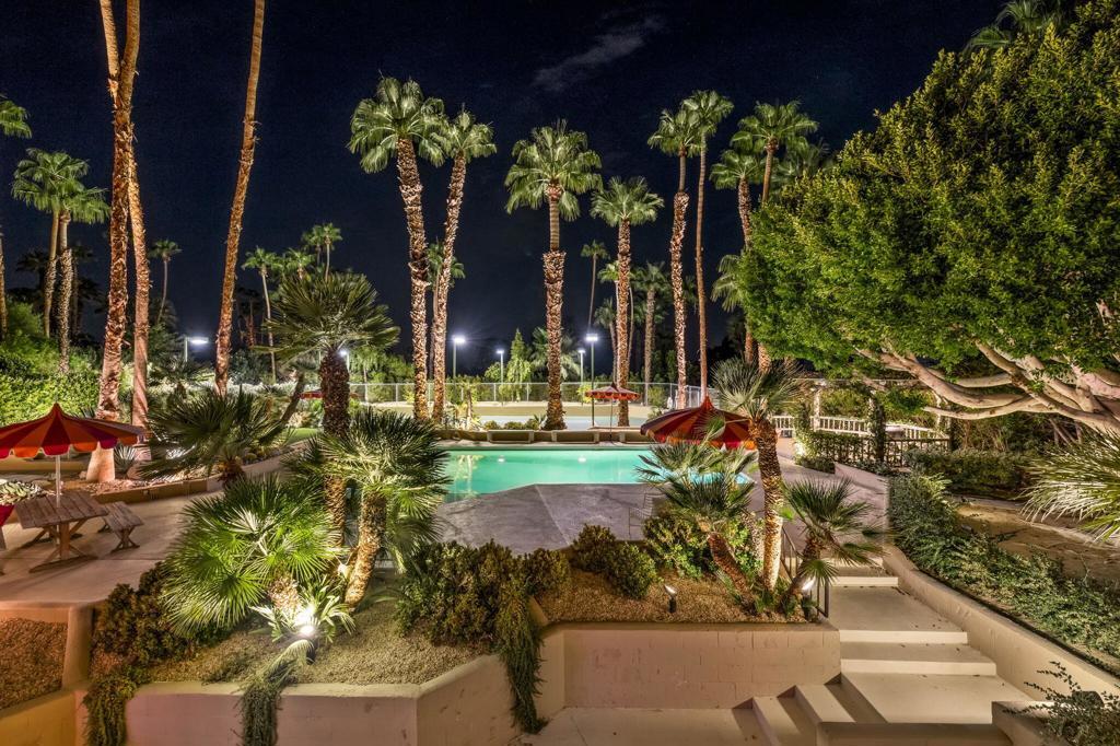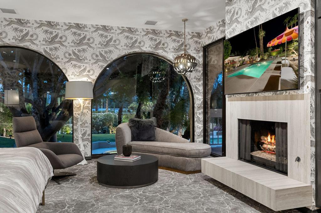 Offered TURNKEY with designer furnishings, decor, and sundries included! Opportunity for a move-in ready desert retreat. Perched at the top of a private cul-de-sac in the guard-gated enclave of Thunderbird Heights lies an expansive oasis that combines timeless architecture with artful design and modern luxury. This sprawling 6-bedroom, 5-bath estate a sanctuary created to inspire, entertain, and indulge. Reimagined by designer Leslie Bock and formerly owned by celebrated songwriter and music producer Michael Masser (and visited by Diana Ross, Barbara Streisand, Neil Diamond, and Whitney Houston) this home carries a legacy of creativity that resonates throughout. Every detail and space is designed to spark connection and wonder. The expansive living area is centered by a dramatic fireplace and retro-chic sunken conversation pit, flowing seamlessly into a sleek wet bar and dining area for lingering evenings with friends. The chef's kitchen is a showpiece boasting terrazzo flooring, floor-to-ceiling custom cabinetry, top-of-the-line appliances, and a large pass-through window to the upper terrace for effortless indoor-outdoor entertaining. Take a moment to relax in the glamorous Versace-wrapped atrium lounge, which feels like a modern-day salon in the French Riviera perfect for morning coffee or afternoon tea. The primary suite is an indulgent hideaway overlooking lush landscaping. It features a spa-inspired bath with a soaking tub, steam shower, sauna, dual vanities, a walk-through custom closet, and a private yoga room. Each ensuite guest room offers a curated, yet easily reimagined escape, and direct outdoor access through its floor-to-ceiling glass sliders. The lower level offers a massive rumpus room with kitchenette, poolside lounge and shower room, additional guest/staff room, laundry, and wine storage. Outdoors, experience a tropical wonderland. Multiple terraces with graceful arches provide both grand entertaining spaces and quiet corners. The resort-style backyard is a private paradise complete with a shimmering pool and spa, a sunken and fully lit tennis court, lounging and dining areas, fragrant fruit trees, irreplaceable Ficus, and more than 50 soaring palms swaying over your sun-soaked desert escape. 70663 Oroville Circle isn't just a residence it's a bold statement in luxury, lifestyle, and design, carrying forward a decades-long legacy of inspiration and creativity.