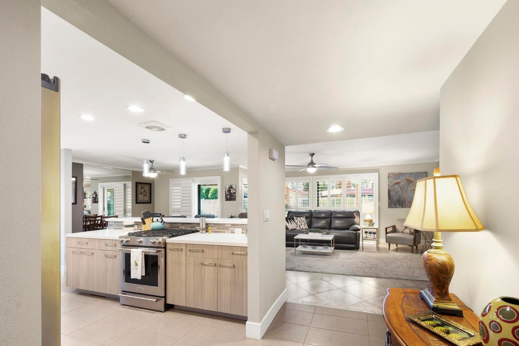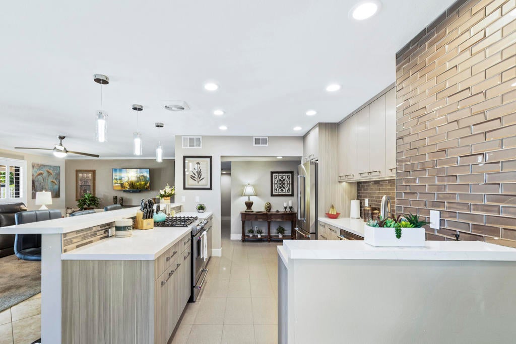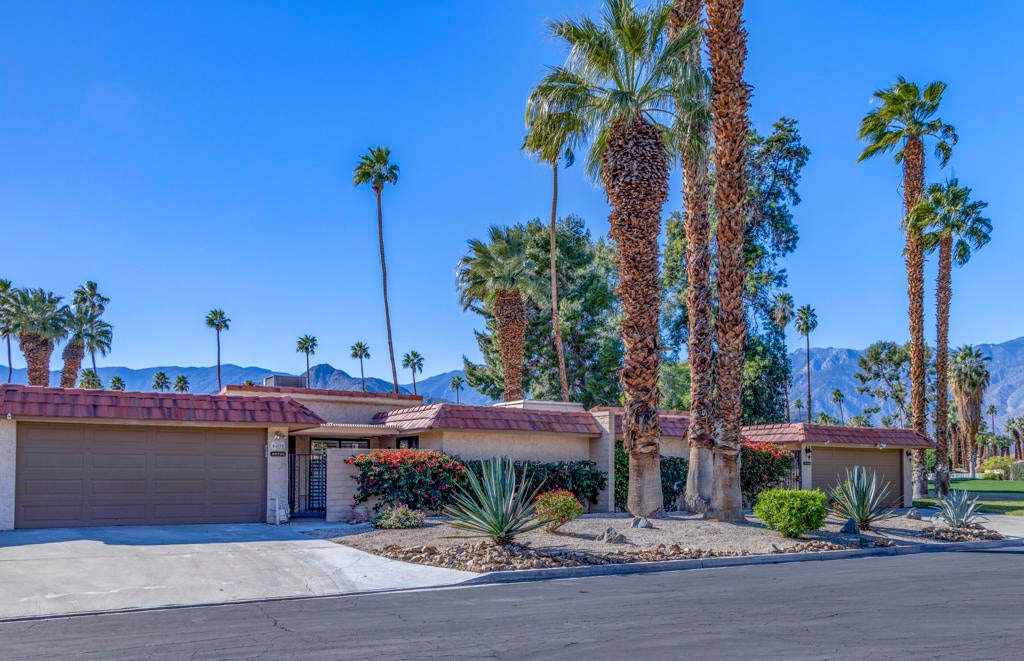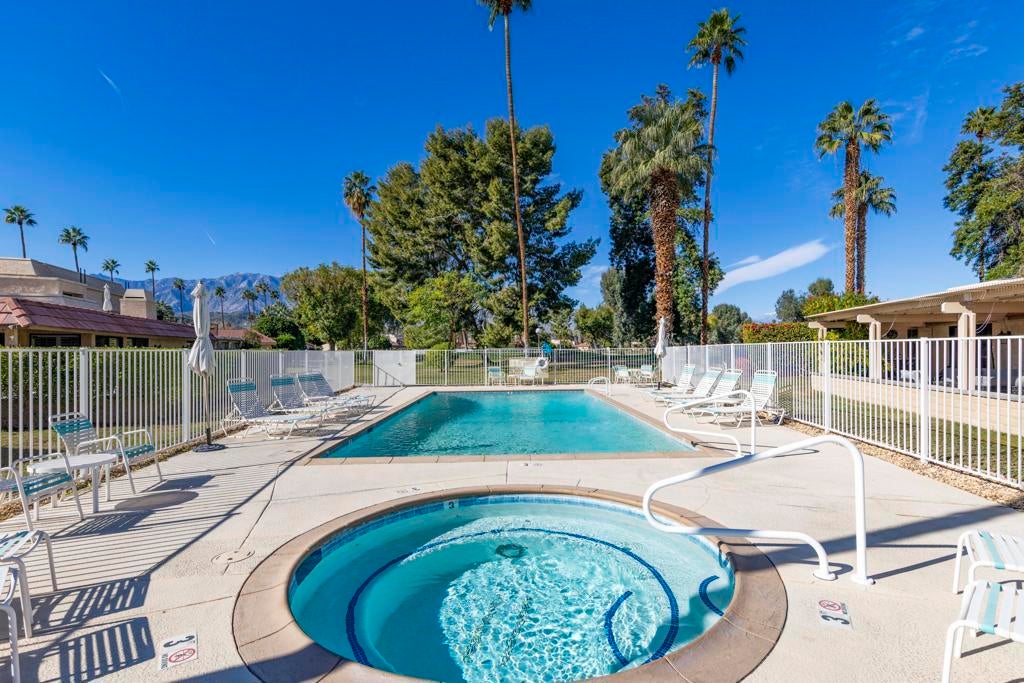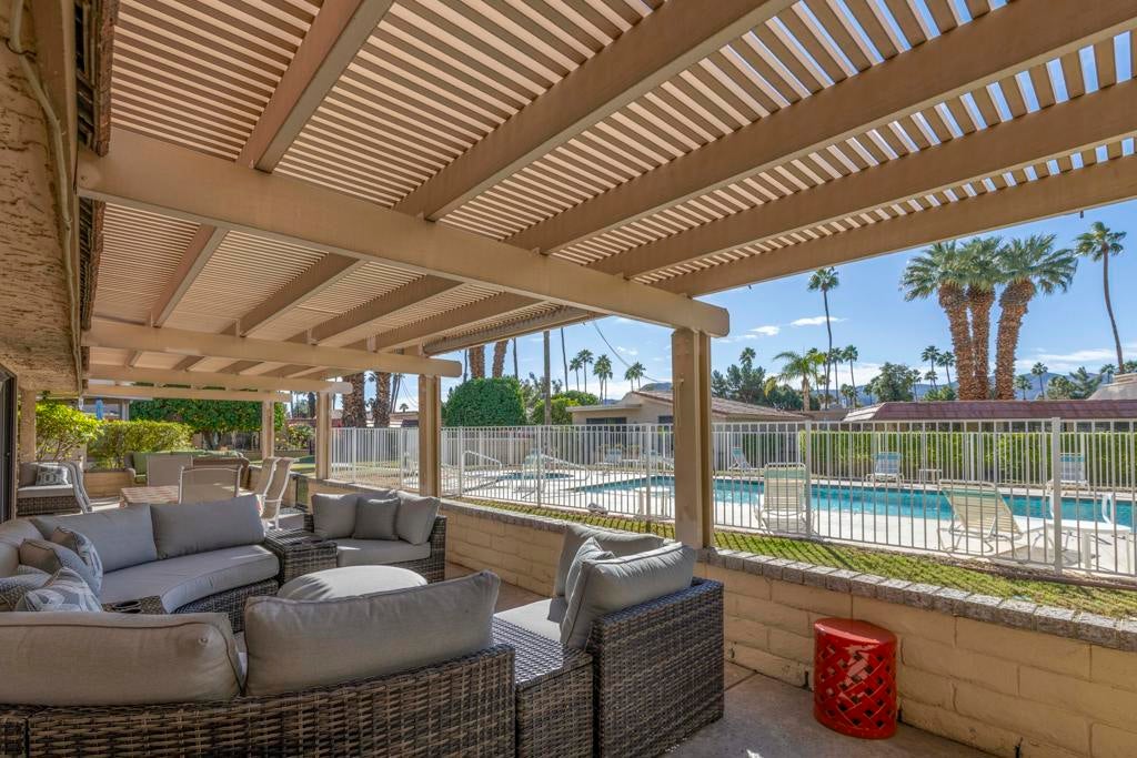 This stylish 1.550 sqft home is turnkey furnished and absolutely move-in ready - You are going to love the 2022 updated and freshly remodeled open concept kitchen with high-end cabinetry, coutertops and flooring with all new appliances. Enjoy beautiful pool and mountain views throughout the living area with ample outdoor seating under the covered lanai. The expansive primary bedroom, with patio access, boasts an upgraded en suite and has plenty of closet space. The den can easily be used as an office or 3rd bedroom for guests. Newer HVAC (2020) Newer water heater (2020) with 2 updated high-quality dual pane sliders by Anderson. Everything in this retreat home has been very well maintained with exceptional attention to detail. Whether you are looking for a gorgeous new place to call home or seeking a polished 2nd home- This is the one you have been waiting for! Cathedral Canyon Country Club is a centrally located gated community that boasts an 18-hole golf course, tennis courts with multiple pools and spas for your enjoyment!