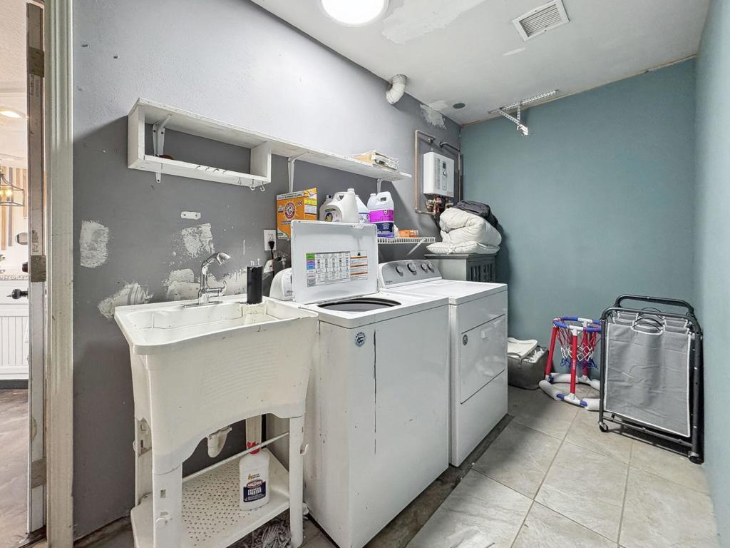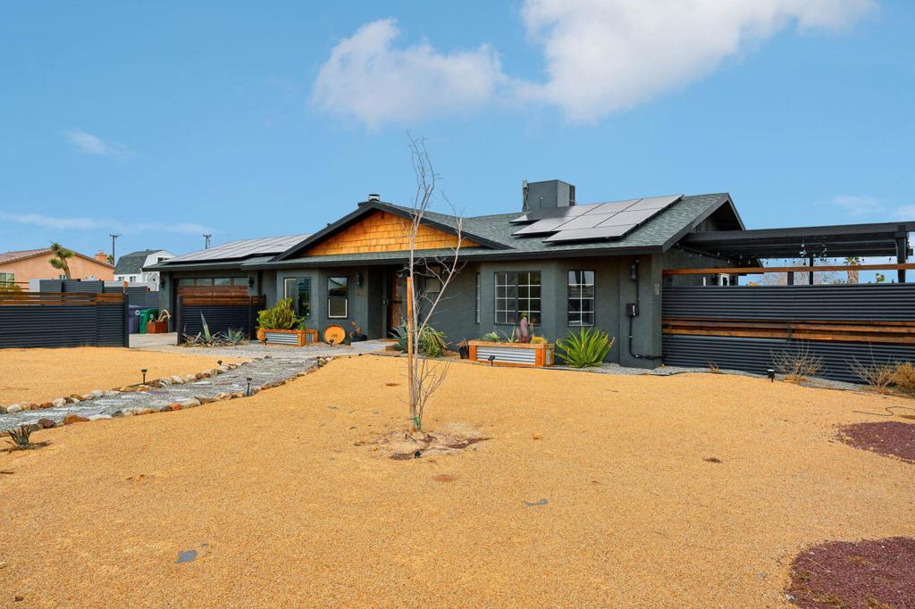 Gorgeous 2 bed, 2 bath featuring great curb appeal, leased Solar Panels, and many updates throughout! Enter into the living room with wood panel feature wall and electric fireplace with raised hearth. The living room opens to the dining area with custom wooden wall design and the remodeled kitchen featuring granite countertops with included refrigerator, light grey cabinetry, and a breakfast bar seating area. The laundry room sits just off of the kitchen with included washer and dryer, and the room also accesses the garage. Both of the bedrooms are generously sized with the primary bedroom offering a private bathroom with dual sink vanity and walk-in shower and there is a slider to the side yard with covered pergola, hot tub and pavers. There is also a 2nd bathroom for guests and the secondary bedroom to share, also featuring a walk-in shower. Enjoy the private backyard with container pool, firepit, covered patio, and beautiful joshua trees! There are also 2 accessory buildings and plenty of flat useable space that is ready to be made your own! Sitting off of a paved road, and currently an Active Vacation Rental, do not miss your opportunity to own this fantastic home!