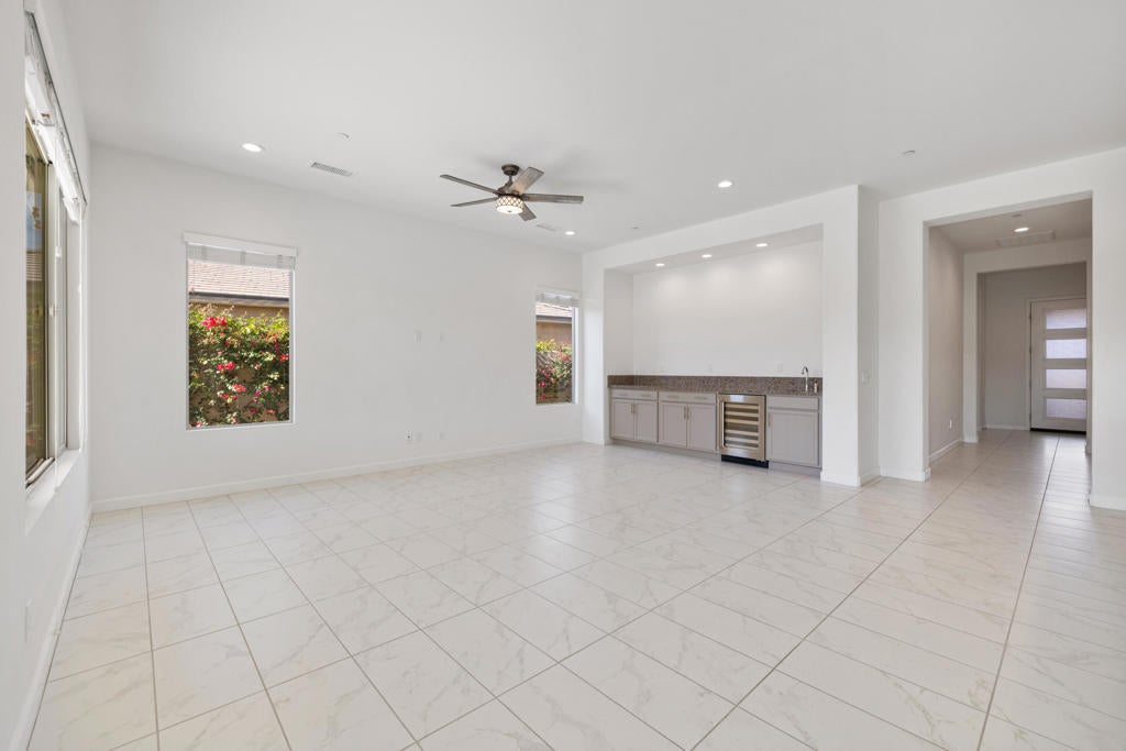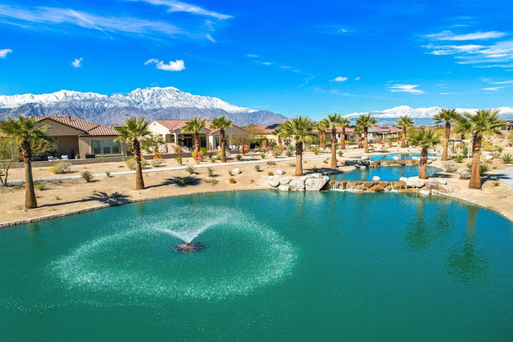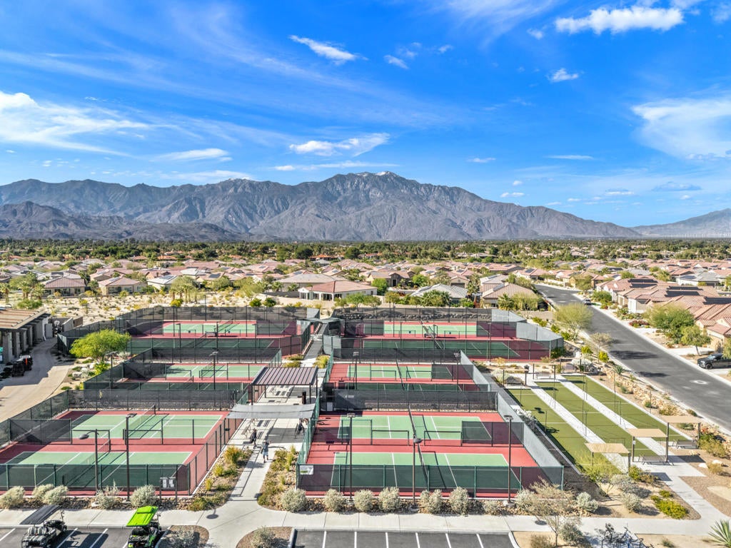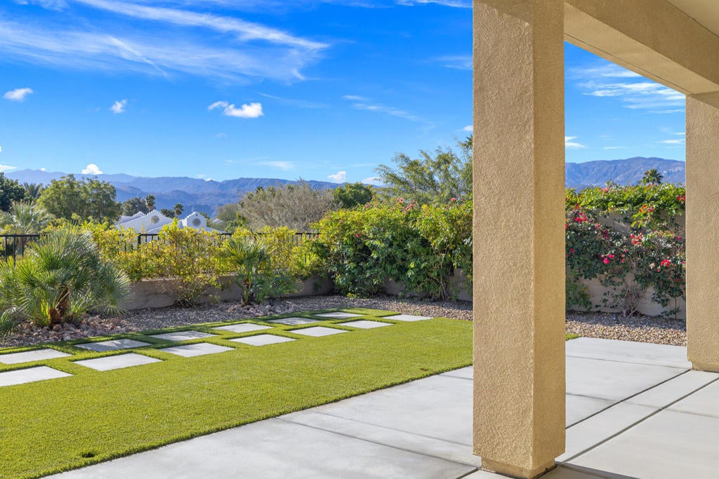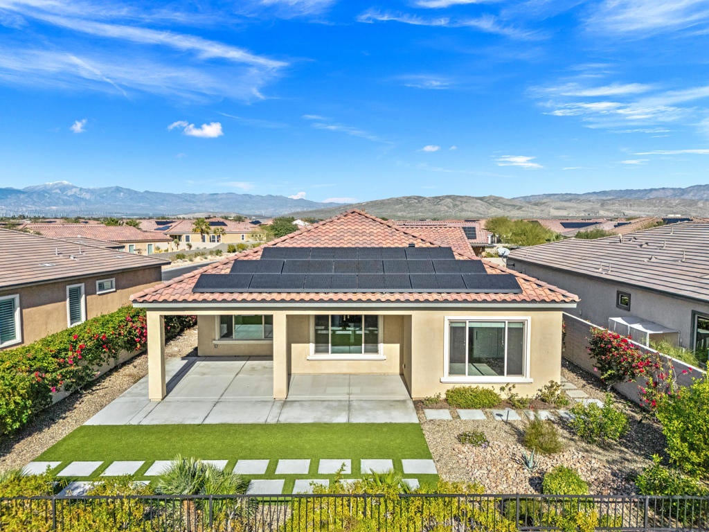 Welcome to Del Webb Rancho Mirage -- a premier 55+ community where resort-style living meets timeless desert elegance.This beautifully maintained 3-bedroom, 2-bath home showcases one of the community's most sought-after floor plans. All bedrooms are generously sized, with the third offering flexible use as a guest room, office, or den.Inside, sophisticated upgrades abound -- custom window treatments, designer ceiling fans, and elegant tile flooring create a refined ambiance throughout. The open-concept great room centers around a chef's kitchen featuring upgraded Whirlpool appliances (including dual ovens), soft-close cabinetry, quartz countertops with full backsplash, pendant-lit island seating, and a walk-in pantry.Dual upgraded sliding doors lead to an extended covered patio and expanded hardscape, ideal for entertaining or quiet evenings enjoying mountain views, the palm trees of the adjoining Westin Resort during the day, and twinkling lights at night.The primary suite is a private retreat, offering a spacious layout, dual quartz-topped vanities, premium cabinetry, upgraded lighting, a large walk-in shower with quartz surround, and a generous walk-in closet. Guest bedrooms and the flex space are thoughtfully separated for optimal privacy.Additional highlights include leased solar (approx. $113/month), an expanded laundry room with utility sink and cabinetry, and an oversized 2-car garage with extra space for a golf cart or additional storage. Residents of Del Webb Rancho Mirage enjoy a vibrant, active lifestyle with access to world-class amenities -- a state-of-the-art clubhouse, resort pool and spa, fitness center, pickleball, tennis, bocce ball, and more.Experience the perfect blend of luxury, comfort, and community living -- all within one of the desert's most desirable 55+ destinations.