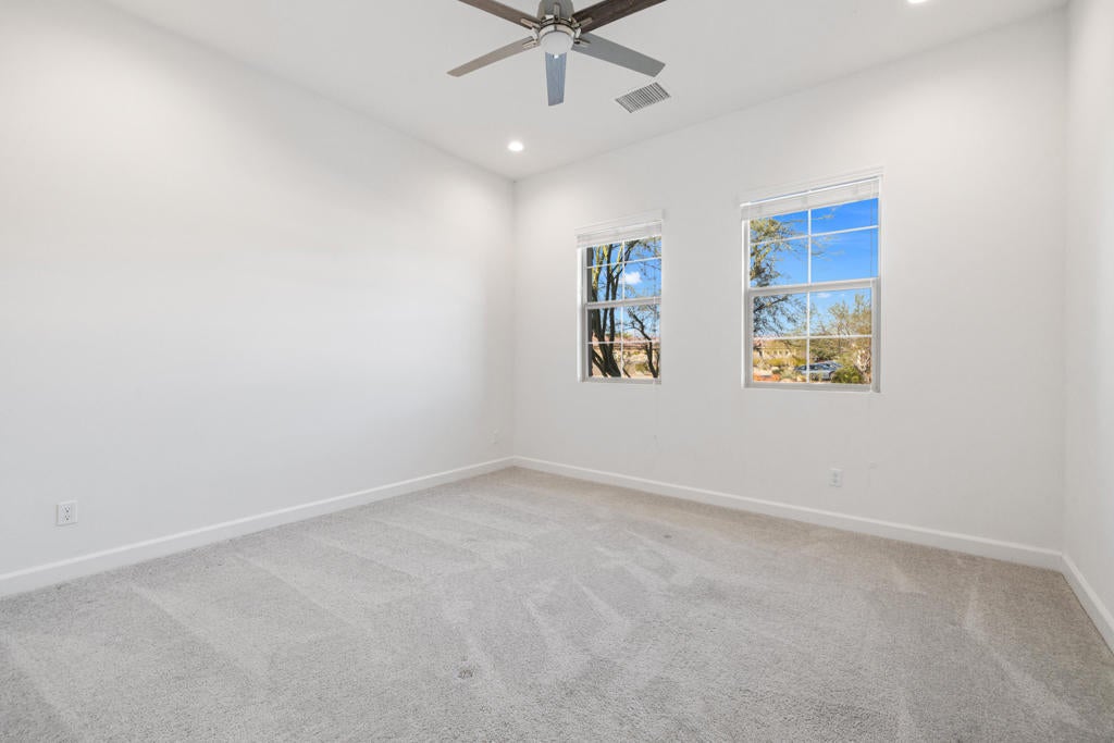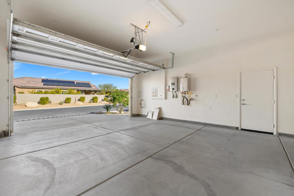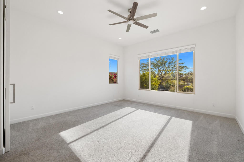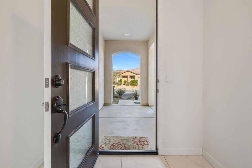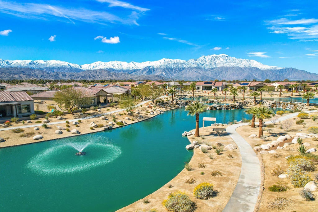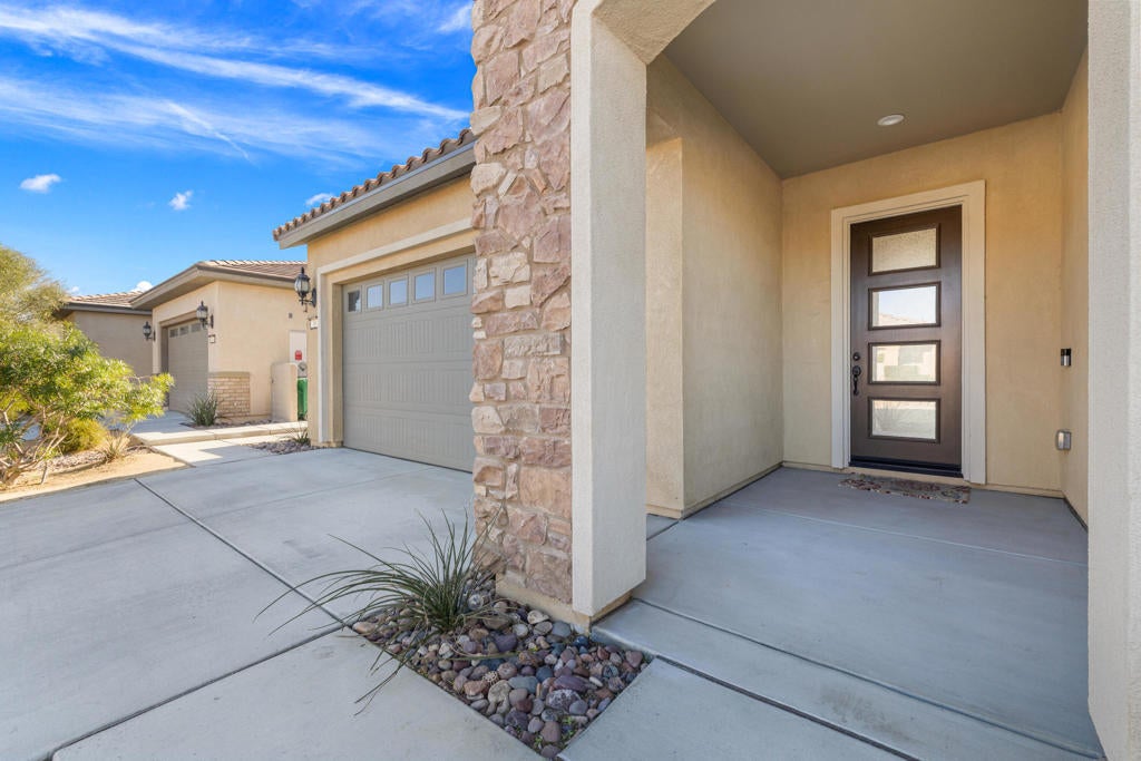 Welcome to Del Webb Rancho Mirage -- a premier 55+ community where resort-style living meets timeless desert elegance.This beautifully maintained 3-bedroom, 2-bath home showcases one of the community's most sought-after floor plans. All bedrooms are generously sized, with the third offering flexible use as a guest room, office, or den.Inside, sophisticated upgrades abound -- custom window treatments, designer ceiling fans, and elegant tile flooring create a refined ambiance throughout. The open-concept great room centers around a chef's kitchen featuring upgraded Whirlpool appliances (including dual ovens), soft-close cabinetry, quartz countertops with full backsplash, pendant-lit island seating, and a walk-in pantry.Dual upgraded sliding doors lead to an extended covered patio and expanded hardscape, ideal for entertaining or quiet evenings enjoying mountain views, the palm trees of the adjoining Westin Resort during the day, and twinkling lights at night.The primary suite is a private retreat, offering a spacious layout, dual quartz-topped vanities, premium cabinetry, upgraded lighting, a large walk-in shower with quartz surround, and a generous walk-in closet. Guest bedrooms and the flex space are thoughtfully separated for optimal privacy.Additional highlights include leased solar (approx. $113/month), an expanded laundry room with utility sink and cabinetry, and an oversized 2-car garage with extra space for a golf cart or additional storage. Residents of Del Webb Rancho Mirage enjoy a vibrant, active lifestyle with access to world-class amenities -- a state-of-the-art clubhouse, resort pool and spa, fitness center, pickleball, tennis, bocce ball, and more.Experience the perfect blend of luxury, comfort, and community living -- all within one of the desert's most desirable 55+ destinations.
