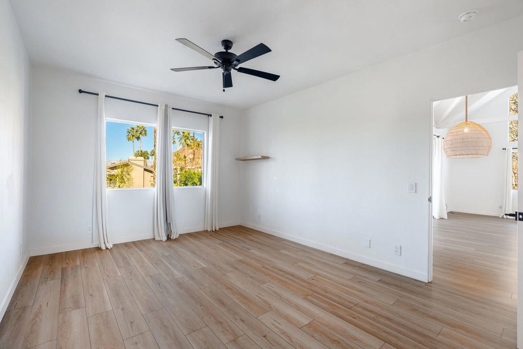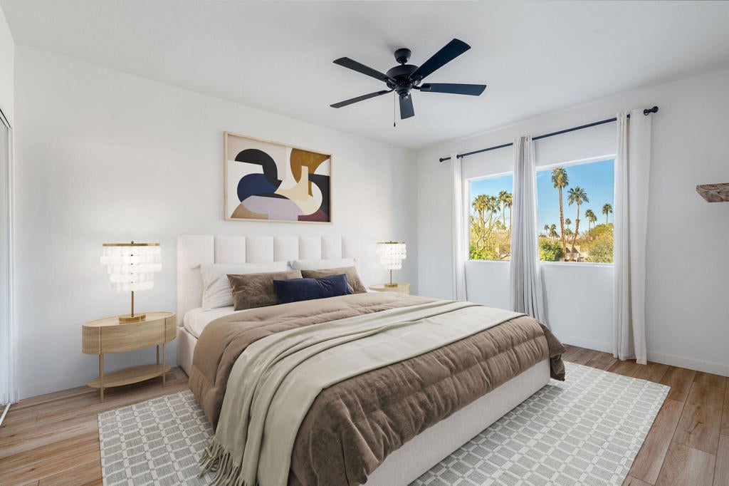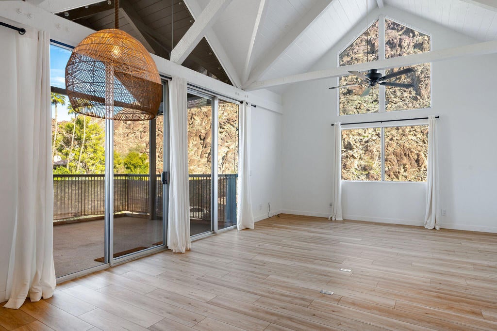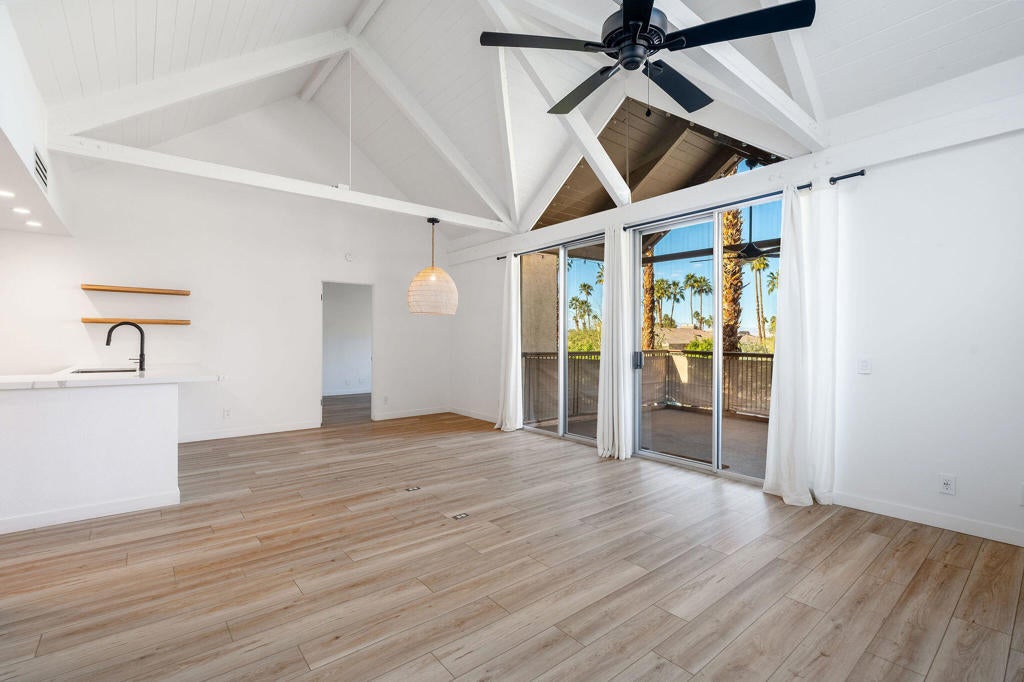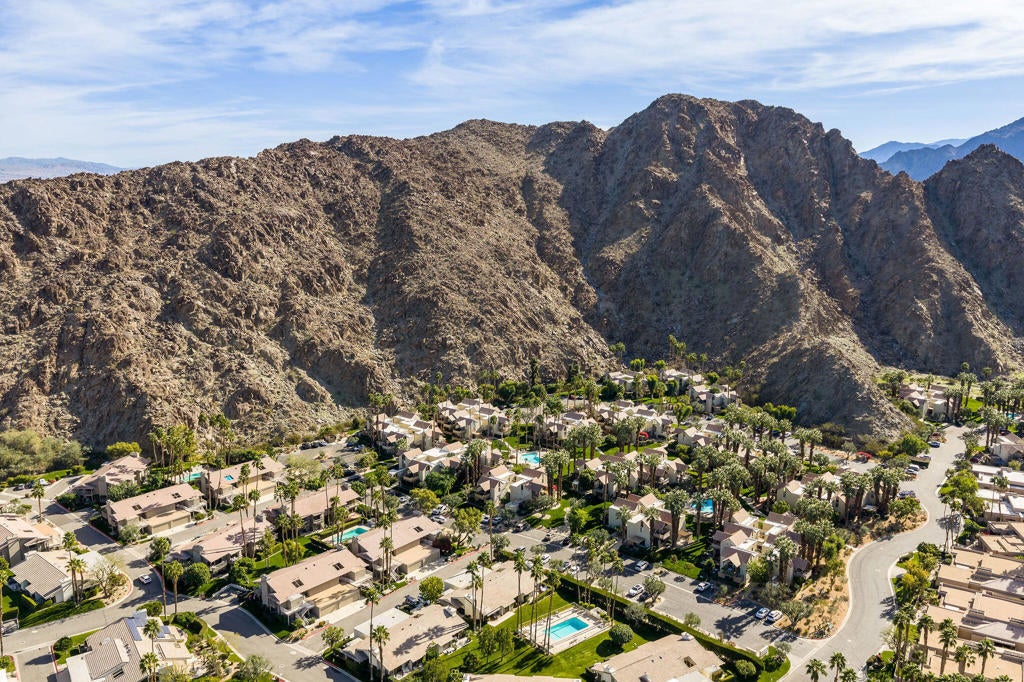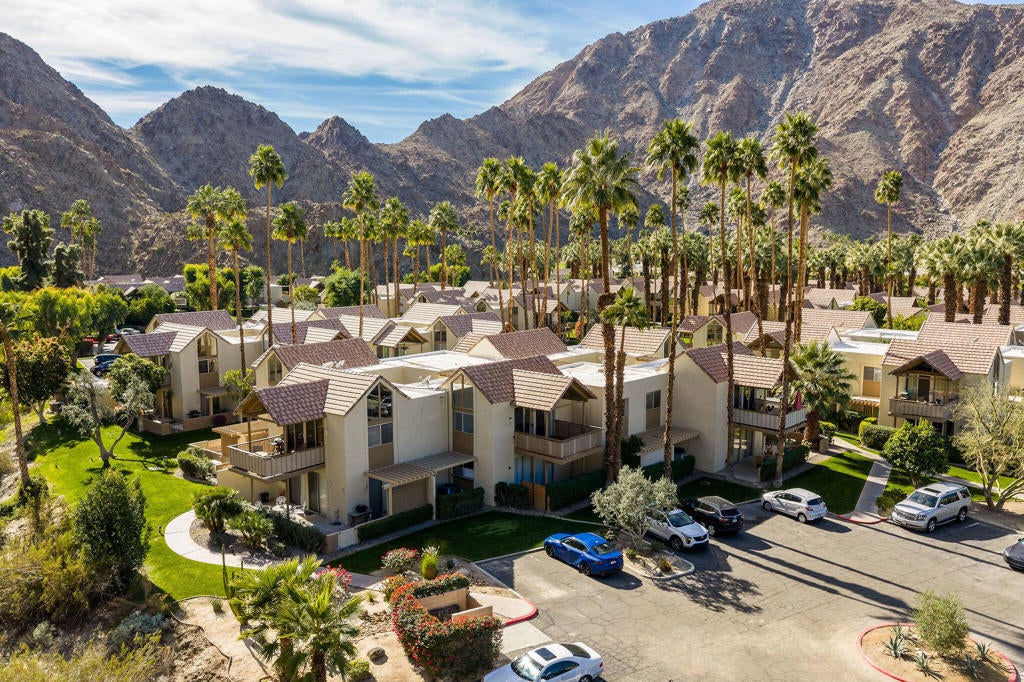 Have you ever dreamed of living in a treehouse? This is about as close as it gets in Southern California! This rare upper-level Mountain Cove residence is ideally situated against the mountains and has been fully remodeled--and even better, it is located on FEE LAND, meaning you own the land.Upper units in Mountain Cove are highly sought after for their vaulted, beamed ceilings, abundant windows and sliders, and, of course, the breathtaking views. Nestled in the heart of Indian Wells, Mountain Cove is surrounded by dramatic mountain scenery, lush palm trees, and sparkling community pools.Inside, this stylish remodel features a freshly painted interior, luxury vinyl plank flooring, quartz slab countertops with waterfall edge. The open-concept kitchen has been reimagined with slow-close white shaker cabinetry, modern hardware, trendy backsplash, all appliances, and a custom pantry closet. Both bathrooms have been updated with matching vanities for a cohesive design, and the guest bath includes a brand-new stackable washer and dryer.The spacious primary suite offers incredible views and a convenient mini office area. This is not a studio floor plan--enjoy a full living and dining area, a private primary suite, and two bathrooms.Craving privacy and a peaceful escape? Relax on your private deck while soaking in the stunning mountain views. Indian Wells residents enjoy IID electric for lower utility bills, plus exclusive city benefits, including discounts at participating restaurants, hotels, spas, and golf courses, along with complimentary use of the gym at the Hyatt Regency Indian Wells Resort.YES--this is a short-term rental friendly community with a 7-day minimum, making it an excellent full-time residence, second home, or investment opportunity.