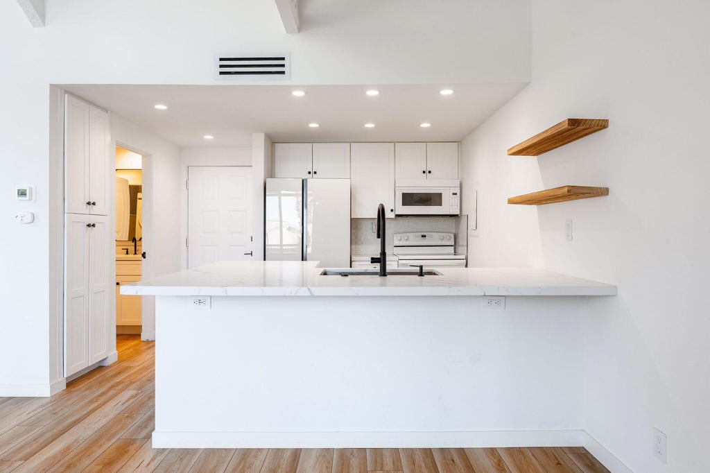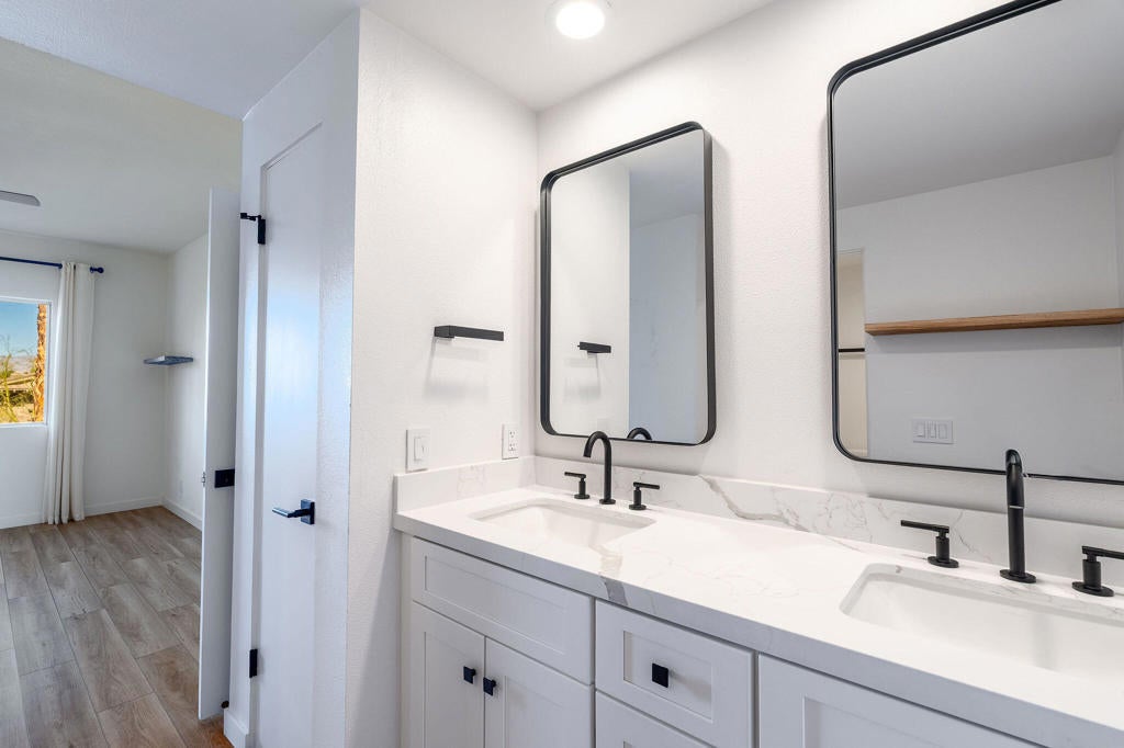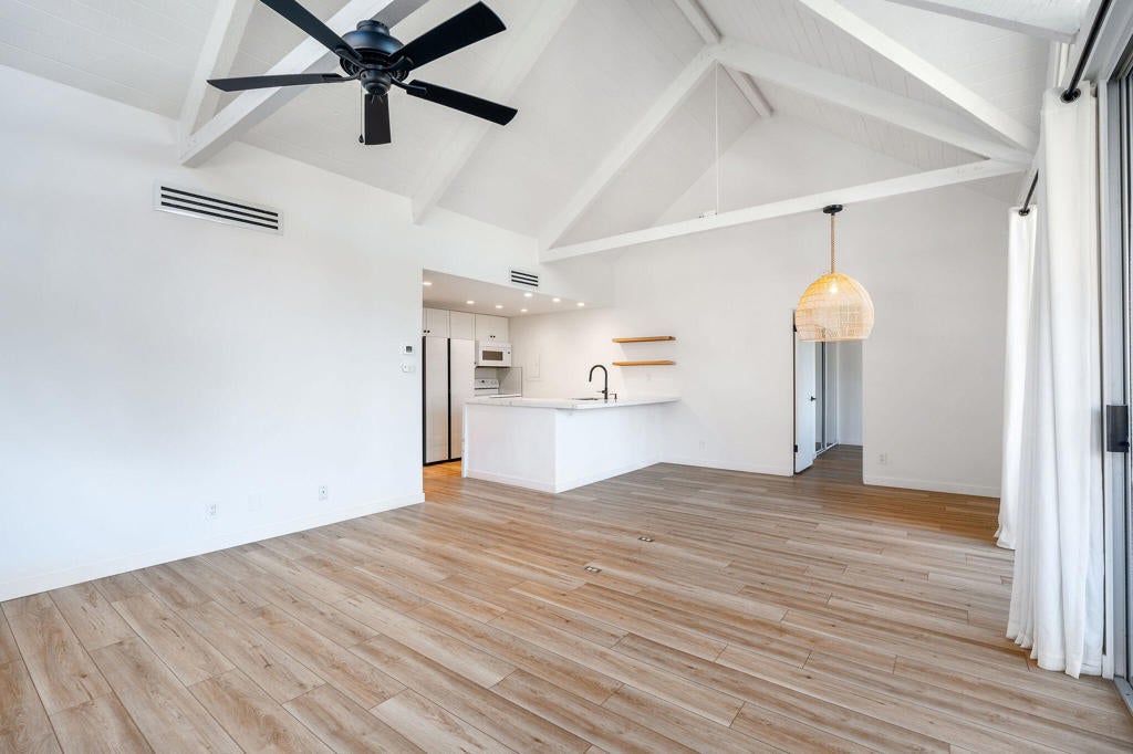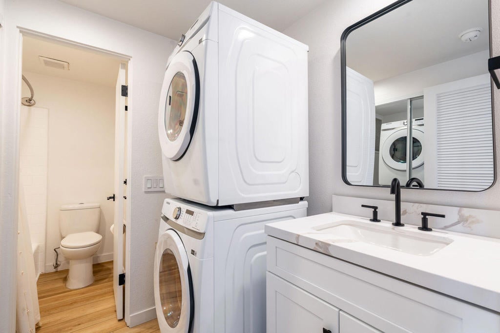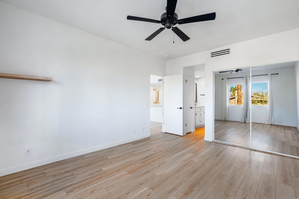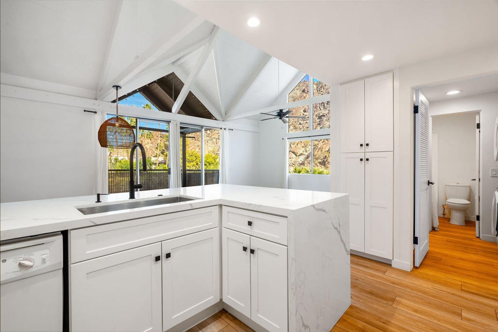 Have you ever dreamed of living in a treehouse? This is about as close as it gets in Southern California! This rare upper-level Mountain Cove residence is ideally situated against the mountains and has been fully remodeled--and even better, it is located on FEE LAND, meaning you own the land.Upper units in Mountain Cove are highly sought after for their vaulted, beamed ceilings, abundant windows and sliders, and, of course, the breathtaking views. Nestled in the heart of Indian Wells, Mountain Cove is surrounded by dramatic mountain scenery, lush palm trees, and sparkling community pools.Inside, this stylish remodel features a freshly painted interior, luxury vinyl plank flooring, quartz slab countertops with waterfall edge. The open-concept kitchen has been reimagined with slow-close white shaker cabinetry, modern hardware, trendy backsplash, all appliances, and a custom pantry closet. Both bathrooms have been updated with matching vanities for a cohesive design, and the guest bath includes a brand-new stackable washer and dryer.The spacious primary suite offers incredible views and a convenient mini office area. This is not a studio floor plan--enjoy a full living and dining area, a private primary suite, and two bathrooms.Craving privacy and a peaceful escape? Relax on your private deck while soaking in the stunning mountain views. Indian Wells residents enjoy IID electric for lower utility bills, plus exclusive city benefits, including discounts at participating restaurants, hotels, spas, and golf courses, along with complimentary use of the gym at the Hyatt Regency Indian Wells Resort.YES--this is a short-term rental friendly community with a 7-day minimum, making it an excellent full-time residence, second home, or investment opportunity.