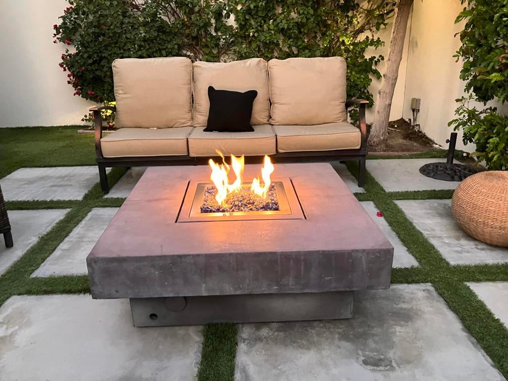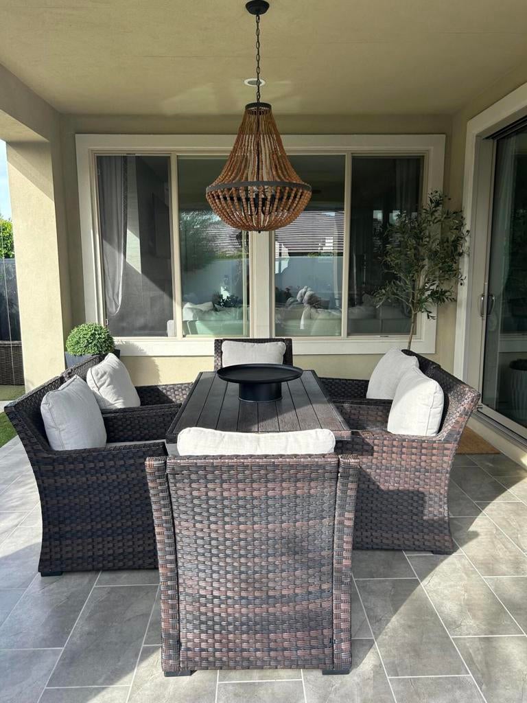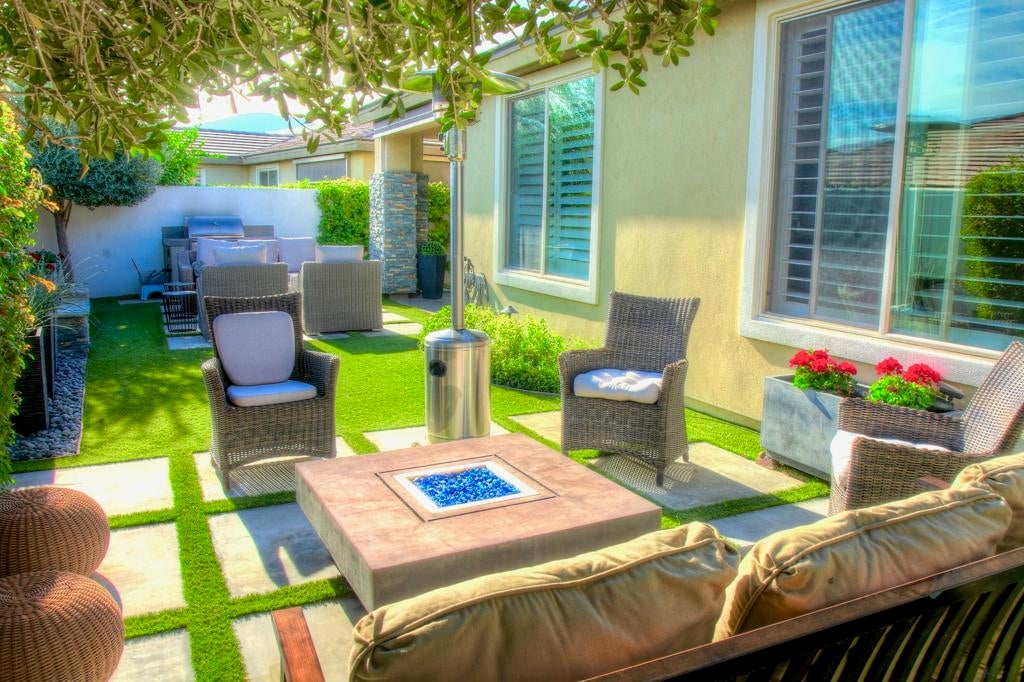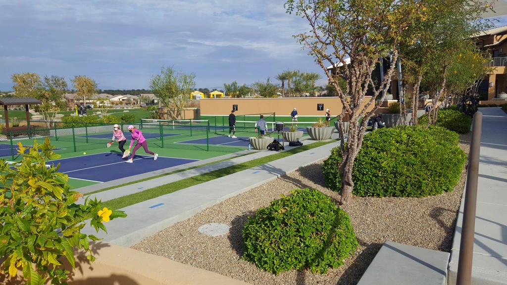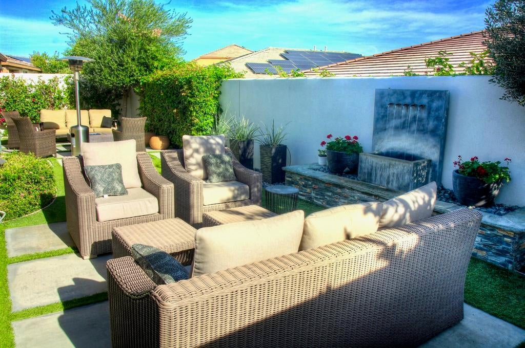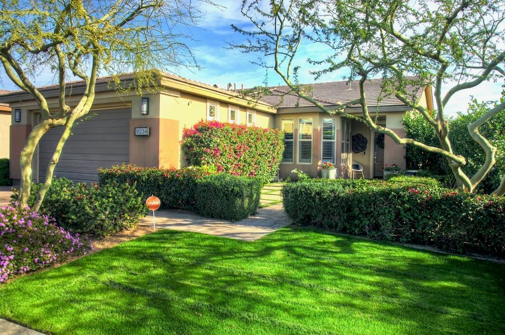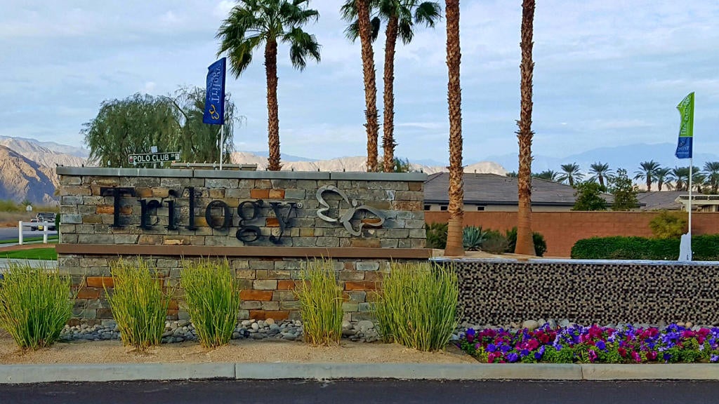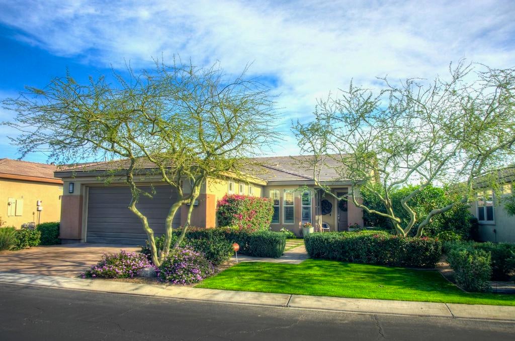 Start the new year with the perfect desert retreat! This spectacular home is located in the 55+ section of the community that's a short distance to the clubhouse and community amenities. This Monaco model with over 1600SF has 2 bedrooms and 2 bathrooms. Upgrades in this contemporary home include fireplace in the great room, firepit in back yard, and soothing fountains in entry courtyard and backyard. The home features solar power with approximately 9+ years remaining on prepaid lease. The eat in Kitchen includes Jenn-Aire appliances. Elegant finishes include quartz countertops, custom backsplash, and upgraded cabinets with abundant storage. The open living space includes great room, dining room, den, and kitchen. Access the patio and rear yard from a large rolling wall of glass. The home features recessed lighting, designer tile flooring throughout primary living areas in home, upgraded carpet in bedrooms, designer 2 tone paint finishes and more! The primary bath has an oversized tiled shower with bench, dual sinks, and quartz countertops. If you choose access/membership to the clubhouse, club amenities include tennis/pickleball courts, fitness center, resort/lap/fitness pools & spa, poker/billiards room & artisan studio. Community also features putting green, bocce ball court, large chess game area, and walking trails. Minimum 6 months or longer lease term. Furnishings may differ from current furniture, will include at a minimum living room items, 2 lamps, 2 beds, kitchen table/chairs, 4 TVs, outdoor table/6 chairs. Call for details.