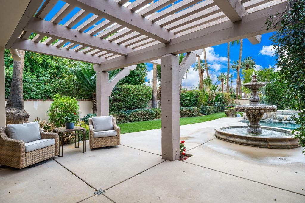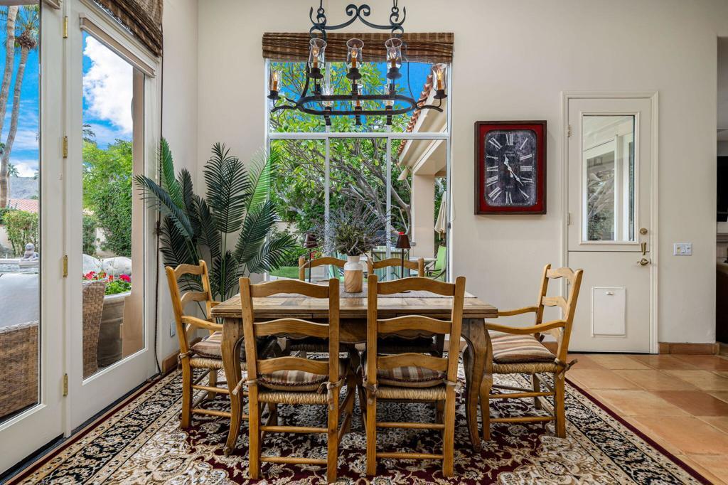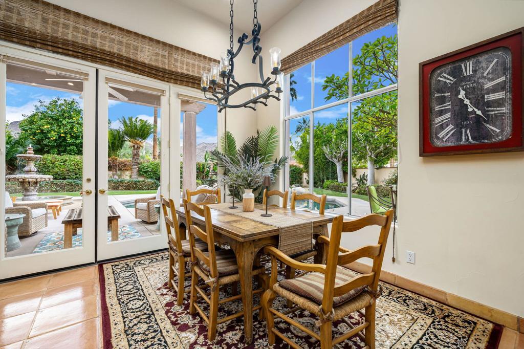 This property offers stunning views of the southern mountains and features impeccably maintained landscaping. The home includes four bedrooms--one with built-in cabinetry suitable for use as an office--and four ensuite bathrooms, in addition to two half baths (a powder room and one conveniently located near the pool area). Upon entry, a step-down living room with a fireplace, high ceilings, and dramatic windows creates an inviting atmosphere. Adjacent is a formal dining room complete with a wet bar. The kitchen is equipped with granite countertops, stainless steel appliances, and a central island, adjoining both a breakfast area and a spacious den with a fireplace. The master suite features French doors opening onto a covered patio that overlooks the serene private yard. The master bath provides a generous walk-in closet, double vanities, and a sauna. Many rooms offer views of the expansive, lush backyard, which boasts a tropical-style pool and spa with vistas of Mt. Eisenhower. Call for your private showing.