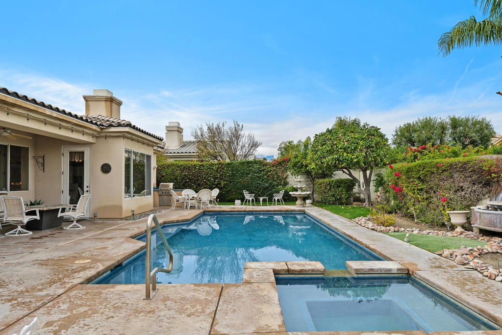 Welcome to 2 Othello. Set on a desirable corner lot offering privacy in the desirable gated Victoria Falls, this Rancho Mirage home blends comfort, style, and over 3,400 square feet of living space. The popular Marquis Plan with a front courtyard welcomes you inside, where vaulted ceilings in the foyer set the tone for light-filled interiors. A wall of sliding glass doors open from the main living areas, creating seamless indoor-outdoor flow. Both formal and informal spaces are here to enjoy, with a fireplace and anchoring the living room and a second fireplace warming the family room with a door leading out to the backyard. The gourmet kitchen features a large walk-in pantry, center island, a breakfast bar, and plenty of storage. The ensuite primary retreat enjoys great separation from guest bedrooms and opens directly to the patio and pool access. The spa-like bath includes a separate tub and shower and the suite is finished with a generous walk-in closet. The guest wing offers a den/office with built-in bookcases which can be easily turned into a bedroom, there are two additional bedrooms separated by a Jack n' Jill full bath. Positioned off this wing of the house/hallway features a utility/laundry room with sink and direct access to the garage for everyday convenience. Outdoors, the ultra-private backyard showcases a pool and spa, a covered patio area, and a built-in BBQ perfect for entertaining. A spacious three-car garage provides ample room for vehicles, storage, or even a golf cart. The detached Casita is a spacious one bedroom and one bath in the front courtyard breezeway. Community tennis, pickleball, and basketball courts are just a short hop away. Ideally situated close to shopping entertainment, dining, Eisenhower Medical Center, El Paseo, and The River. This home offers a rare blend of comfort, convenience, and its exceptional value.