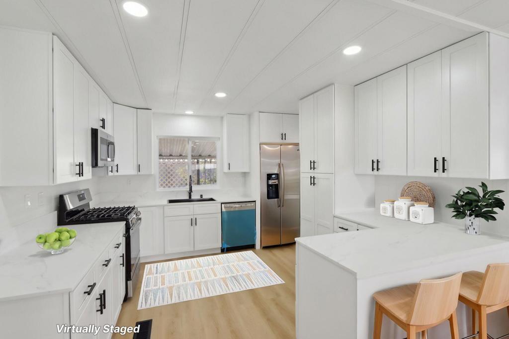 COMPLETE INTERIOR REMODEL! This beautifully reimagined home blends modern upgrades with open, comfortable living. Seller will install 433 - The 433A PERMANENT FOUNDATION enables Conventional, FHA/VA and Reverse Mortgage Financing. The expanded kitchen and vaulted ceilings create a bright, airy feel that connects seamlessly to the family and dining rooms, perfect for both daily living and entertaining. Luxury vinyl flooring, quartz countertops, stainless steel appliances, energy-efficient windows, and recessed lighting are found throughout. From the living room and raised front porch, enjoy sweeping Southwestern mountain views. The chef's kitchen flows to a spacious family room with slider access to the front patio, while the dining room offers built-in cabinetry for added storage and display. The primary suite features a spa-inspired bath with shower stall, free-standing soaking tub, and generous vanity space. The laundry room is designed for convenience with a sink and extensive cupboard storage. Sky's Haven is one of Desert Hot Springs' premier 55+ gated communities, featuring three pools, spa, clubhouse, fitness center, sauna, billiards, and park area, along with a full calendar of social and recreational activities. Best of all, you OWN THE LAND with low HOA dues, and all utilities are billed through the HOA. Ideally located just 15 minutes from Palm Springs and 20 minutes from Morongo Casino Resort & Spa in Cabazon, this home offers both comfort and lifestyle in a highly desirable setting.