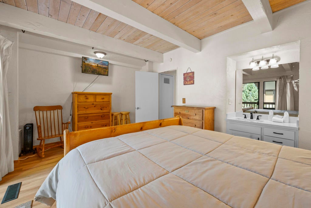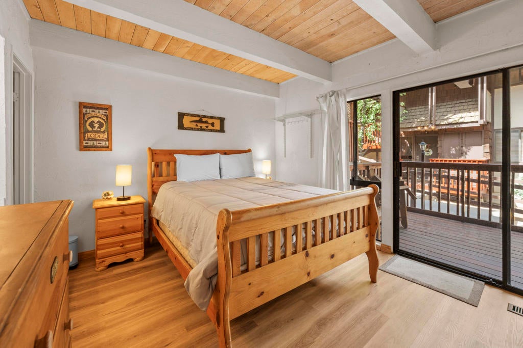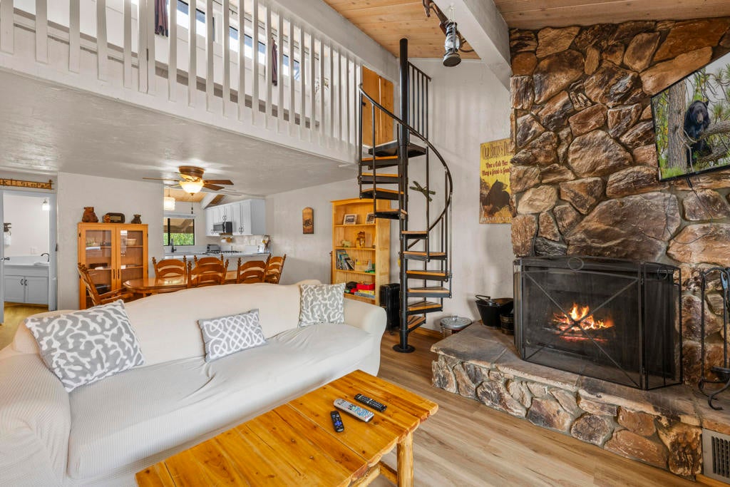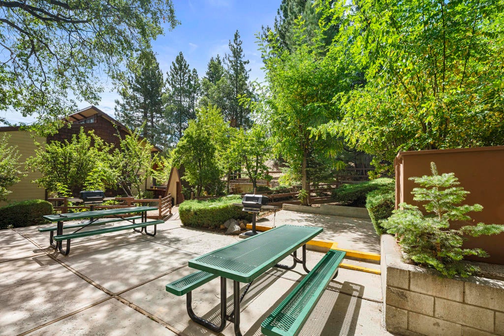 Don't miss your chance to own at the base of Snow Summit! This turnkey townhouse offers the perfect combination of location, comfort, and convenience. Just steps from the ski slopes, mountain bike trails, and a short drive to Big Bear Lake and the Village, it's an ideal retreat for year-round adventure. The spacious layout includes 2 bedrooms, 1.5 baths, plus a versatile loft for storage or additional sleeping space. The living room features vaulted ceilings and a wood-burning fireplace, creating the perfect apres-ski gathering spot. Enjoy two private patios--an upper deck off the living room for outdoor dining with mountain views, and a lower patio off the primary bedroom for quiet relaxation. The updated kitchen features granite countertops, a breakfast bar, and is open to additional dining area. Durable and attractive laminate flooring throughout. The HOA covers water, trash, Wi-Fi, snow removal, and exterior upkeep, so you'll enjoy all the benefits of mountain living without the hassle of maintenance. Community amenities include a seasonal in-ground heated pool, recreation room, and BBQ area. A huge bonus is the 2 parking passes that allow direct access to the condo lot right at Snow Summit--unmatched convenience for skiing, boarding, hiking, or biking. Whether you're seeking a weekend escape, vacation rental, or a place to call home, this Snow Summit gem checks all the boxes. Start making lasting mountain memories today.