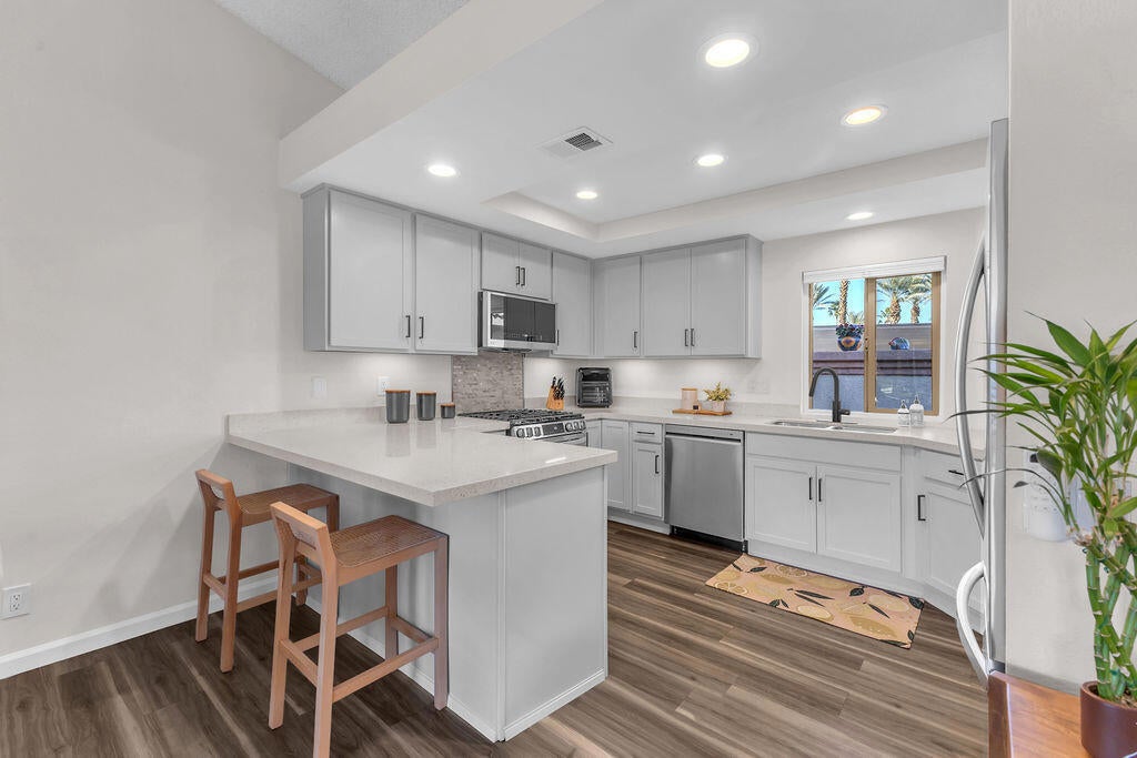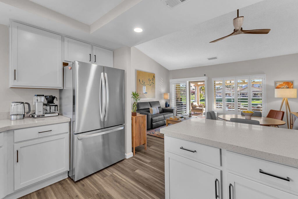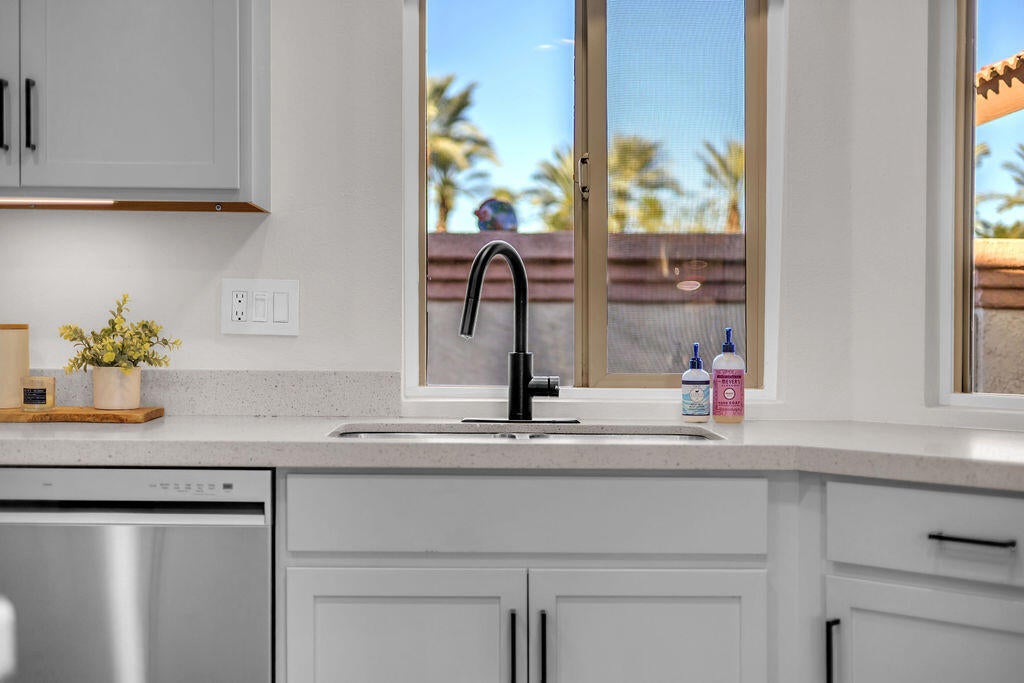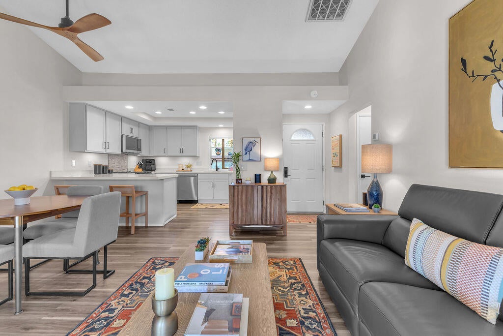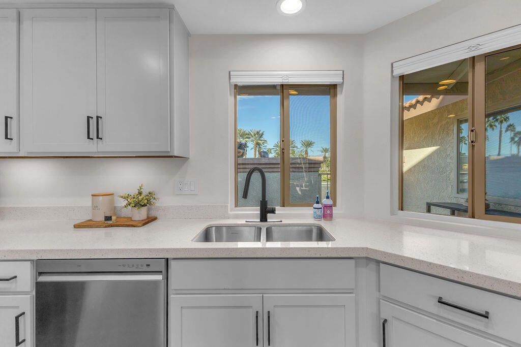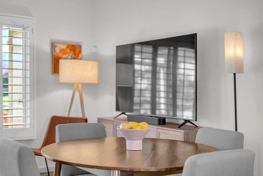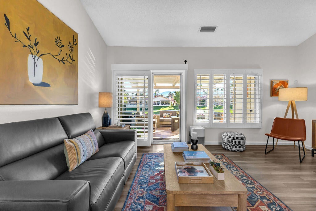 Imagine waking up to a panorama that takes your breath away--180-degree views of lush fairways, shimmering ponds, and the majestic Santa Rosa, San Jacinto, and Chocolate Mountains framing the horizon. Picture yourself savoring morning coffee or your favorite evening libation from the south-facing wraparound patio as the desert sun paints the sky in vivid hue. Imagine stepping inside a home that feels as fresh and inviting as the view. Vaulted ceilings soar above a space filled with natural light, enhanced by upgraded windows and elegant plantation shutters. The kitchen gleams with quartz counters, LG appliances, and LED lighting, while newer mechanicals ensure peace of mind. Every detail whispers quality and comfort. Imagine welcoming friends in your private entry courtyard, or relaxing in the adjacent pool and spa, thoughtfully sunken for maximum privacy and convenience. This is a location unlike any other in the community--special, serene, and perfectly positioned. From first tee to last light, Oasis Country Club weaves sport, social life, and serenity into a rhythm that feels unmistakably like vacation! When you're ready to explore beyond the gates, you're just minutes from world-class experiences: the Indian Wells Tennis Garden, home of the BNP Paribas Open; the charm of La Quinta; and the luxury shopping and dining of El Paseo. Now, stop imagining. Make it yours. This is more than a home--it's a lifestyle, a sanctuary, and a rare opportunity to turn your dream into reality! OWNED.