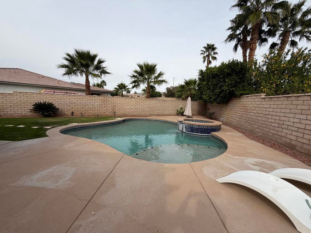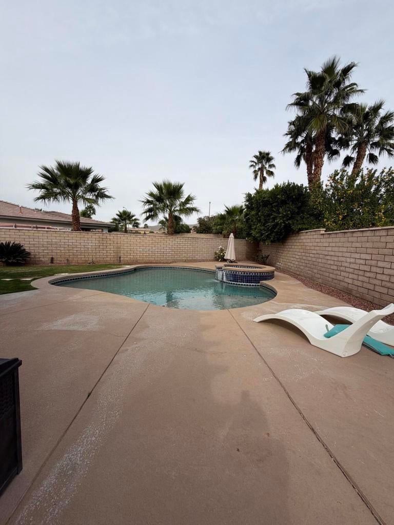 Welcome to the sought-after Desert Trace community. This well-appointed home offers an open floor plan featuring 4 bedrooms, 3 bathrooms, a formal dining room, and a private office. Two secondary bedrooms are connected by a Jack-and-Jill bathroom. The spacious primary suite includes a large walk-in closet with a built-in cabinet.Freshly painted throughout the entire home, including garage walls and floors, with new baseboards throughout.The home features laminate and tile flooring throughout and has been recently updated with fresh interior paint. The kitchen is beautifully designed with granite countertops, an oversized center island, built-in stove, microwave, and oven. Additional highlights include a laundry room with built-in storage and a 2-car garage.The oversized backyard is ideal for entertaining and includes a Pebble Tec pool and spa, covered patio, and fire pit. The property includes a leased solar system at $149.16 per month, providing significant savings on electricity costs.