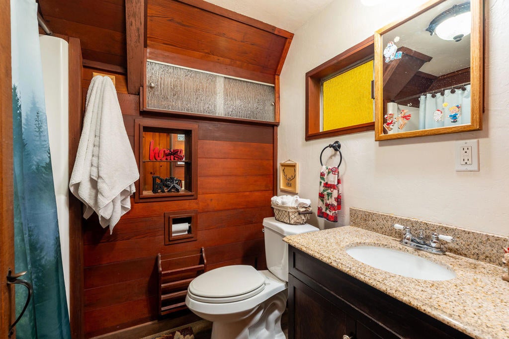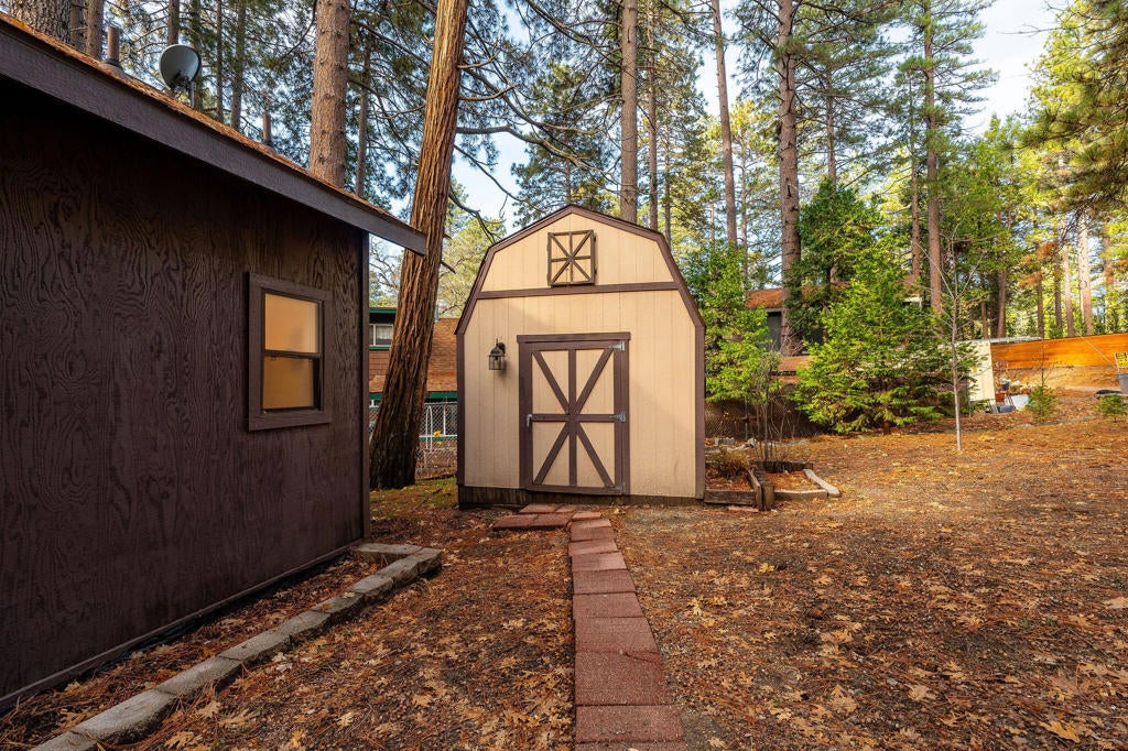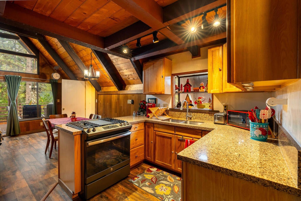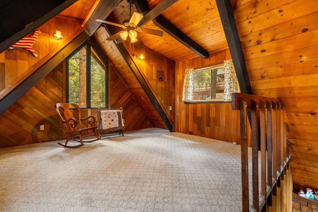 A-Frame Cabin with Loft, Deck & JacuzziClassic A-frame style cabin built in 1979 featuring vaulted wood ceilings with exposed beams and an open-concept great room. The kitchen includes quartz countertops and solid wood cabinetry and opens to the dining and living areas. A wood-burning stove anchors the living space, with propane heat for year-round comfort.The second bedroom is located upon entry, alongside a full bathroom. A loft overlooks the great room, providing flexible use space. The primary bedroom is located just a few steps down and offers access to a deck with jacuzzi and includes a 3/4 bathroom. The easy going and fun layout if memorableApproximately 1,200 sq ft of living space. The property includes storage sheds and a fenced backyard, along with two-car on-site parking.Located a mere three miles from Idyllwild town center festivities, yet far enough away to enjoy solitude and forest views. Invite your family and friends. Call directly to schedule your showing.