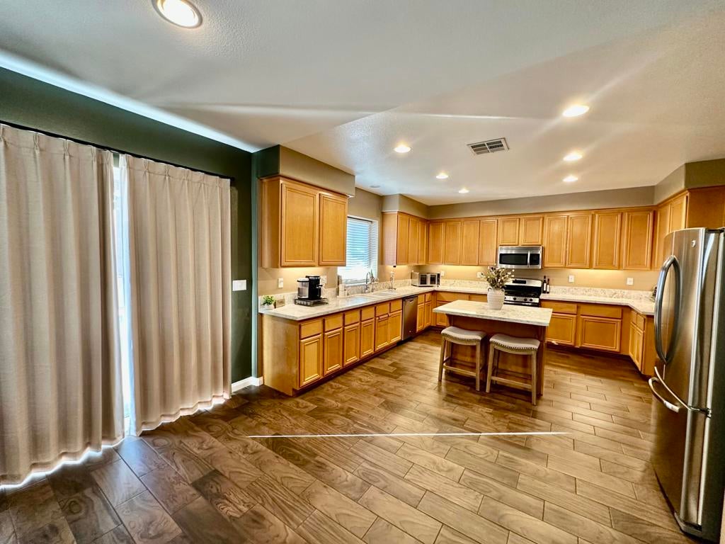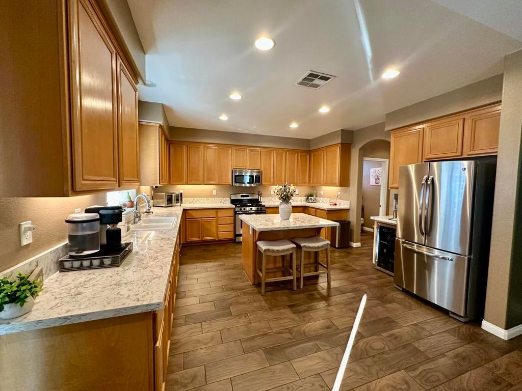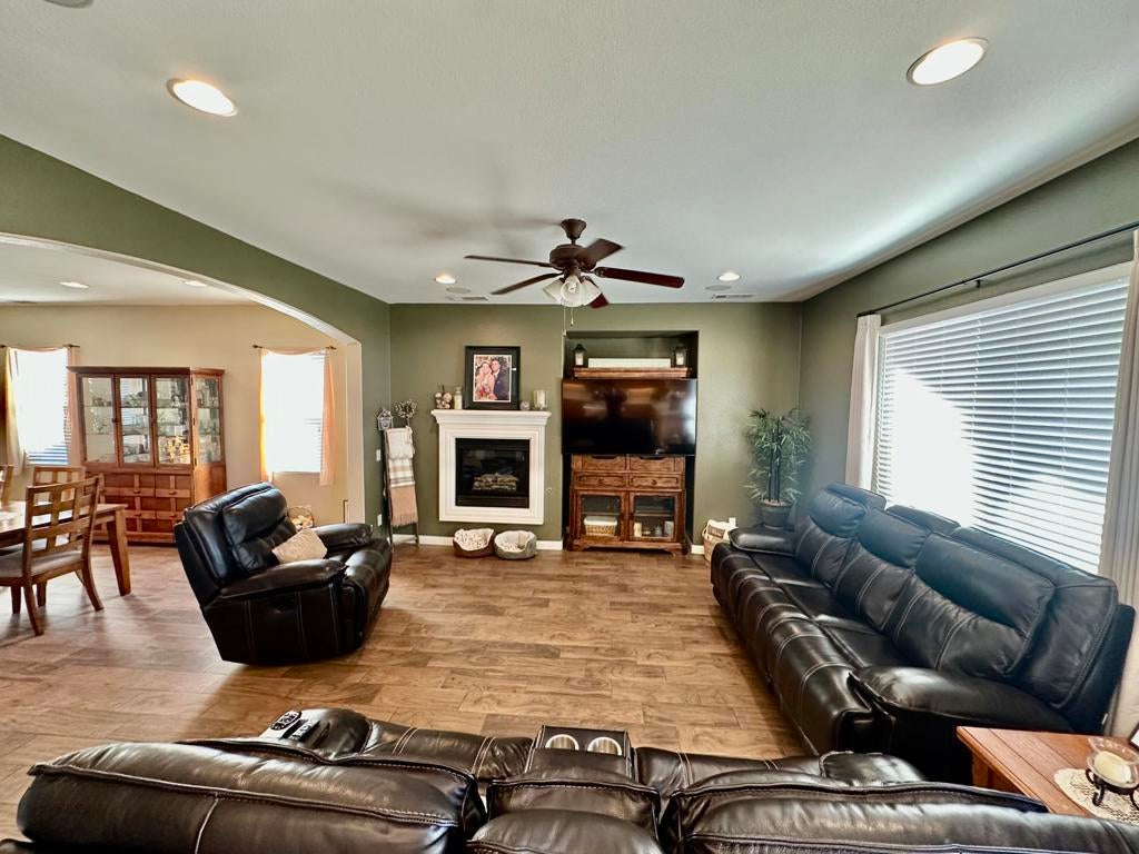 Stunning two-story pool home with RV parking, solar, and entertainer's backyard!This beautifully maintained residence offers the perfect blend of comfort, efficiency, and resort-style outdoor living. The backyard is a true retreat, featuring a 15x30 sparkling pool with raised spa, expansive concrete decking, and a covered patio ideal for entertaining. Enjoy the built-in BBQ island with mini fridge, ceiling fans, and generous space for outdoor dining and gatherings.Inside, the home showcases wood-look tile flooring throughout the downstairs, an open-concept layout, neutral designer tones, and recessed lighting. The updated kitchen is a standout with new quartz countertops, ample cabinetry, a large center island with seating, stainless steel appliances, and a Culligan water softening system with reverse osmosis.The inviting family room includes a cozy fireplace and flows seamlessly into the dining area. Upstairs, the spacious primary suite offers a relaxing retreat with plush carpeting, abundant natural light, and an en-suite bathroom featuring dual sinks, extended vanity space, and a walk-in closet. Secondary bedrooms are generously sized and versatile for guests, home office, or family needs.Additional highlights include leased solar for low summer electric bills, a high-efficiency HVAC system (approximately 2 years old) with variable-speed condenser, a 50-amp power receptacle for RV hookups, indoor laundry with cabinetry, an attached two-car garage, wide driveway with RV/trailer parking, block fencing, and low-maintenance landscaping.This move-in-ready home offers space, upgrades, and functionality rarely found, perfect for entertaining, storing toys, and enjoying year-round outdoor living.