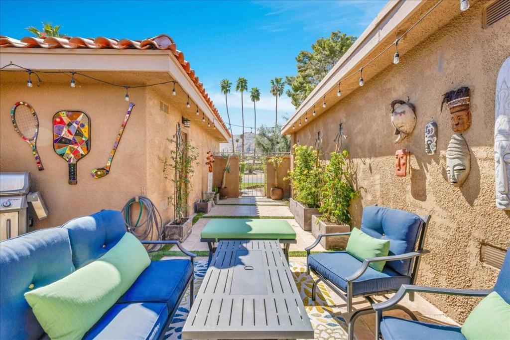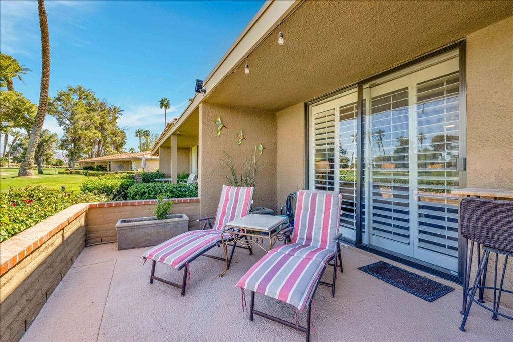 Discover resort-style living at Sunrise Country Club in Rancho Mirage. Panoramic double fairway views overlooking the #18th and #1st. One of only 27-Seville floor plans built. This sought after model features private courtyard patio entry, huge back patio and spacious 2-bed 2-bath layout. Condo features newly upgraded glass front doors for a welcome entry. Updated contemporary decor & finishes including smooth coat ceilings, tile flooring and newer carpet. Relax & enjoy serene greenbelt views. Large living/dining area. Kitchen features stainless appliances, custom wood cabinetry, granite counters & backsplash. Cool passthrough counter to dining area. Built in wet bar. Spacious primary with spa-like bath complete with soaking tub. Ideally located near the clubhouse for convenience and nearby community pool off entry courtyard. Large 2-car garage with additional storage closets. HOA dues include cable, trash & exterior care of unit (including roof). Guard gated community consists of 746-condos; an 18-hole, par 64 golf; 9 championship tennis courts; 10 pickleball courts; 2 bocce ball courts; 21 swimming pools/spas; clubhouse with dining room, lounge, grille, golf/tennis pro shops & fitness/activity center. In the heart of Rancho Mirage--quick jaunt to the nearby River entertainment complex & El Paseo shopping/dining district. This is the IDEAL refreshed condo to call HOME. Stop searching and START living!