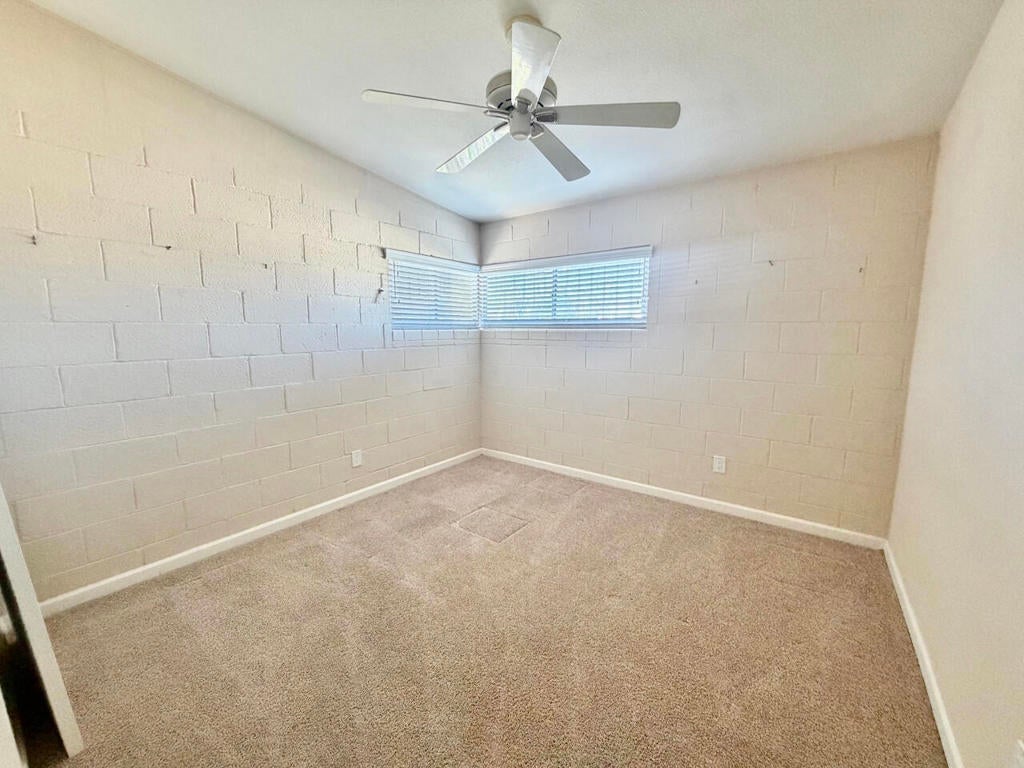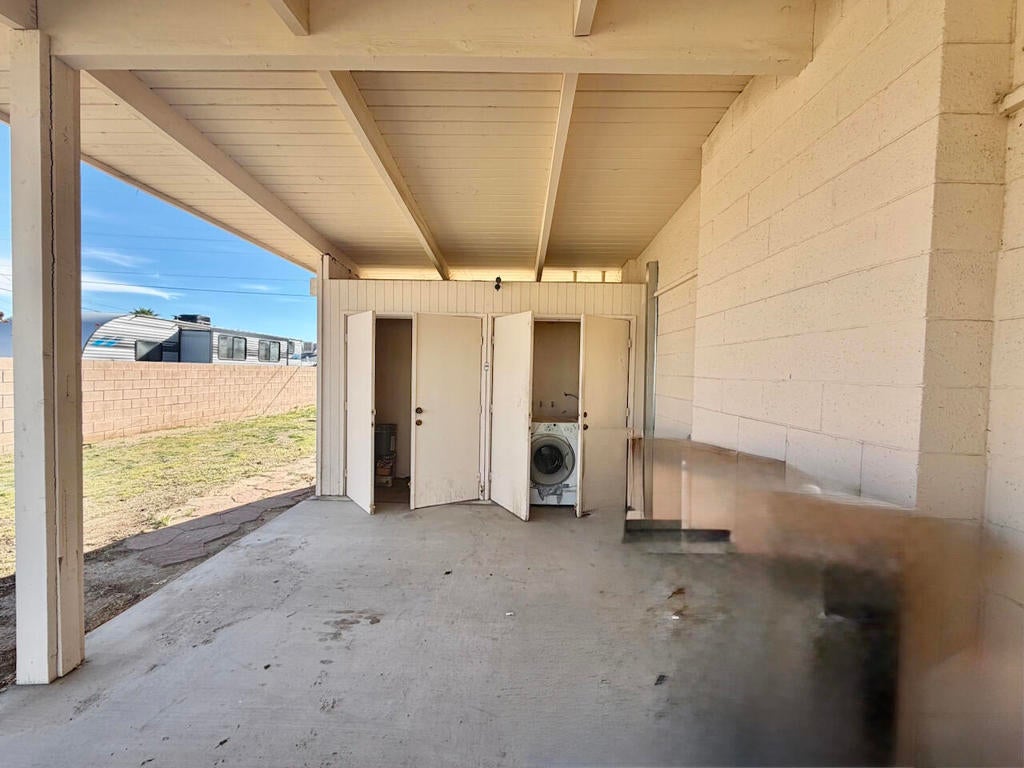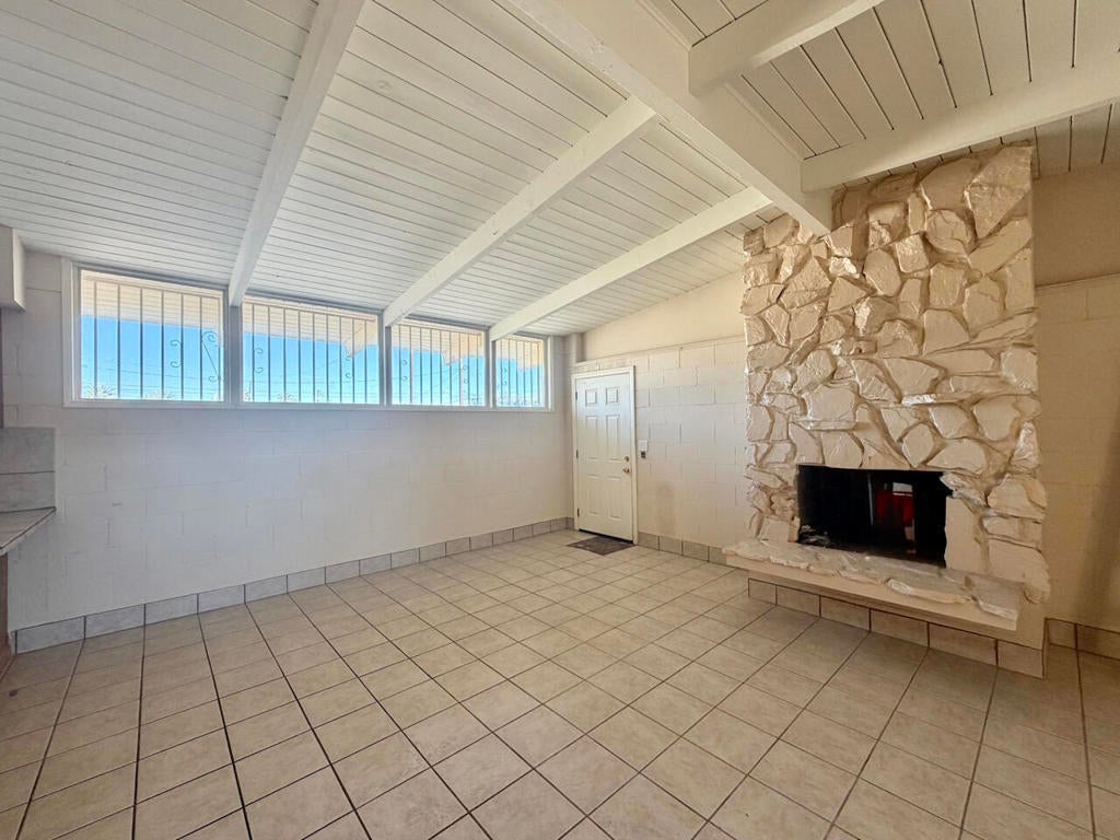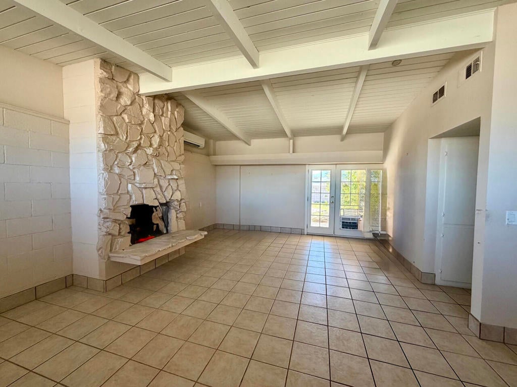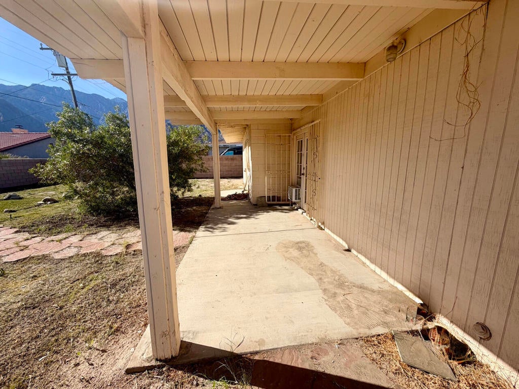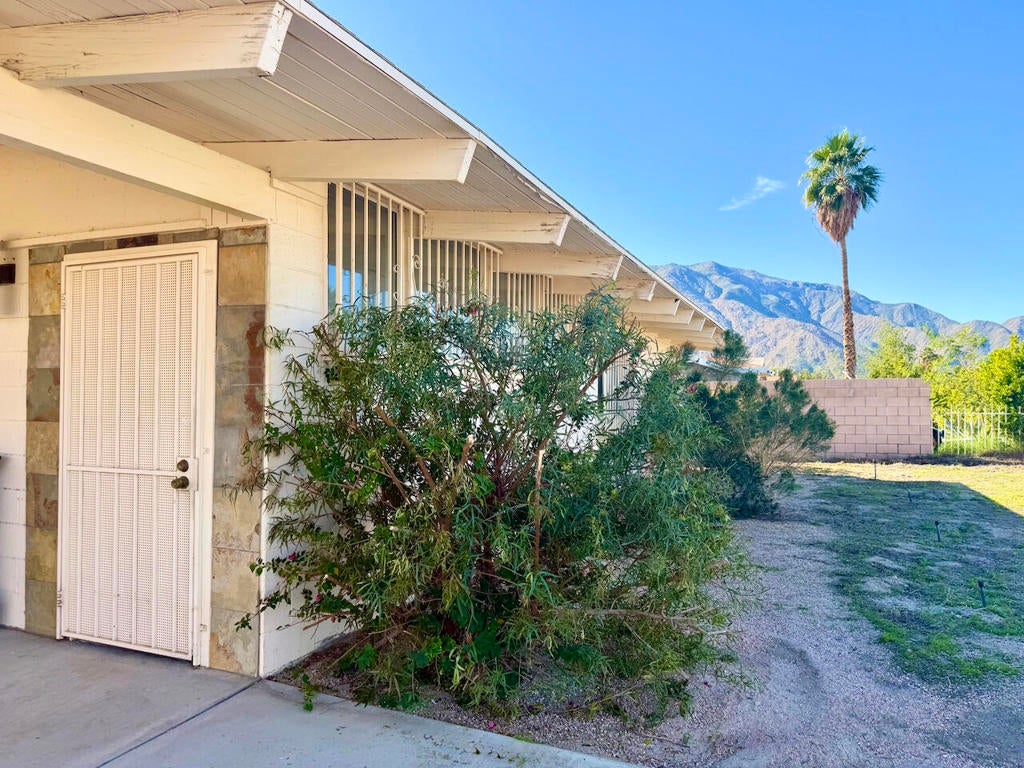 Bring your vision and unlock the potential of this classic mid-century home located in the desirable Desert Highland Gateway area of North Palm Springs. With strong architectural features and a generous lot, this property offers an exceptional value-add opportunity for investors, designers, or buyers seeking a true renovation project. The home features vaulted wood-beamed ceilings, a dramatic floor-to-ceiling rock fireplace, and tiled flooring in the main living areas that reflect its authentic mid-century character. Two bedrooms both offer vaulted ceilings, complemented by a full bathroom. The gated concrete driveway leads to a covered carport with storage and laundry hookups, adding functional convenience. Step outside to a covered rear patio with stunning western mountain views, opening to a large block-walled yard with endless possibilities--ideal for a future pool, ADU, garden retreat, or expansive outdoor entertaining space. The property is equipped with a central HVAC system plus an additional split AC unit in the living room. This is a cash or hard-money only sale. Property is being sold As-Is with no repairs or credits to be made by the seller. A rare opportunity to invest in a no-HOA, fee-land property in North Palm Springs with strong upside potential.
