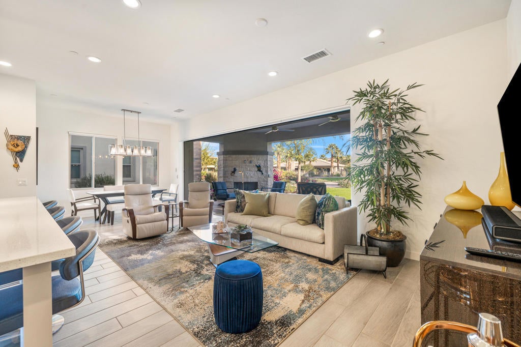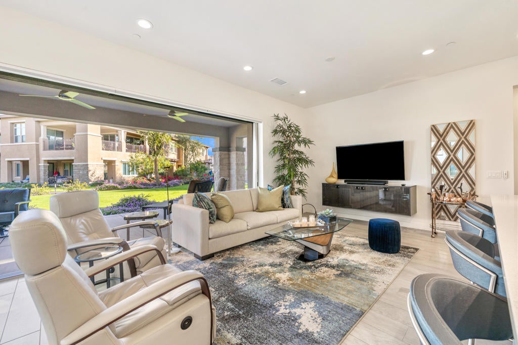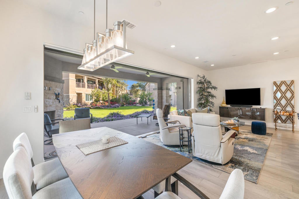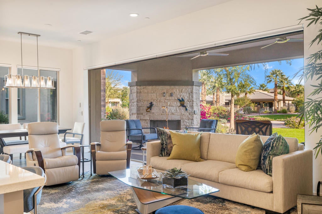 Beautifully upgraded and exquisitely furnished, this contemporary residence in the exclusive gated enclave of The Retreat at Desert Willow offers the ultimate in sophisticated desert living. Ideally located next to Desert Willow Golf Resort and just minutes from the area's finest shopping, dining, and entertainment, this single-level condominium combines modern design, comfort, and convenience in one seamless experience.A true celebration of indoor/outdoor living, the home features an expansive covered patio with a cozy fireplace--perfect for relaxed evenings or entertaining guests. Dramatic sliding glass doors connect the patio to the stylish great room, where high ceilings, designer lighting, and sleek tile flooring create a bright and inviting ambiance.The open-concept living space includes a chic bar and a gourmet kitchen appointed with quartz countertops, white Shaker cabinetry, a spacious pantry, and top-of-the-line Bosch stainless steel appliances. A large island with seating and a stunning tile backsplash complete this entertainer's dream setting.The luxurious primary suite offers direct patio access and a spa-inspired bathroom featuring dual vanities, a soaking tub, a separate glass-enclosed shower, and an oversized walk-in closet. A beautifully furnished guest suite and a versatile den--ideal for a home office or relaxation lounge--enhance the home's livability.Additional highlights include a generous laundry room with built-in cabinetry and sink, an attached two-car garage with direct access, and a private gated courtyard entry.Perfect as a seasonal escape or an extended stay retreat, this impeccably designed home embodies the essence of luxury desert living--steps from world-class golf and moments from the best the valley has to offer.