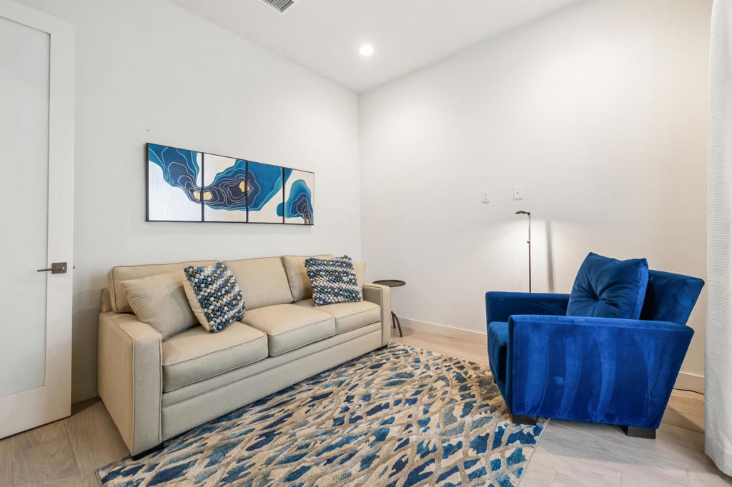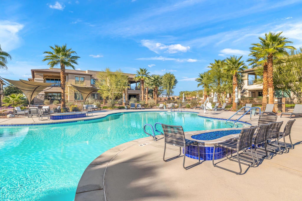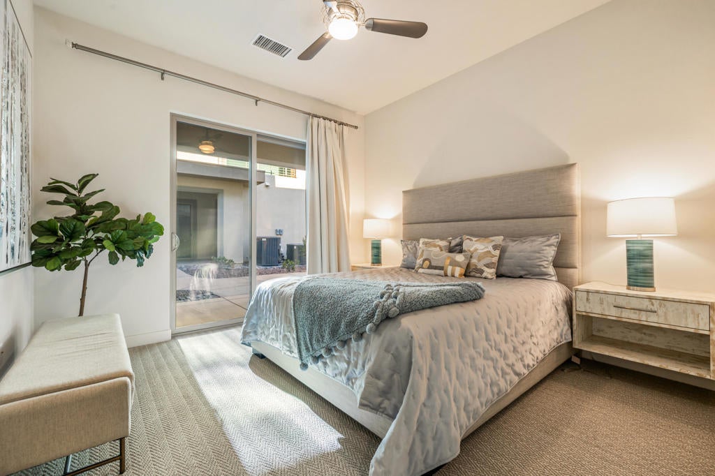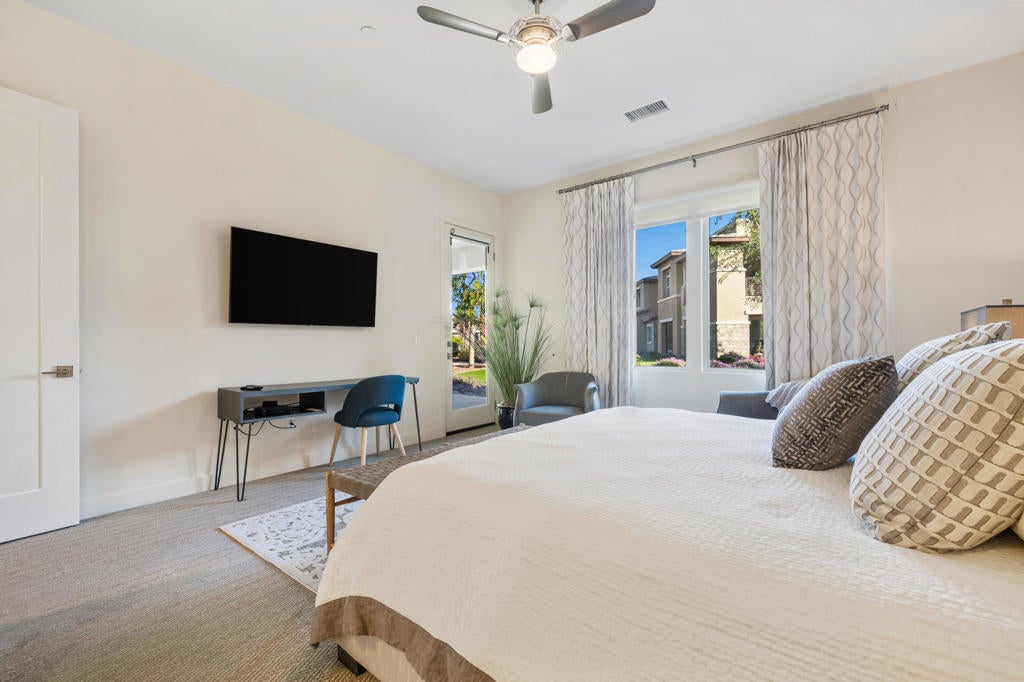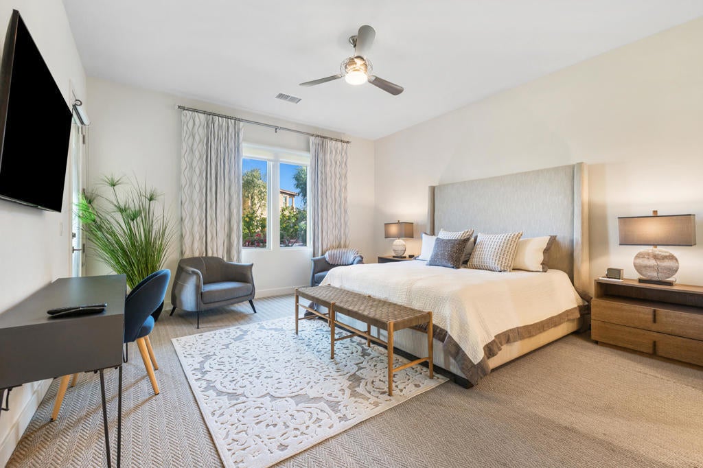 Beautifully upgraded and exquisitely furnished, this contemporary residence in the exclusive gated enclave of The Retreat at Desert Willow offers the ultimate in sophisticated desert living. Ideally located next to Desert Willow Golf Resort and just minutes from the area's finest shopping, dining, and entertainment, this single-level condominium combines modern design, comfort, and convenience in one seamless experience.A true celebration of indoor/outdoor living, the home features an expansive covered patio with a cozy fireplace--perfect for relaxed evenings or entertaining guests. Dramatic sliding glass doors connect the patio to the stylish great room, where high ceilings, designer lighting, and sleek tile flooring create a bright and inviting ambiance.The open-concept living space includes a chic bar and a gourmet kitchen appointed with quartz countertops, white Shaker cabinetry, a spacious pantry, and top-of-the-line Bosch stainless steel appliances. A large island with seating and a stunning tile backsplash complete this entertainer's dream setting.The luxurious primary suite offers direct patio access and a spa-inspired bathroom featuring dual vanities, a soaking tub, a separate glass-enclosed shower, and an oversized walk-in closet. A beautifully furnished guest suite and a versatile den--ideal for a home office or relaxation lounge--enhance the home's livability.Additional highlights include a generous laundry room with built-in cabinetry and sink, an attached two-car garage with direct access, and a private gated courtyard entry.Perfect as a seasonal escape or an extended stay retreat, this impeccably designed home embodies the essence of luxury desert living--steps from world-class golf and moments from the best the valley has to offer.