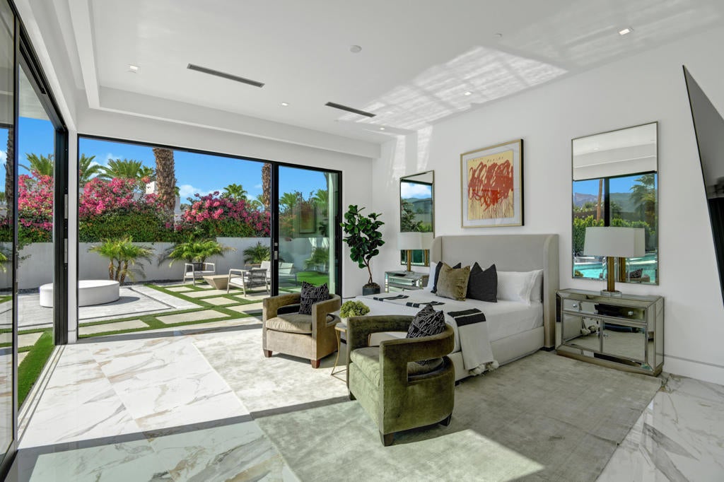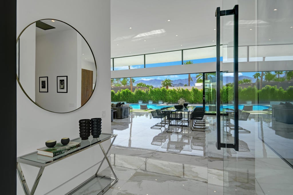 Welcome to Bravo 7, located in the heart of Tamarisk, in Rancho Mirage. This private enclave of seven curated luxury homes by architect James M. McEachern is now hitting the market for the first time. This luxury residence at Bravo 3 boasts an oversized pool with two tiled Baja shelves and a step-down bar area with a fire pit. Upon entering through the pivoting glass door, you will be greeted by an impressive interior featuring soaring ceilings, fold-away glass doors, imported polished marble from Spain, and sleek custom cabinetry imported from Germany. The bathrooms and kitchen are adorned with high-quality Hansgrohe fixtures. The spacious great room, complete with a linear fireplace, is perfect for hosting grand-scale gatherings and seamlessly connects to the kitchen, backyard, and pool area. The estate offers 5 ensuite bedrooms and 5.5 baths, equipped with Fleetwood doors and windows, Miele appliances, smart-home lighting and communication systems, and luxurious Italian cabinetry in the primary suite's walk-in closets. Other notable features include illuminated bath mirrors, solar power, and a 3-car garage with epoxy flooring. This prestigious residential collection is conveniently located near The Ritz-Carlton Resort & Spa, Sunnylands, Palm Springs International Airport, luxury shopping, and fine dining.