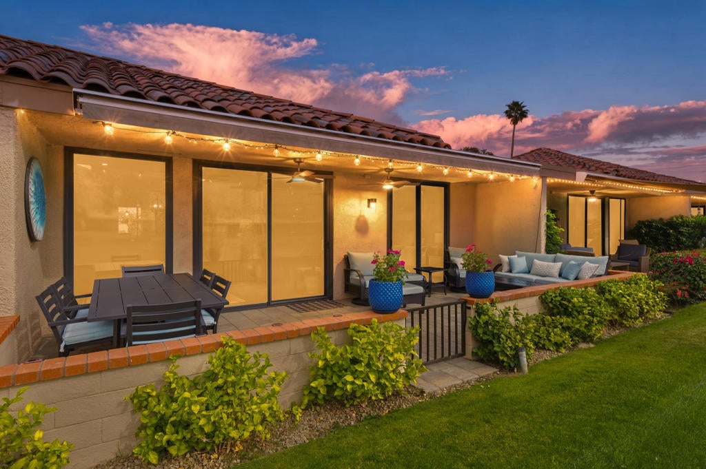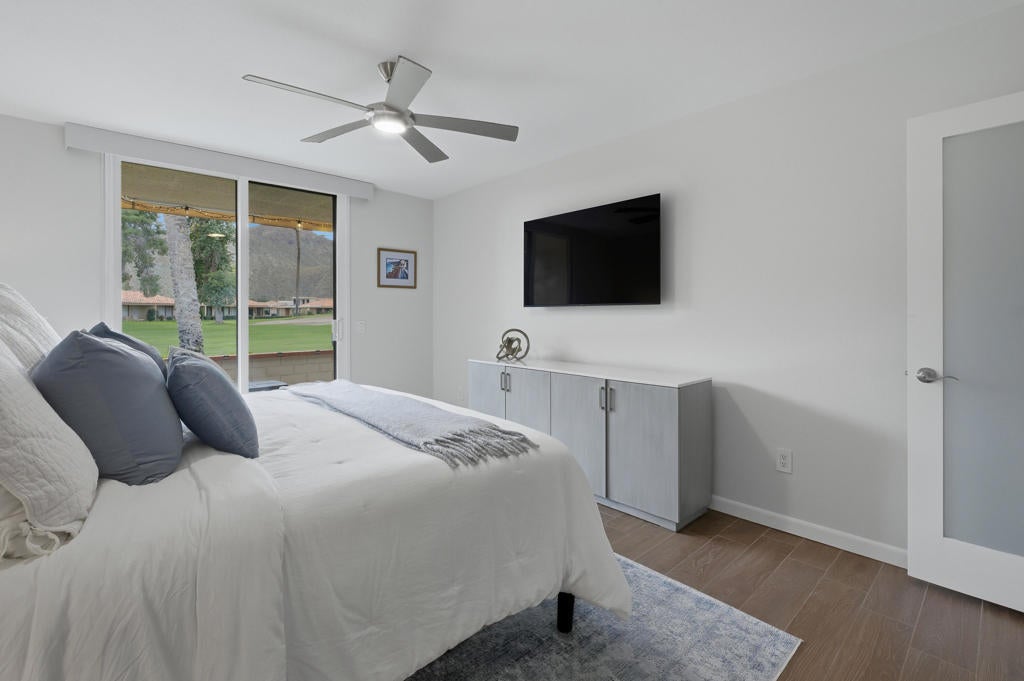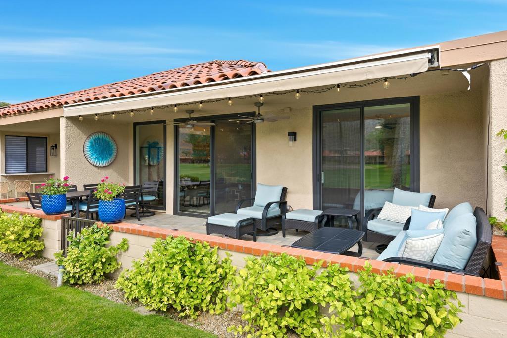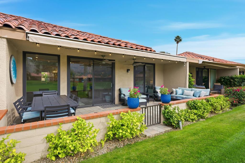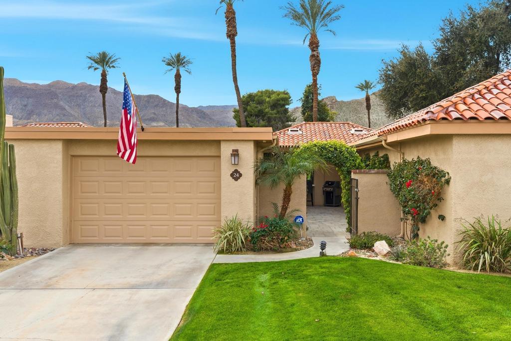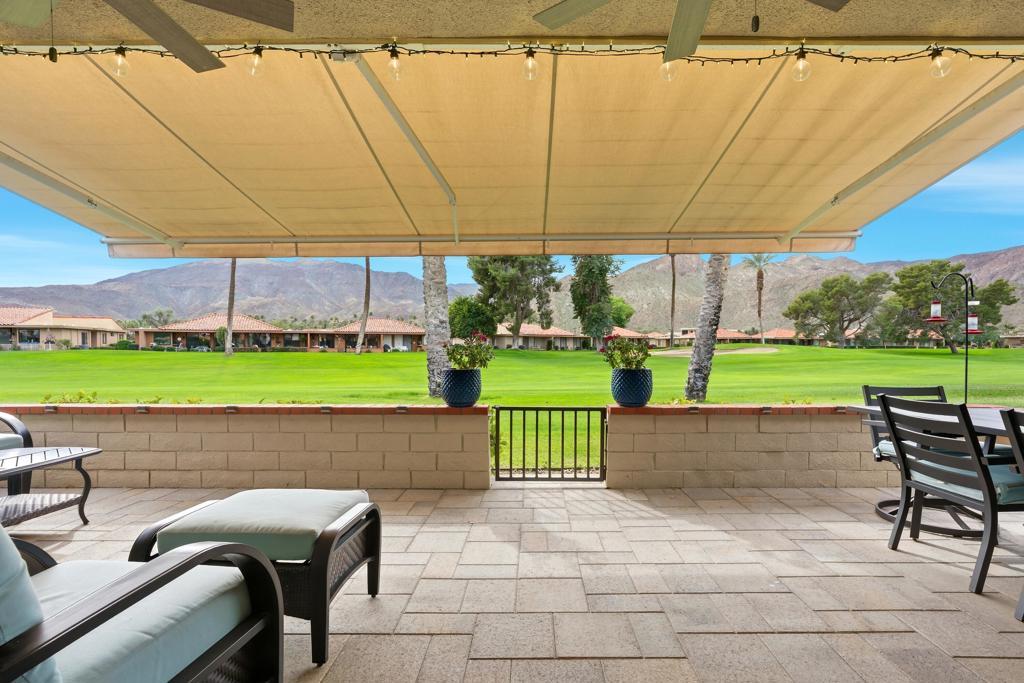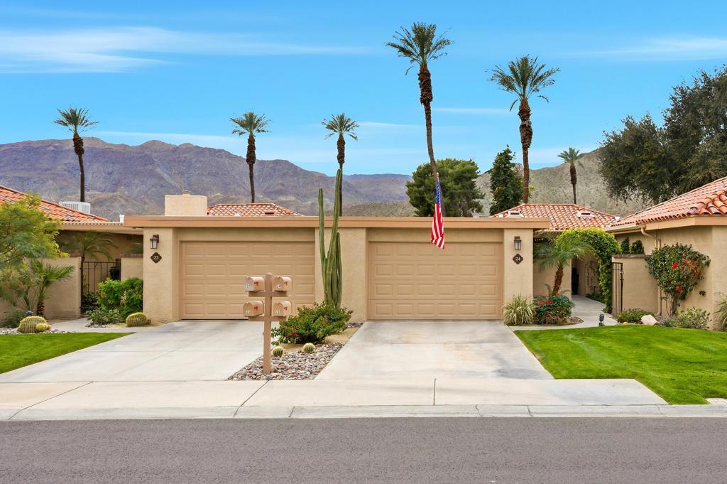 A Bright Updated Granada Plan in Sunrise CC with beautiful southwest facing mountain and golf course views. Walk thru the front gate into a peaceful courtyard perfect for the private outdoor living and dining. The large living/dining area expands your view to the back patio and beyond to stunning mountain views. This 2bd/2bath condo is Beautifully decorated with luxury wood look tile floors, New heat & air system, remote control window coverings, new front & back pavers, back wall, patio awnings, epoxy garage floor. Enjoy your morning coffee or evening glass of wine on the expansive back patio that opens directly onto the golf course, offering wide fairway views framed by the majestic San Jacinto Mountains. The detached garage adds to the convenience, while the private front courtyard provides an additional peaceful outdoor space to unwind. Sunrise Country Club is a private, gated community known for its vibrant lifestyle and full suite of amenities. Residents have access to multiple pools and spas, a beautifully appointed clubhouse with a fitness center and billiards room, a full-service restaurant, a casual bar, and a poolside grille. The community also offers tennis courts, pickleball, bocce ball, and a calendar full of social events that make it easy to stay active and connected. With 24-hour security, beautifully maintained grounds, and a central Rancho Mirage location close to shopping, dining, and entertainment, this condo offers the perfect combination of comfort, style, and community.