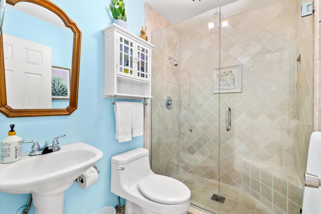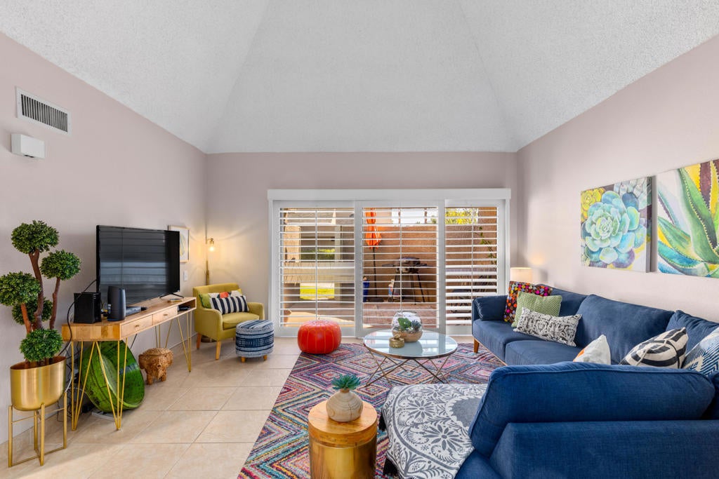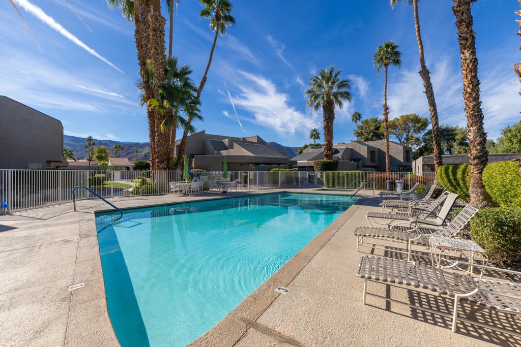 Beautifully updated 2bd & 2bath turnkey condo located in Desert Village in the heart of Rancho Mirage. Walking distance to The River, outdoor mall, and the Omni Rancho Las Palmas Resort & Spa. As you enter the home and walk into the room your eyes are drawn to the vaulted ceiling with a pretty piece of stained glass. The open floorplan creates a comfortable space that offers designer curated furnishings and planation shutters. The kitchen comes equipped with custom cabinetry and stainless steel appliances. The primary bedroom has an ensuite bath that has a double vanity and custom tiled shower. The guest bedroom is steps away from the adjacent full guest bath. It also has exclusive access to an outdoor patio area. The private patio off of the living area has mountain views and is the perfect spot to relax and enjoy the beautiful desert weather. The community features 3 pools, 2 spas, clubhouse, tennis court, all just a short walk from your home. Start enjoying your desert lifestyle today!