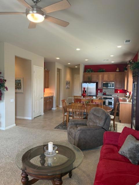 Indio, Sun City Shadow Hills- Serrente Model - Turnkey Furnished -ANNUAL LEASE TERM. This attractive 2 bedim 2 bath home features a Great Room with smart TV, Den with sleeper sofa. Beautiful kitchen w/granite slab counters, Refrigerator, Breakfast bar & Dining Area. Gas range, convection oven & Microwave. Primary Bedroom with TV. Attached private bath with dual sinks and walk-in shower. Guest Bedroom with guest bath with shower/tub. Laundry room with washer & dryer. 2 Car attached garage. Covered patio with view of the South/West Mountains. Very well maintained . Sun City Shadow Hills is an active adult community offering two clubhouses with state of the art fitness centers, indoor/outdoor pools, bocce courts, billiards, lighted sports courts, two golf courses, restaurant plus numerous club and social activities. Age restricted community - occupants must be 55 yrs old. Owner will not remove furnishings. Call for details.